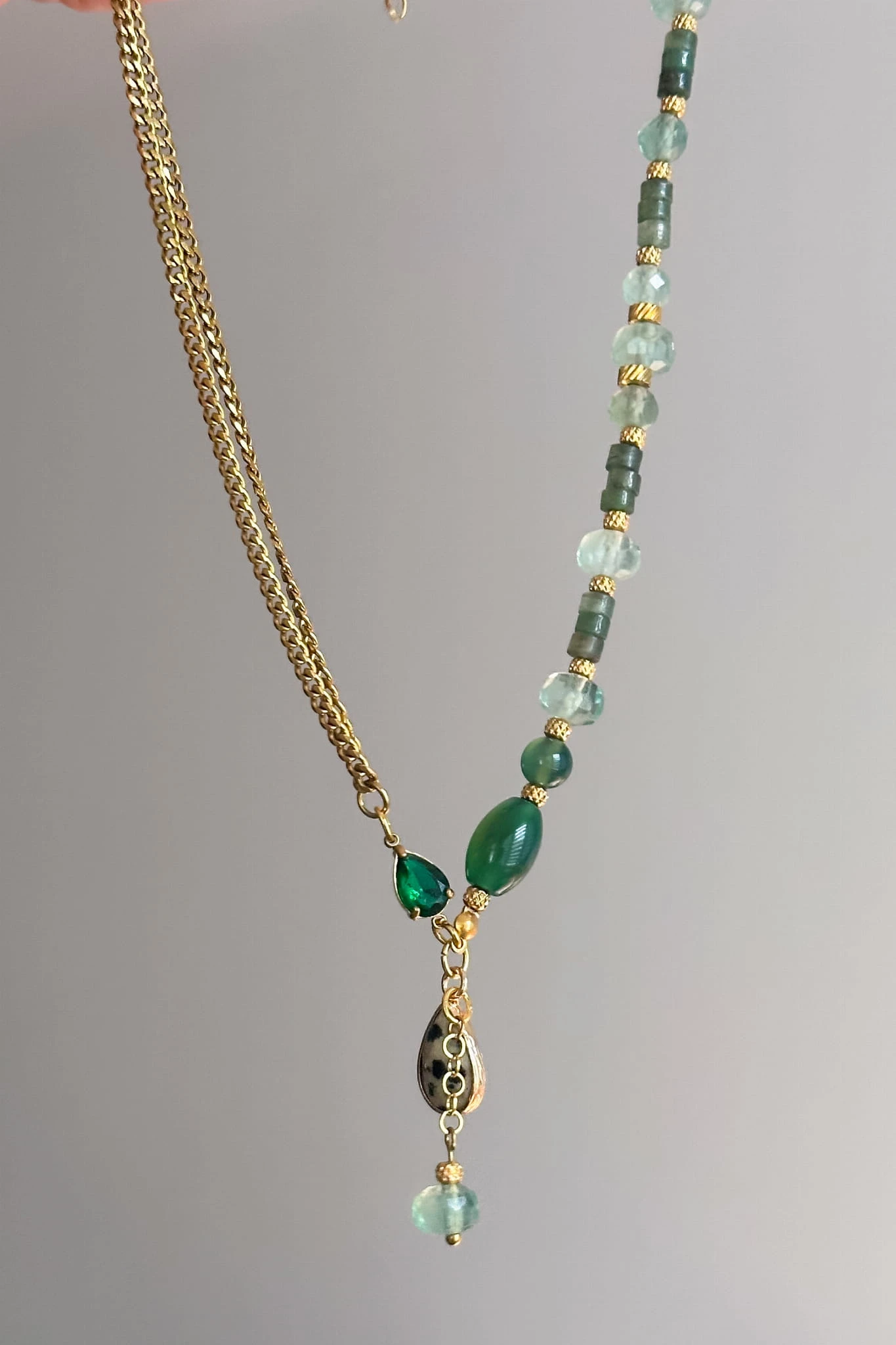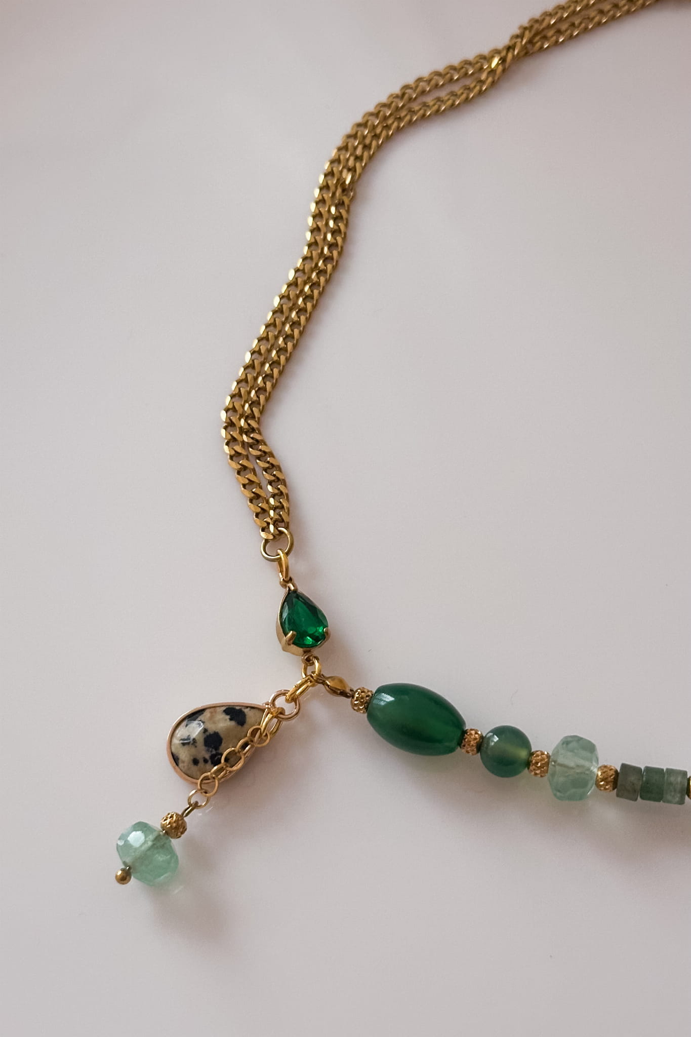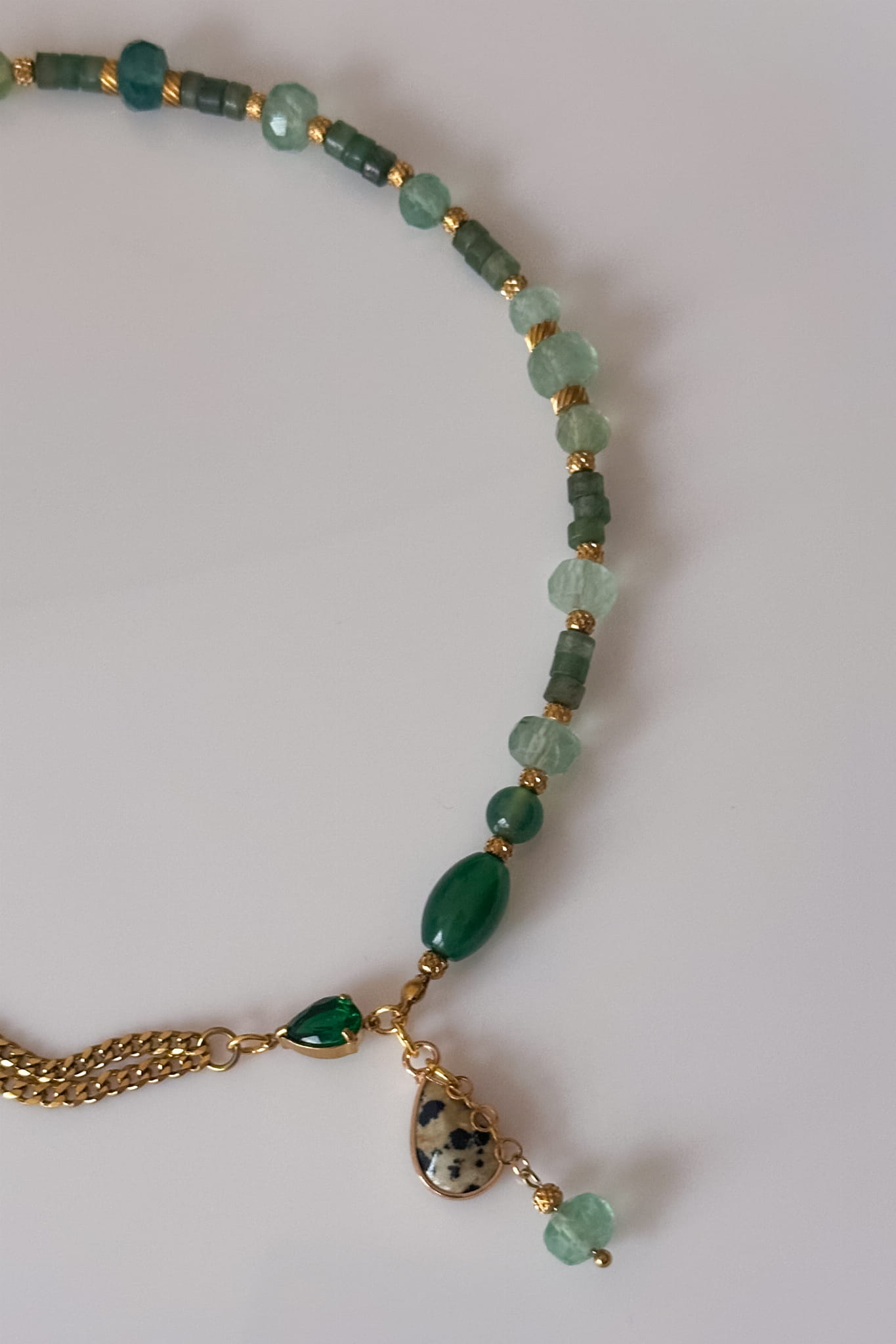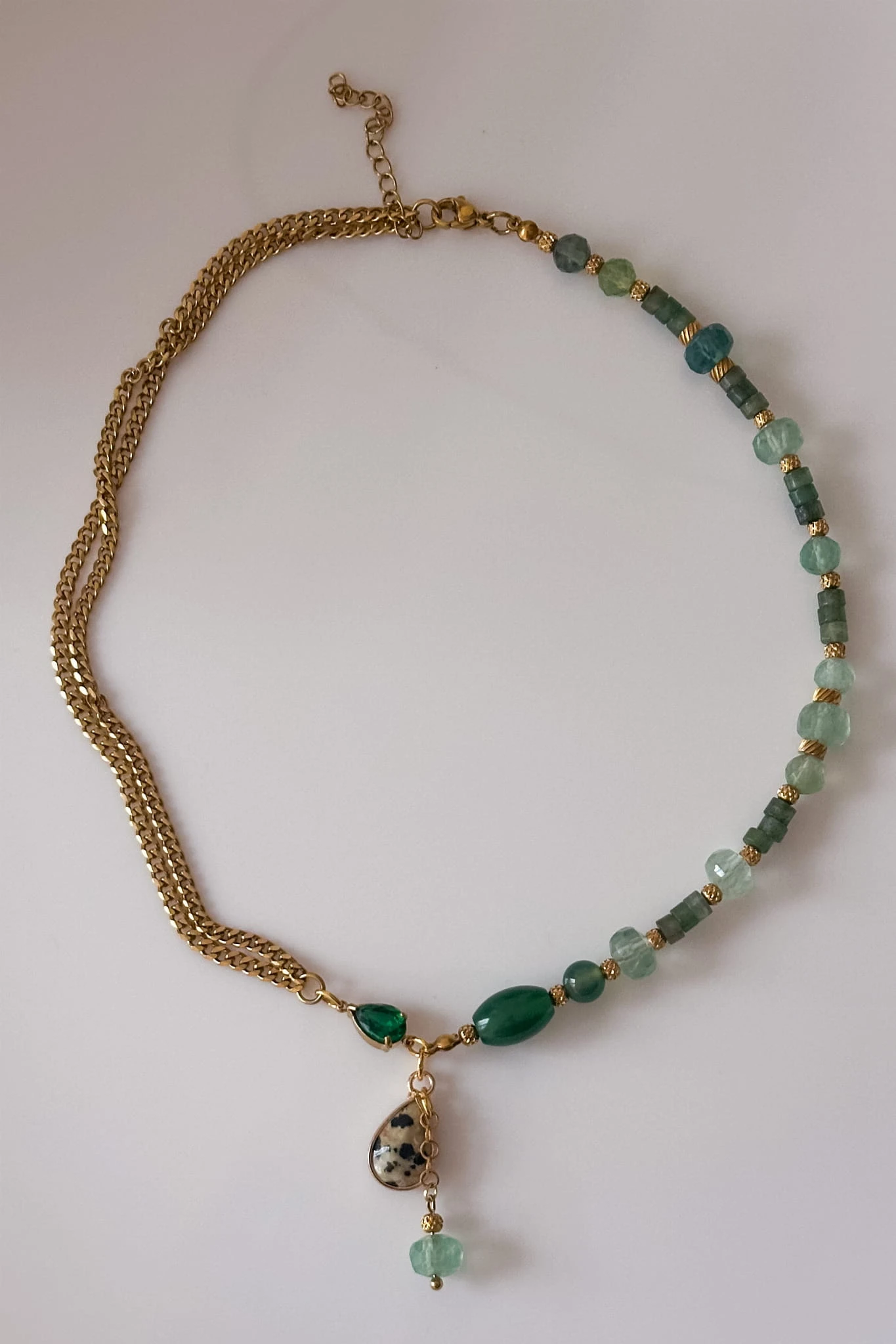 Lekki, świeży i z klasą — Zielony Elegancik to naszyjnik, który przyciąga spojrzenia subtelnym blaskiem zieleni. Połączenie trzech kamieni: fluorytu, awenturynu i jaspisu dalmatyńskiego tworzy harmonijną całość – elegancję natury w nowoczesnej formie.