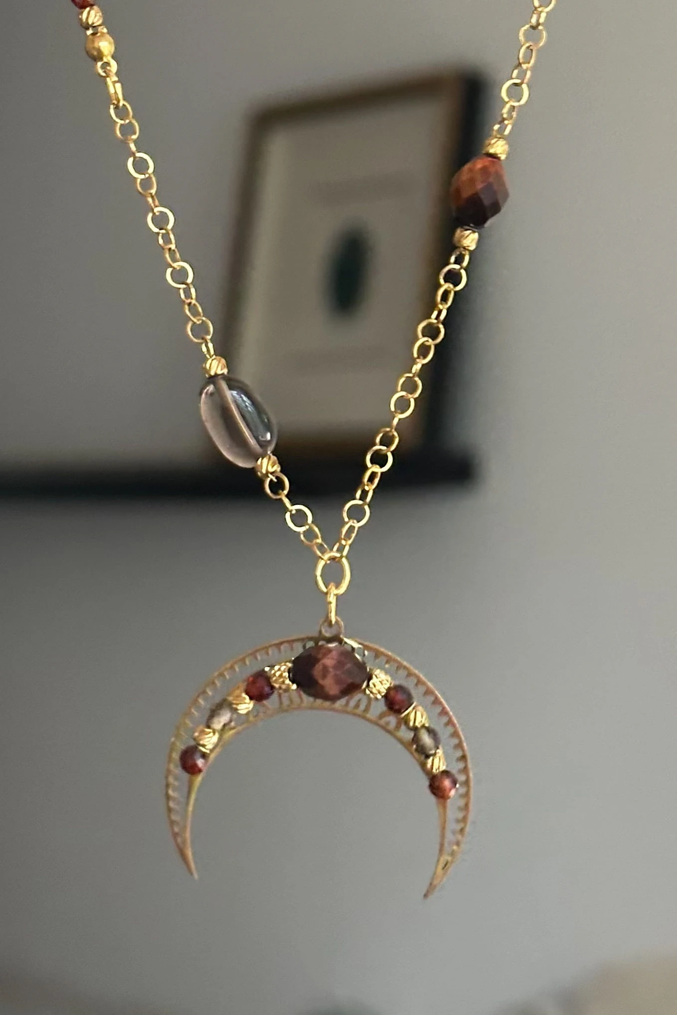 107 Unikat jesienna lunula naszyjnik z księżycem, tygrysie oko, kwarc dymny, agat