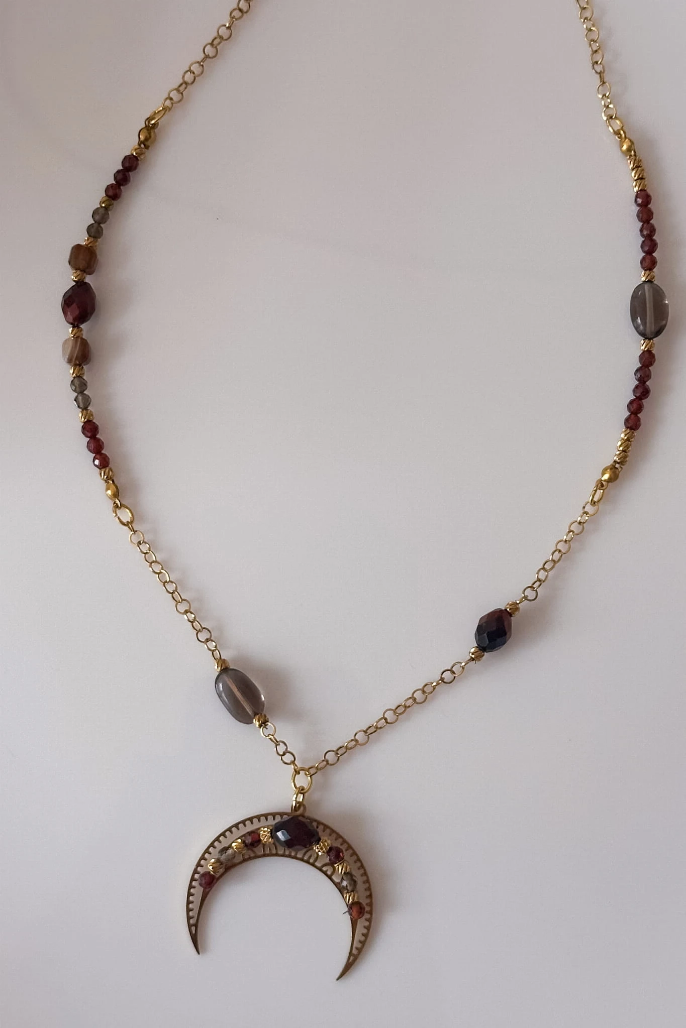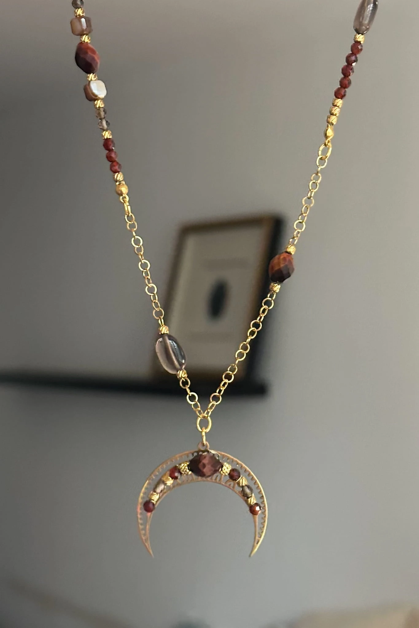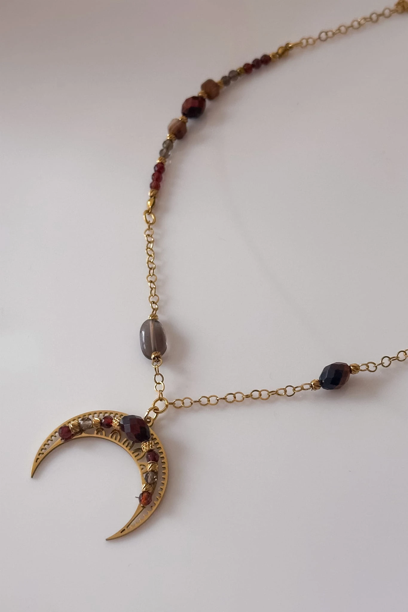 Ciepły jak promień jesiennego słońca i tajemniczy jak nocne niebo. Jesienna Lunula to talizman równowagi — łączy w sobie złoto, brązy i bursztynowe odcienie kamieni, tworząc naszyjnik, który otula i dodaje spokoju.