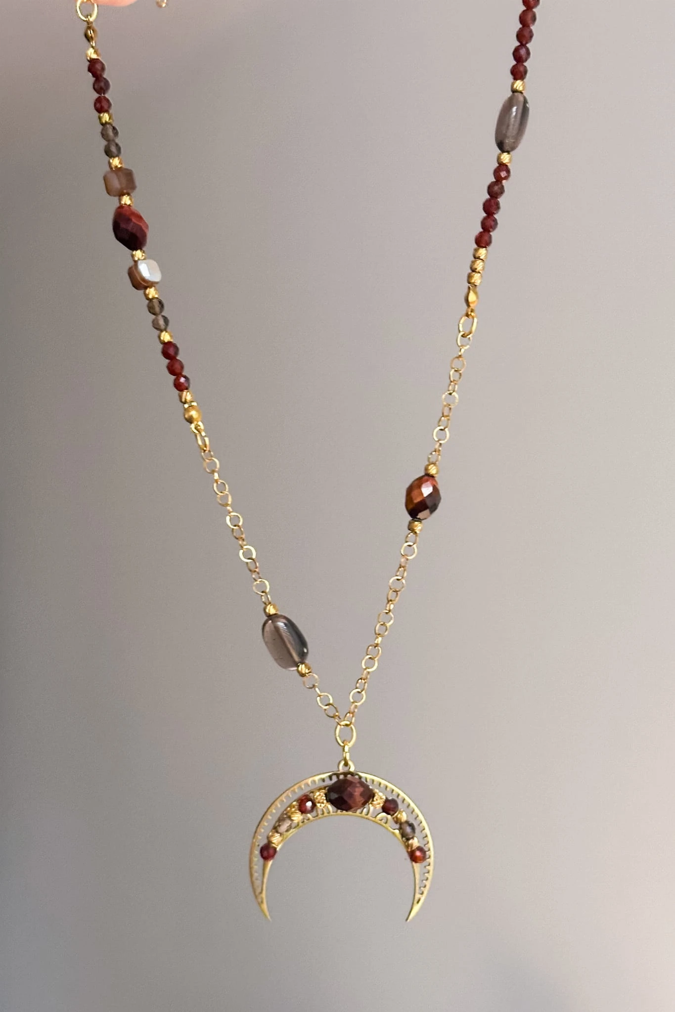 Jesienna Lunula to naszyjnik, który otula ciepłem i spokojem. Połączenie tygrysiego oka, agatu i kwarcu dymnego tworzy talizman odwagi, równowagi i harmonii.