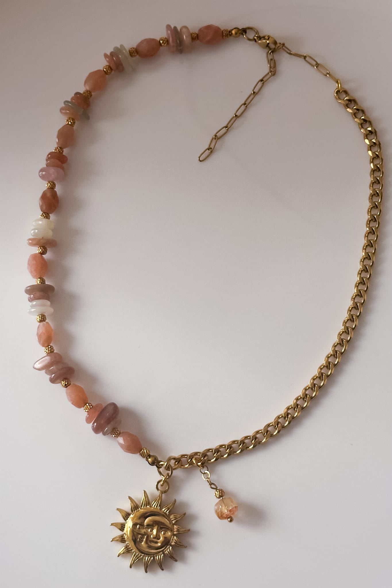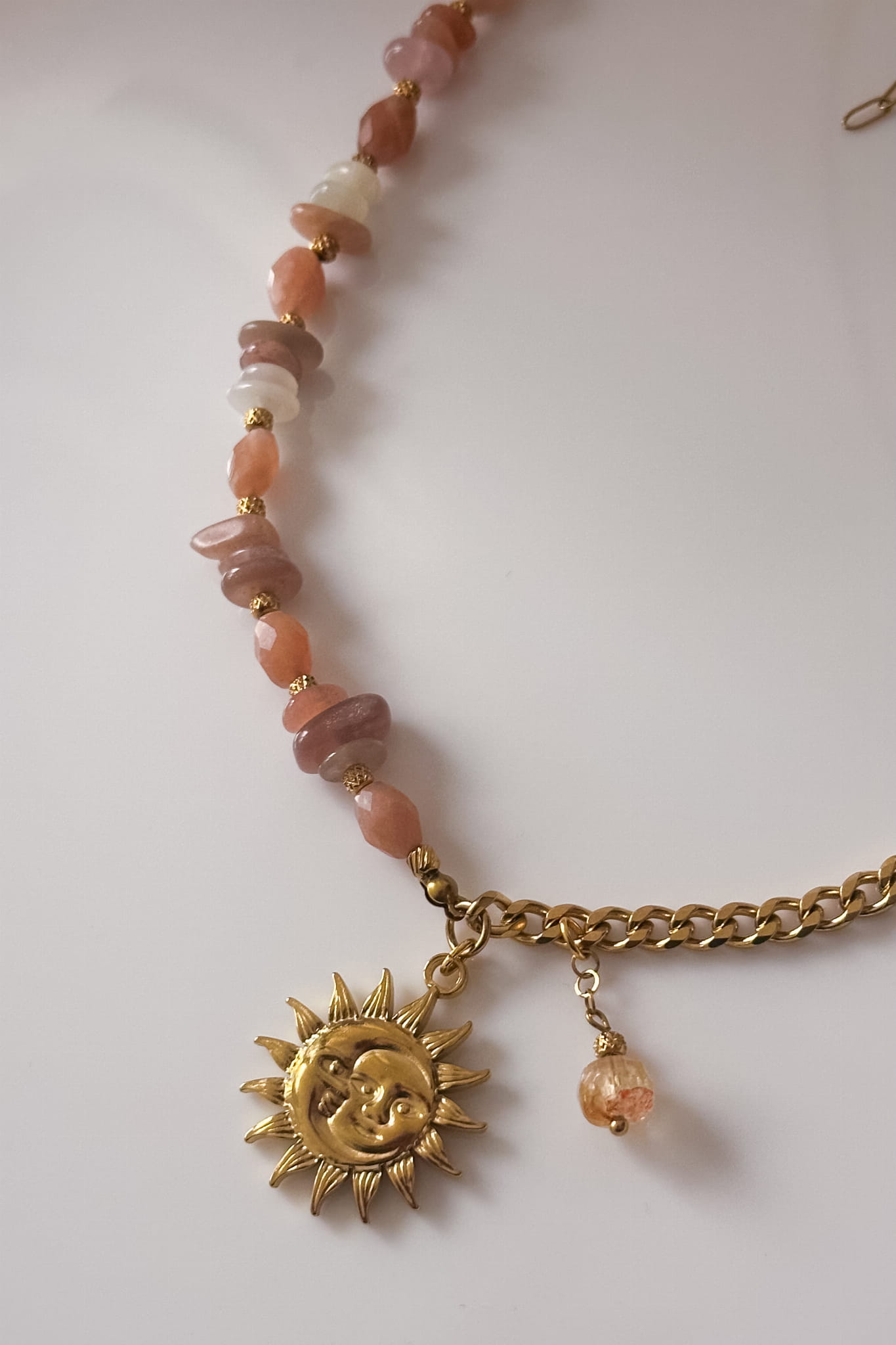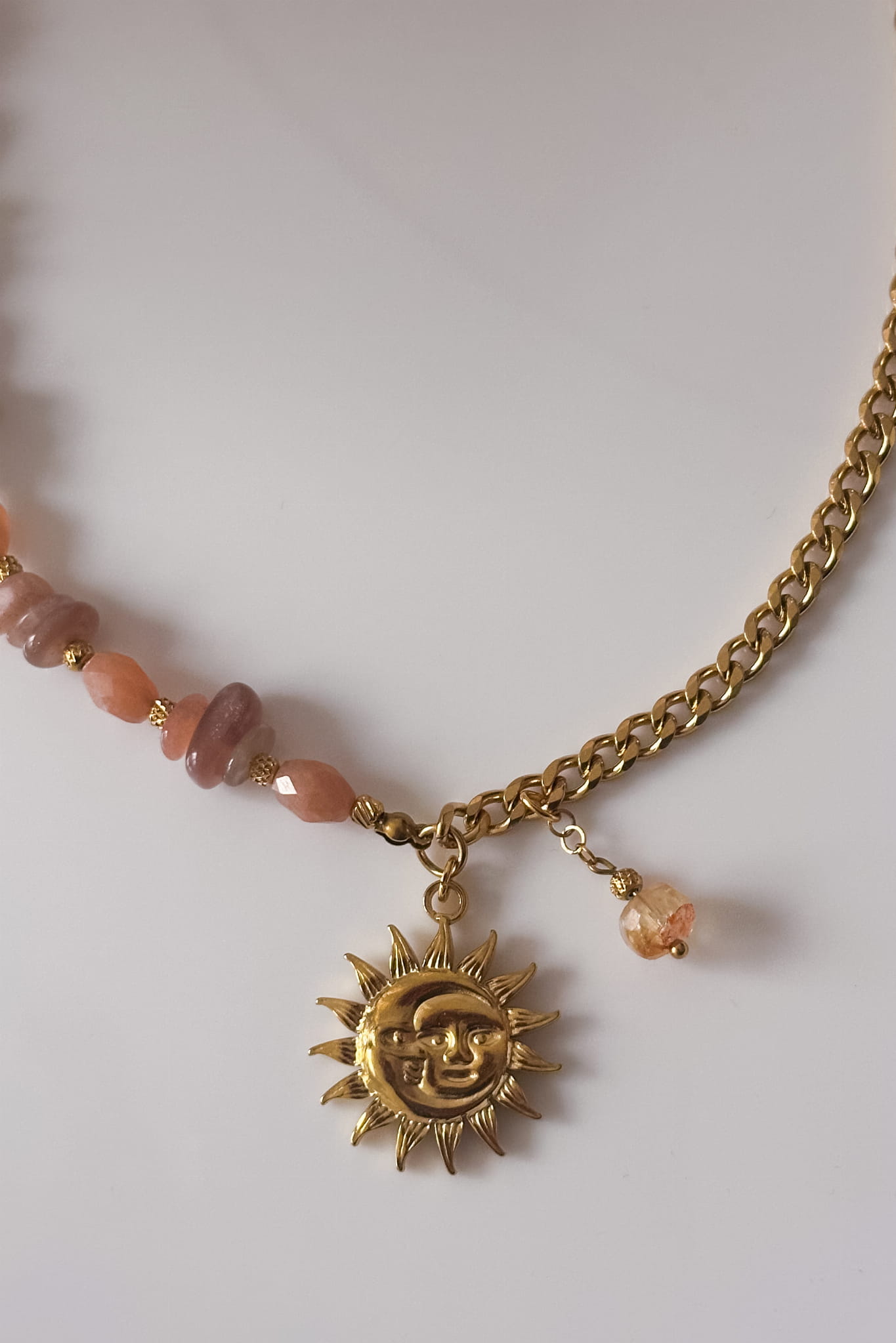 Naszyjnik, który łączy ciepło słońca i lekkość letnich poranków. Z jednej strony delikatne kamienie słoneczne mienią się w odcieniach brzoskwini i złota, z drugiej – mocniejszy akcent łańcucha ze stali szlachetnej symbolizuje siłę i pewność siebie. W centrum – złota zawieszka słońca z maleńkim cytrynem, który przyciąga dobre wibracje i obfitość.