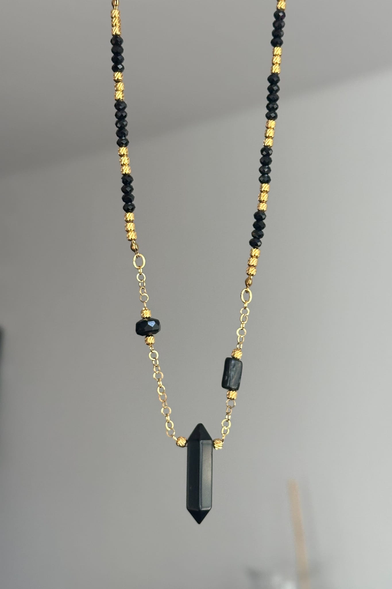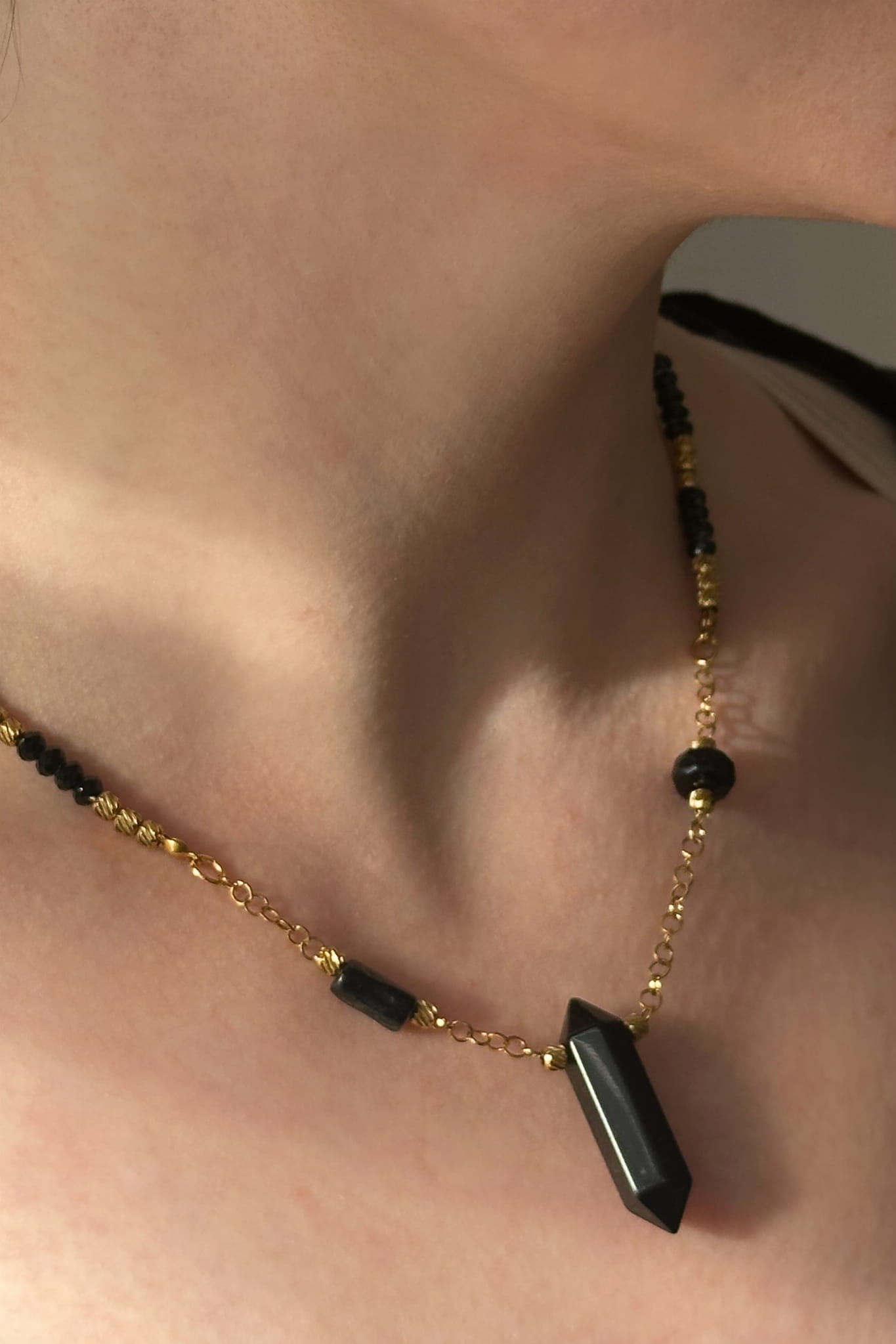 Ten naszyjnik to połączenie czterech kamieni o potężnej energii ochronnej — onyksu, obsydianu, czarnego turmalinu i spinelu. Ich głęboka czerń nie jest mrokiem, lecz siłą, spokojem i odwagą. To biżuteria dla kobiet, które nie boją się wyróżniać — pewnych siebie, świadomych swojej mocy i piękna ukrytego w prostocie.