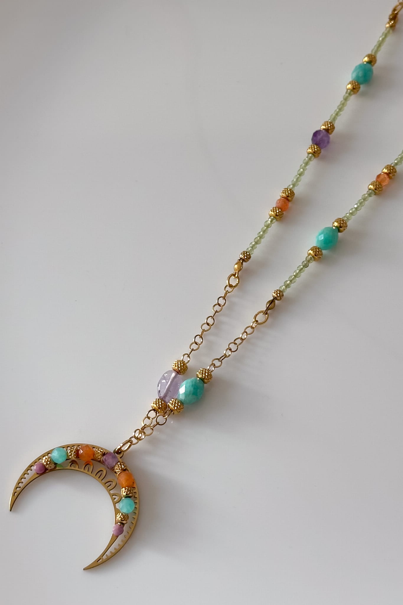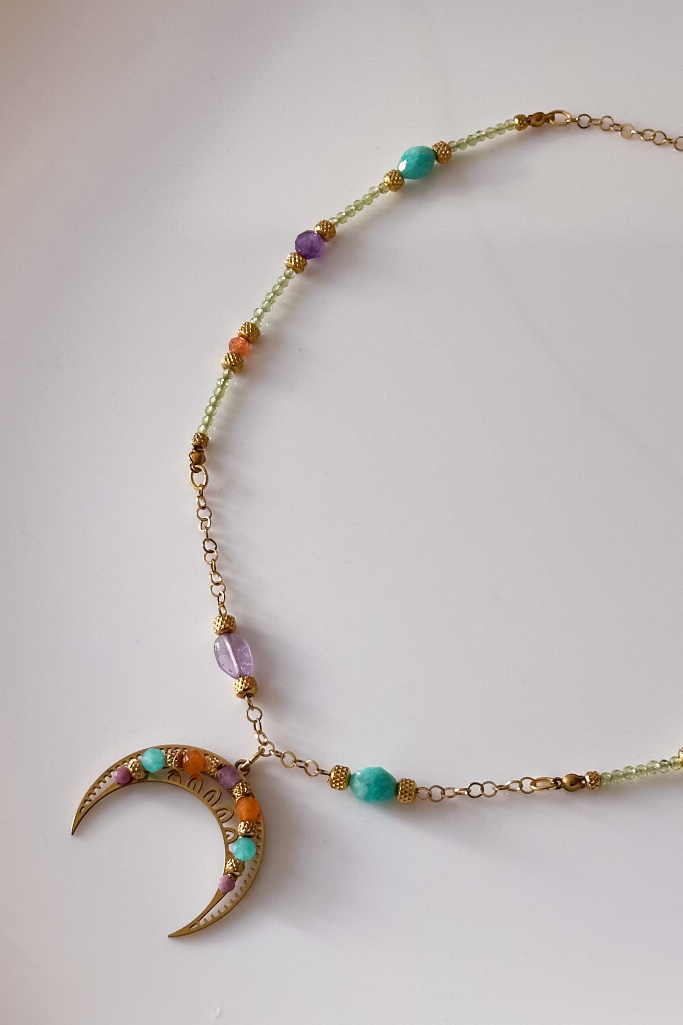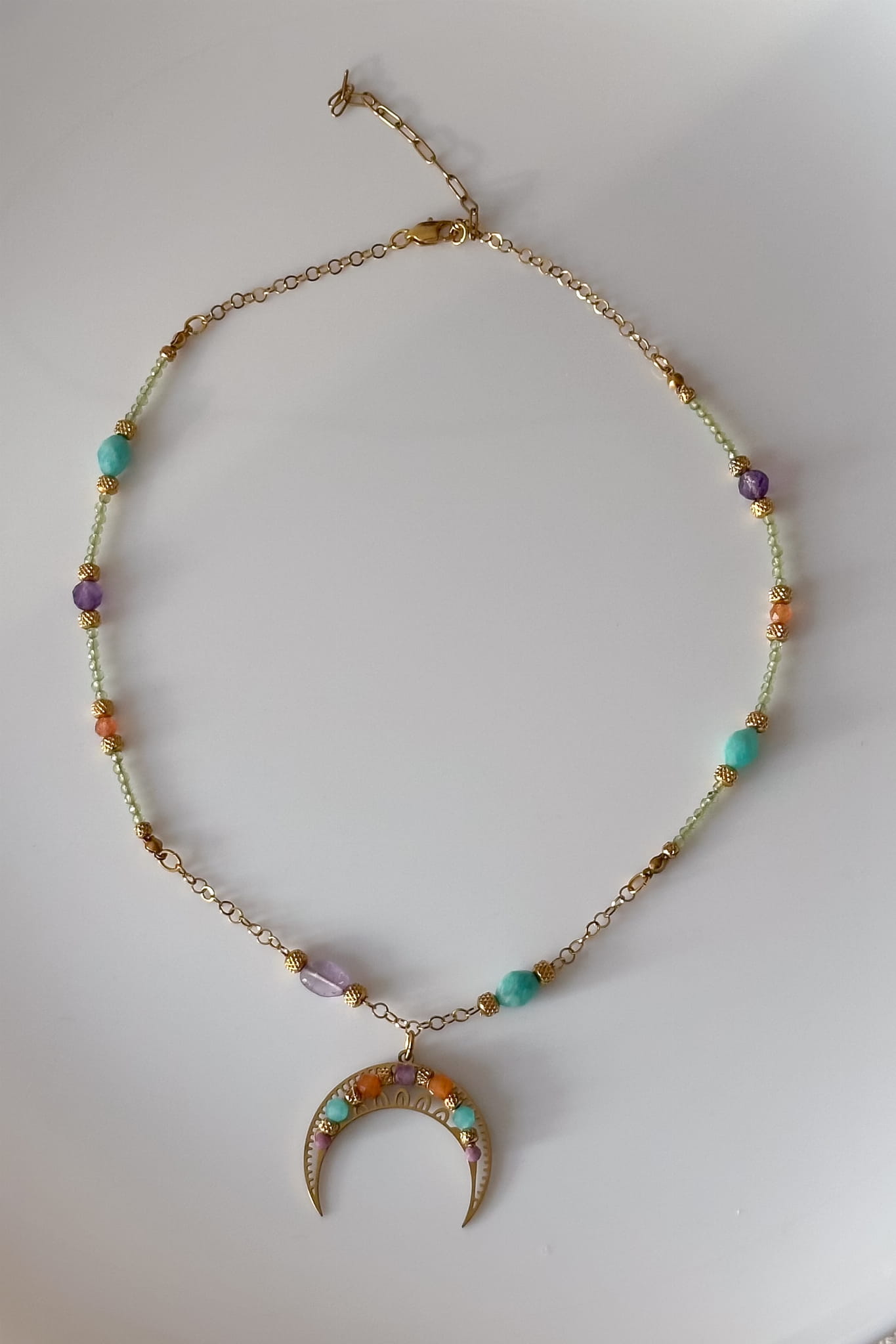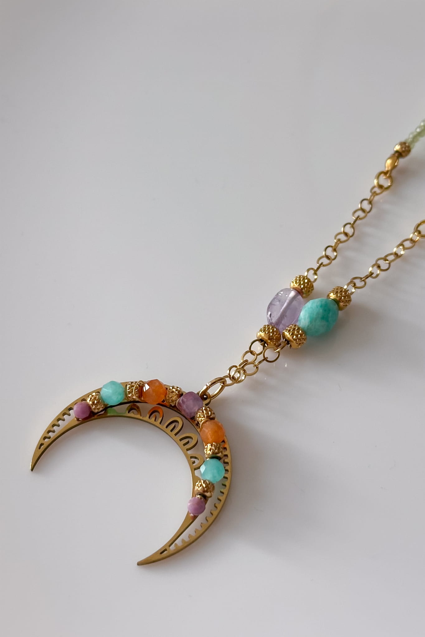 Unikatowy naszyjnik z lunulą zdobioną naturalnymi kamieniami (amazonit, awenturyn pomarańczowy, różowy turmalin, ametyst, oliwin). Długość 45 cm + 7 cm przedłużki. Symbol spokoju, radości i lekkości. Stal 316L. Jeden egzemplarz.