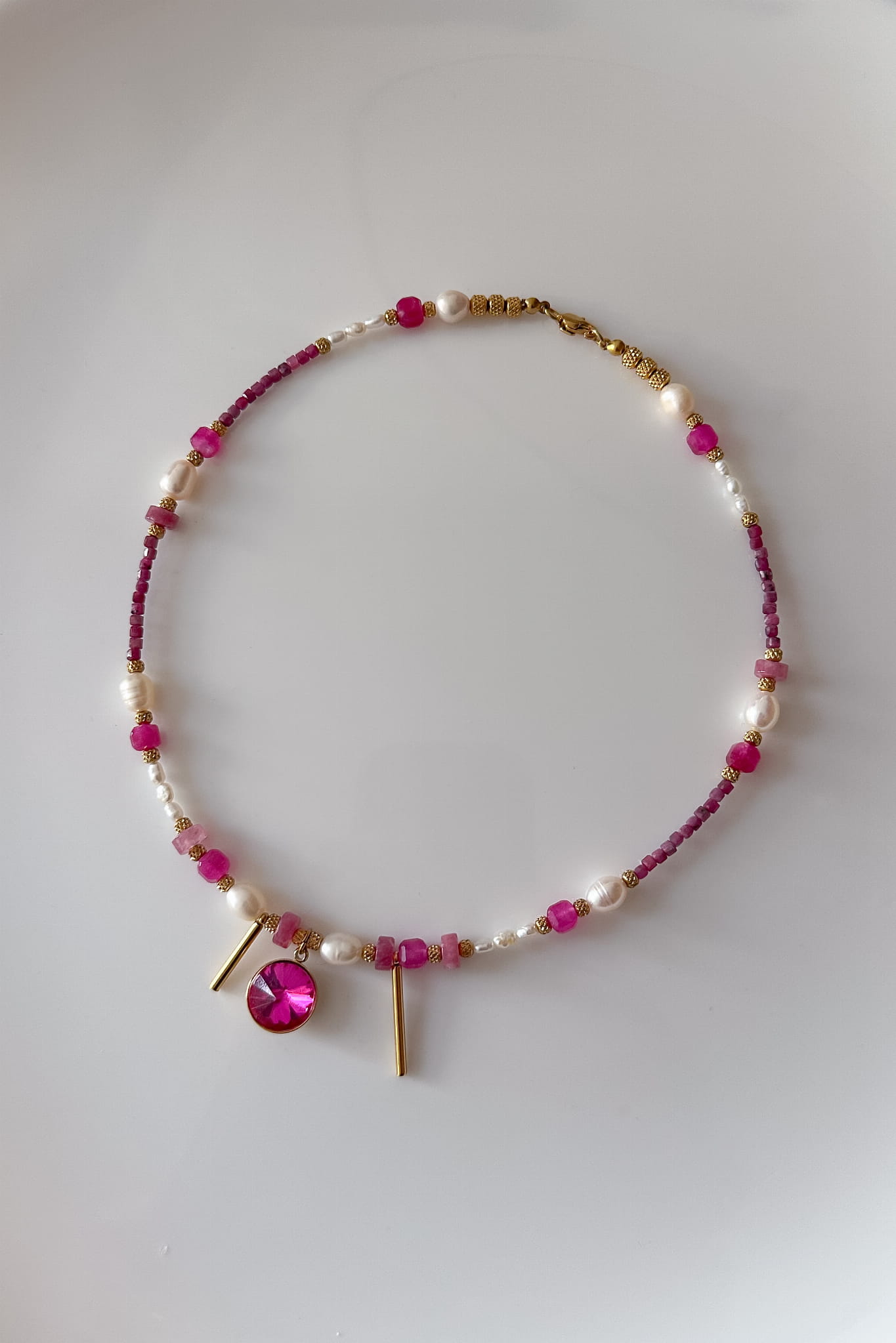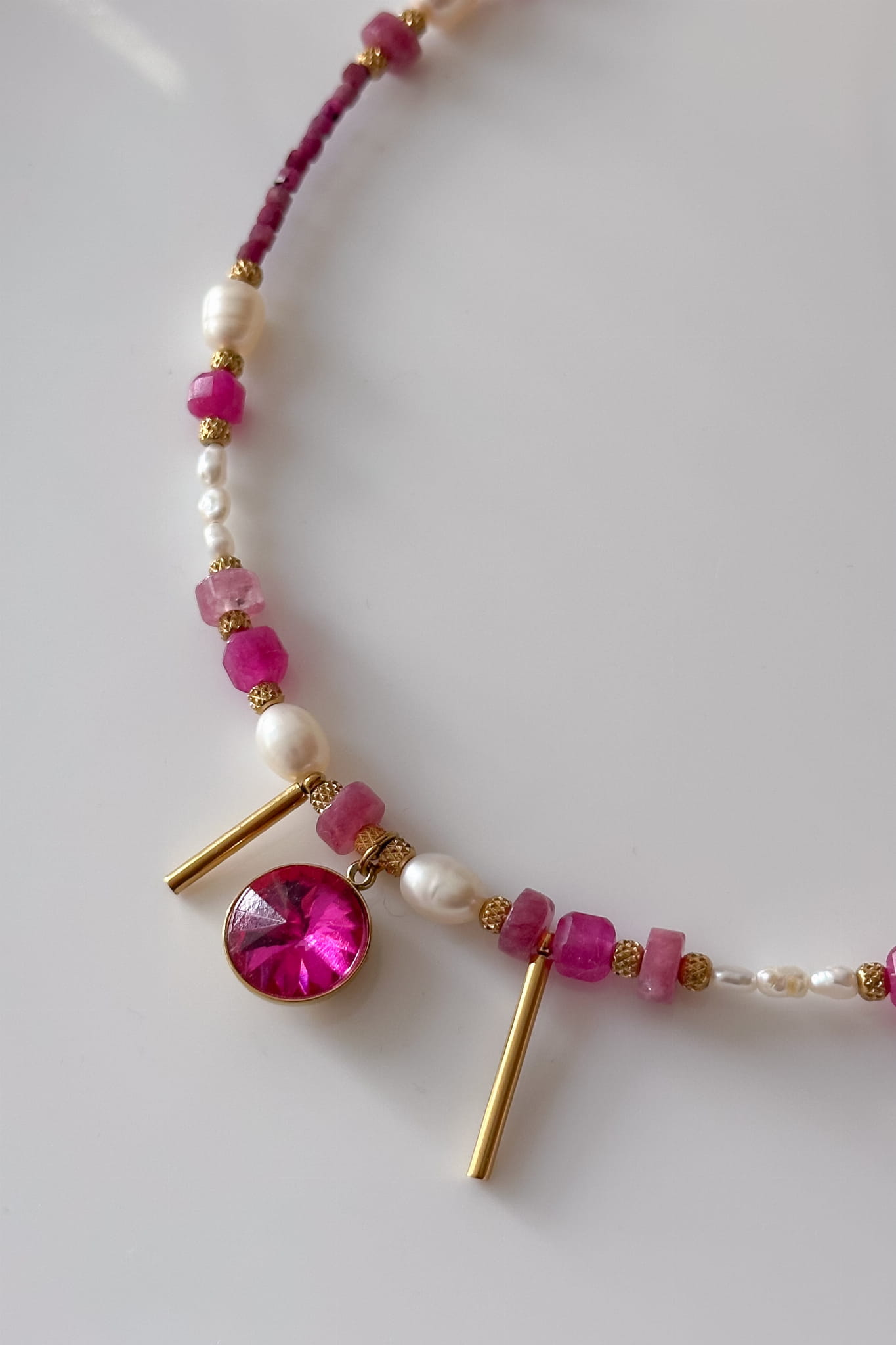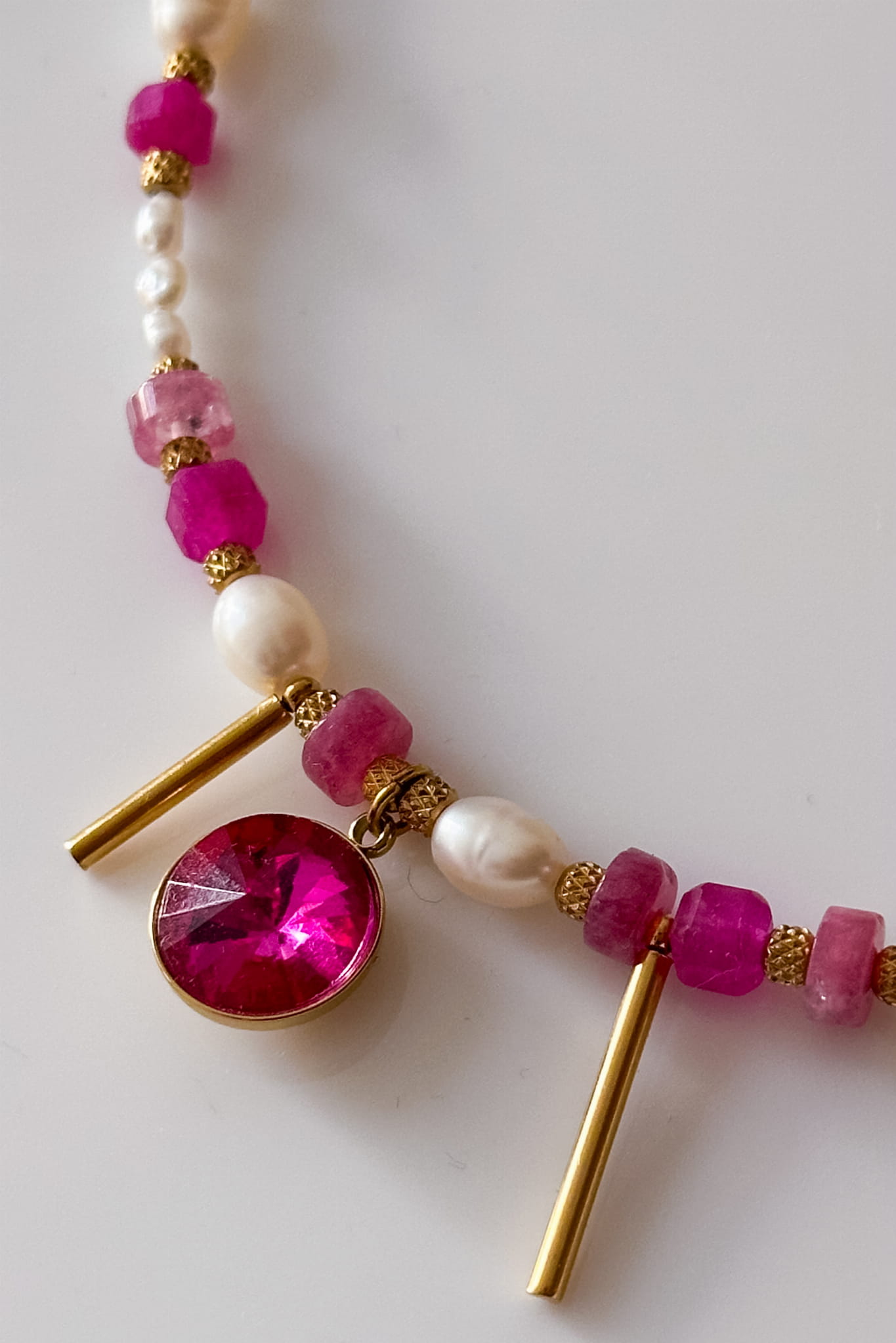 Unikatowy choker z pereł, różowego jadeitu, różowego turmalinu i rubinu. Długość 40,5 cm. Elegancki, kobiecy i pełen mocy. Stal szlachetna 316L. Jeden egzemplarz.