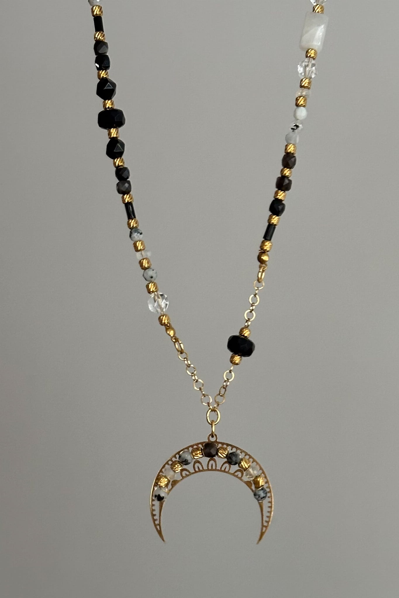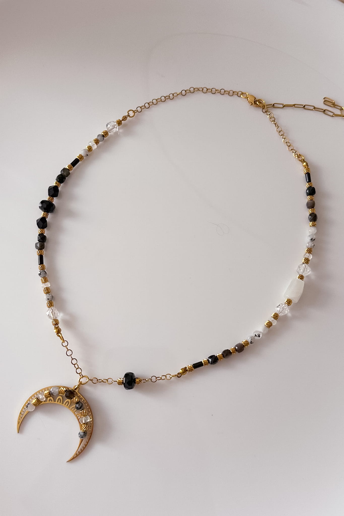 129 Unikat – Lunula Ochrony Naszyjnik z księżycem i kamieniami: obsydian srebrzysty, kamień księżycowy z turmalinem, onyks, czarny turmalin, kamień księżycowy, kryształ górski