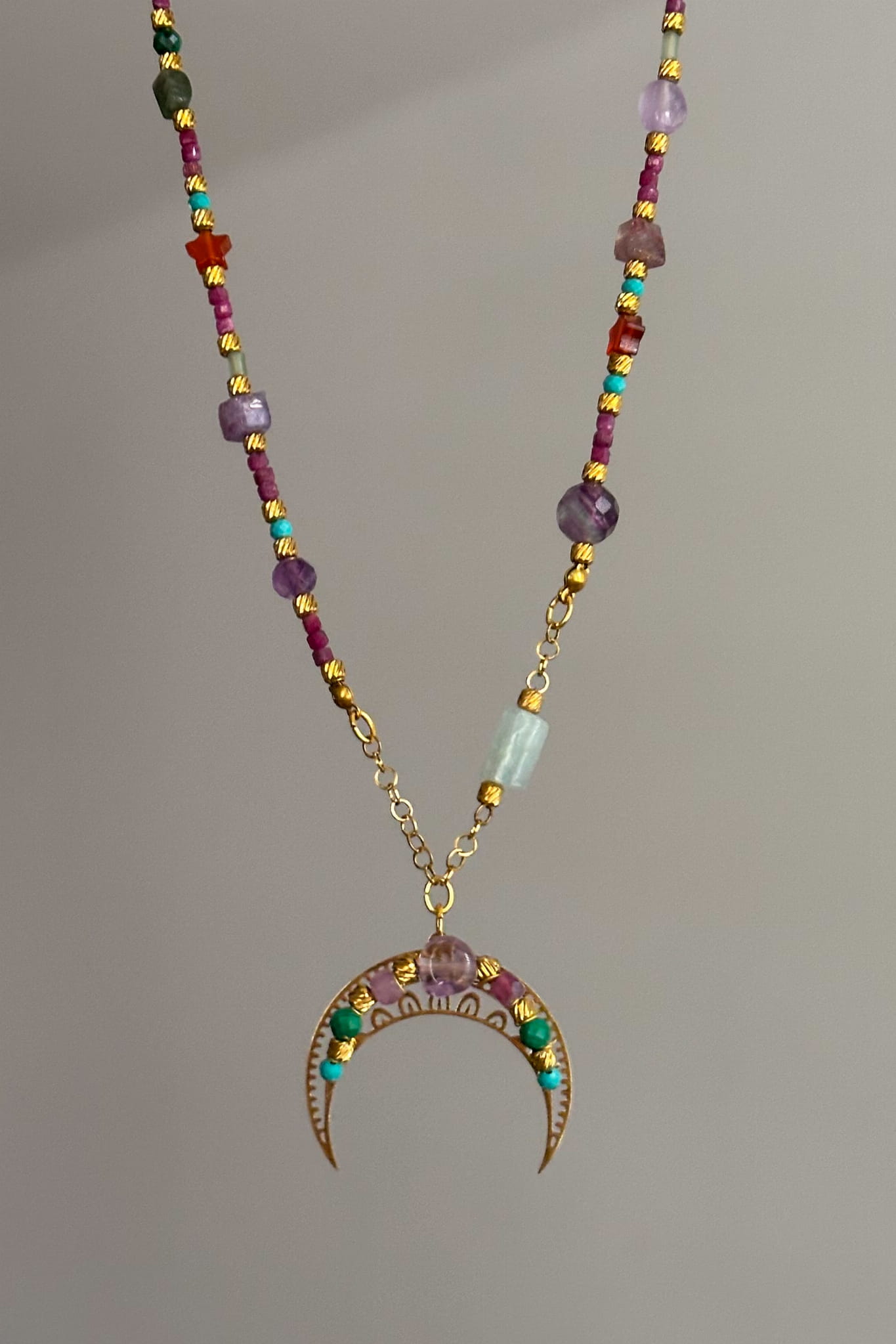 130 Unikat – Lunula Dopaminka III Naszyjnik z księżycem i kamieniami naturalnymi: akwamaryn, ametryn, rubin, magnezyt, malachit, zielony turmalin, awenturyn, fluoryt, karneol