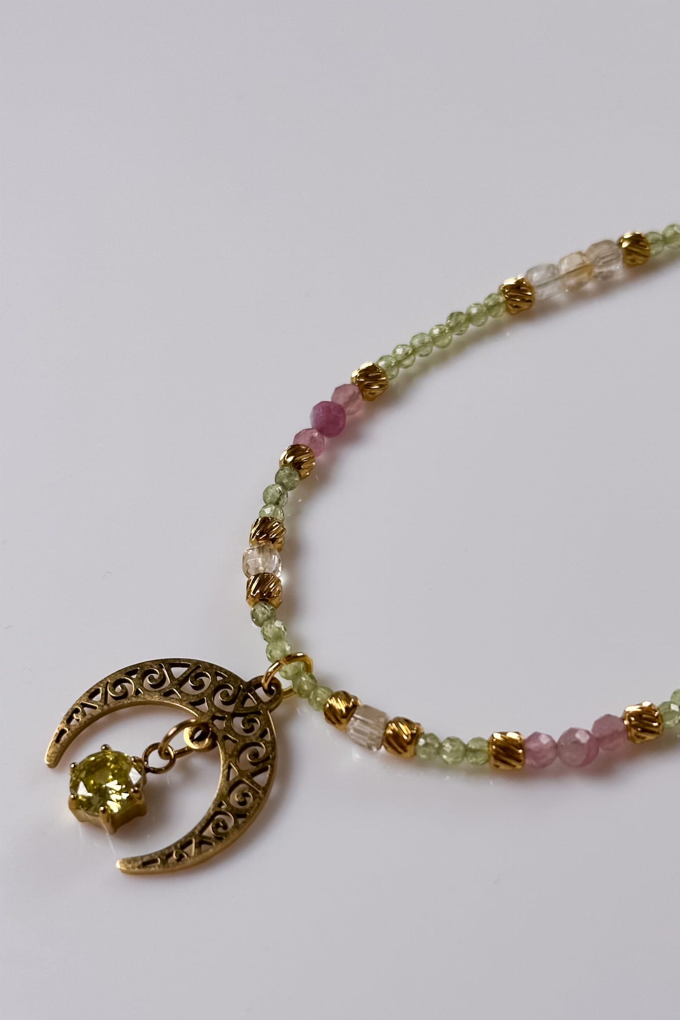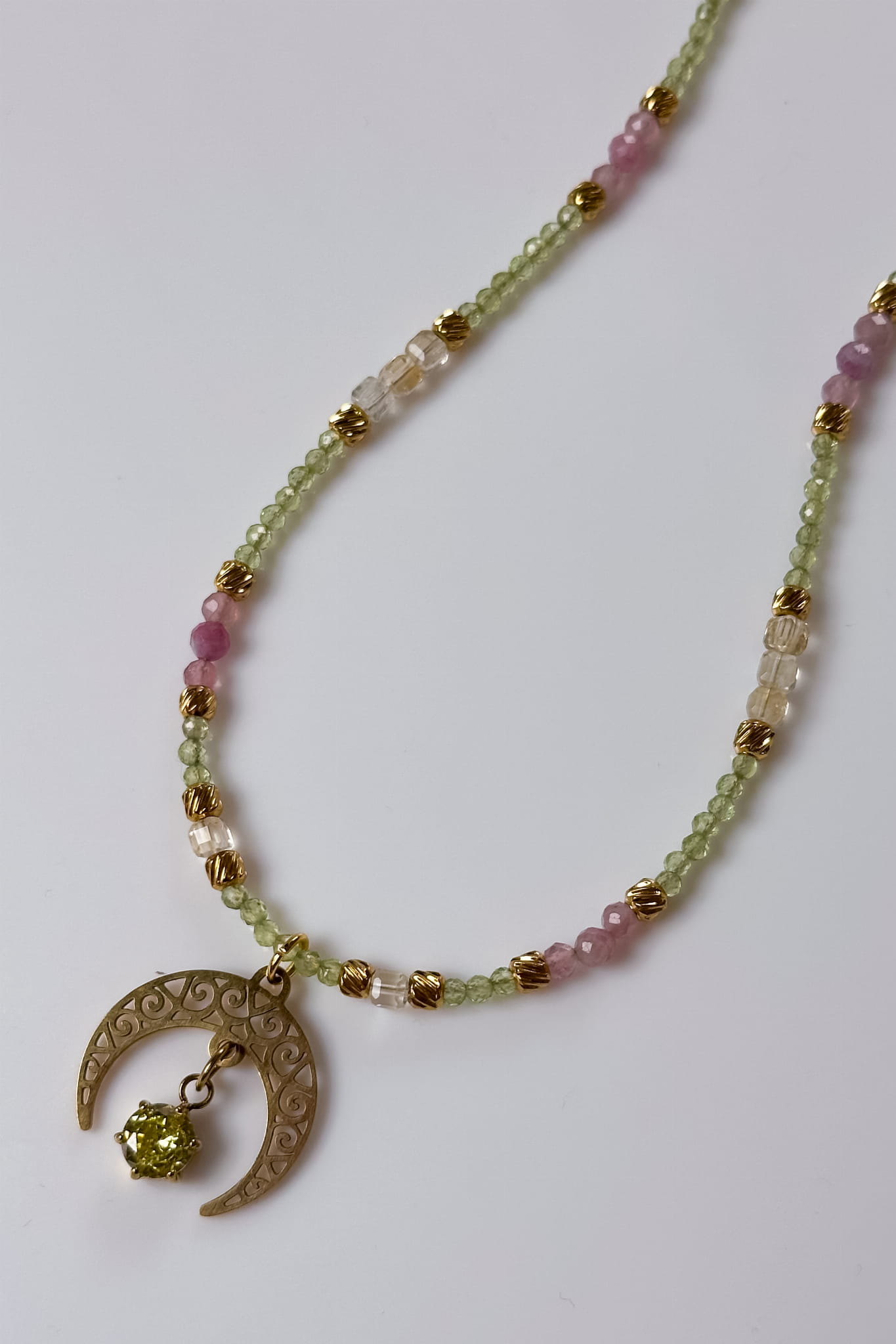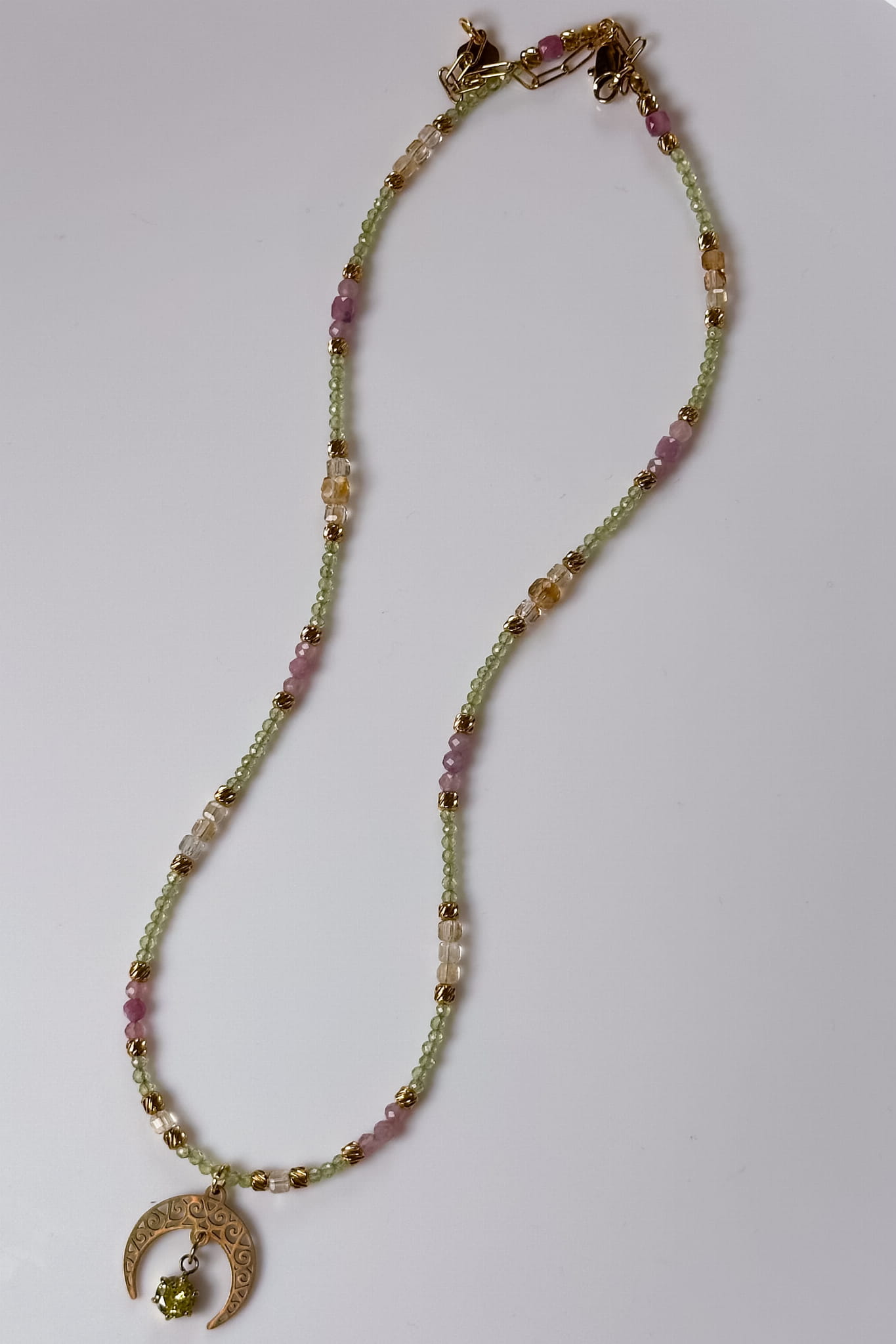 133 Unikat – Lunula Miłości i Powodzenia Naszyjnik z księżycem i kamieniami naturalnymi: cytryn, oliwin, różowy kwarc, różowy turmalin