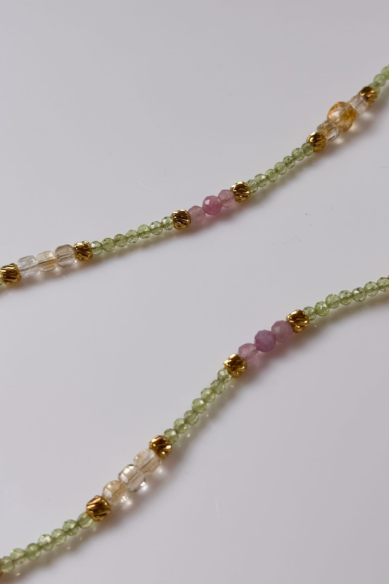 Pastelowe róże spotykają tu świeżą zieleń, a złote refleksy cytrynu dodają całości ciepła. Ten naszyjnik nie jest obietnicą zmian — raczej symbolem, który możesz nosić blisko siebie, gdy chcesz pamiętać, co naprawdę dodaje Ci siły.