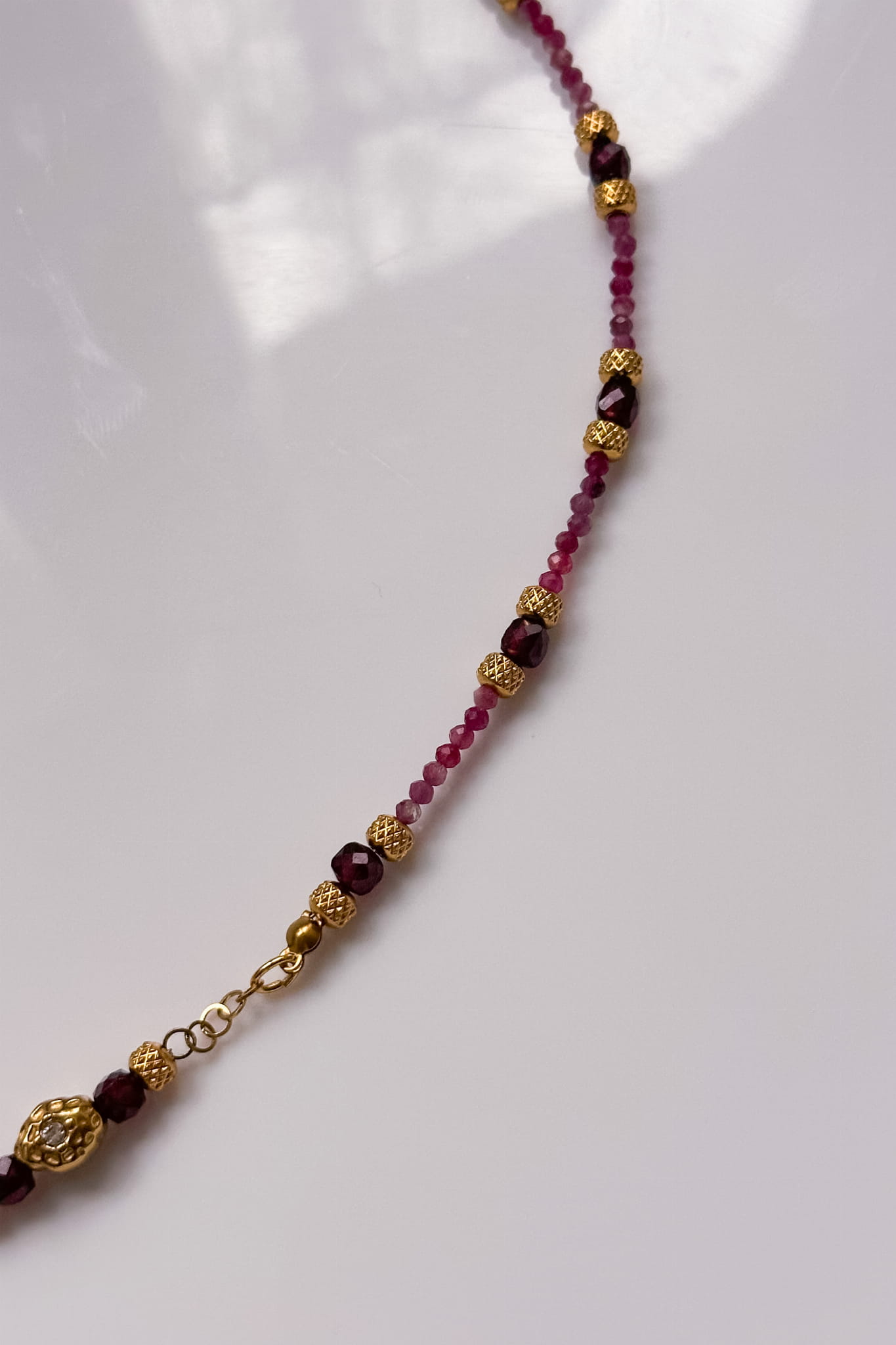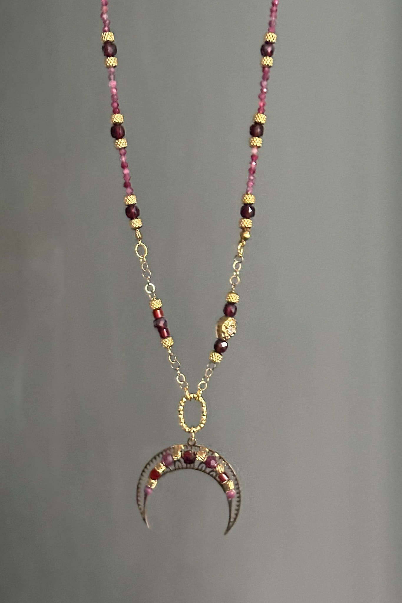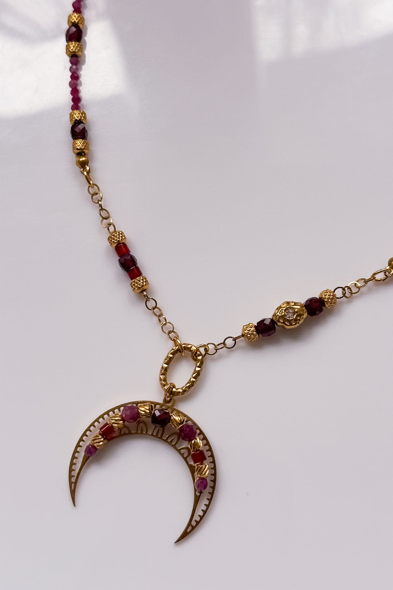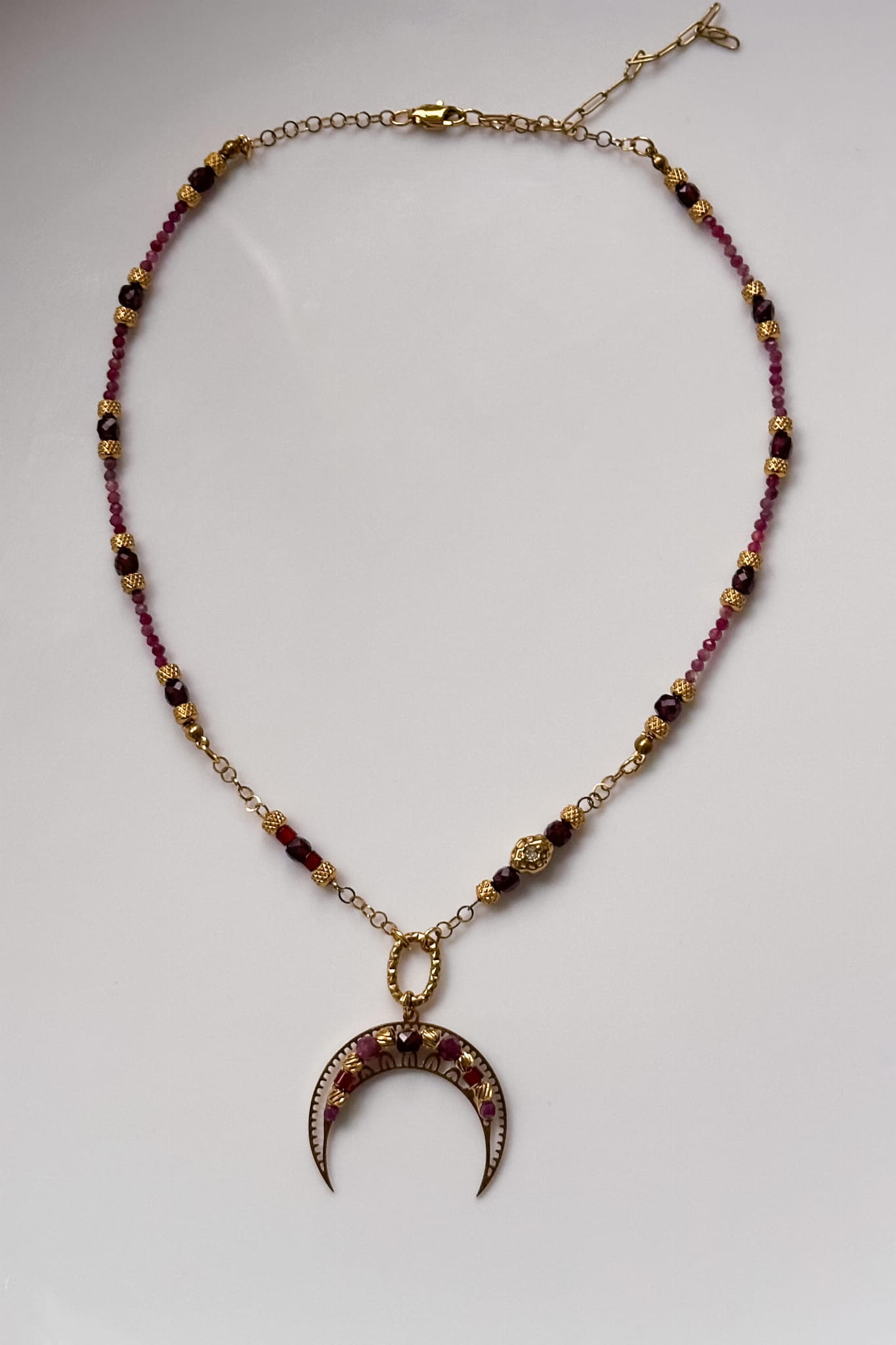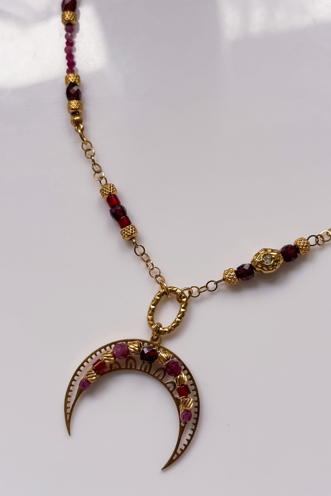 136 Unikat — Lunula Królowej Życia Naszyjnik z naturalnymi kamieniami: rubin, granat, różowy turmalin, karneol