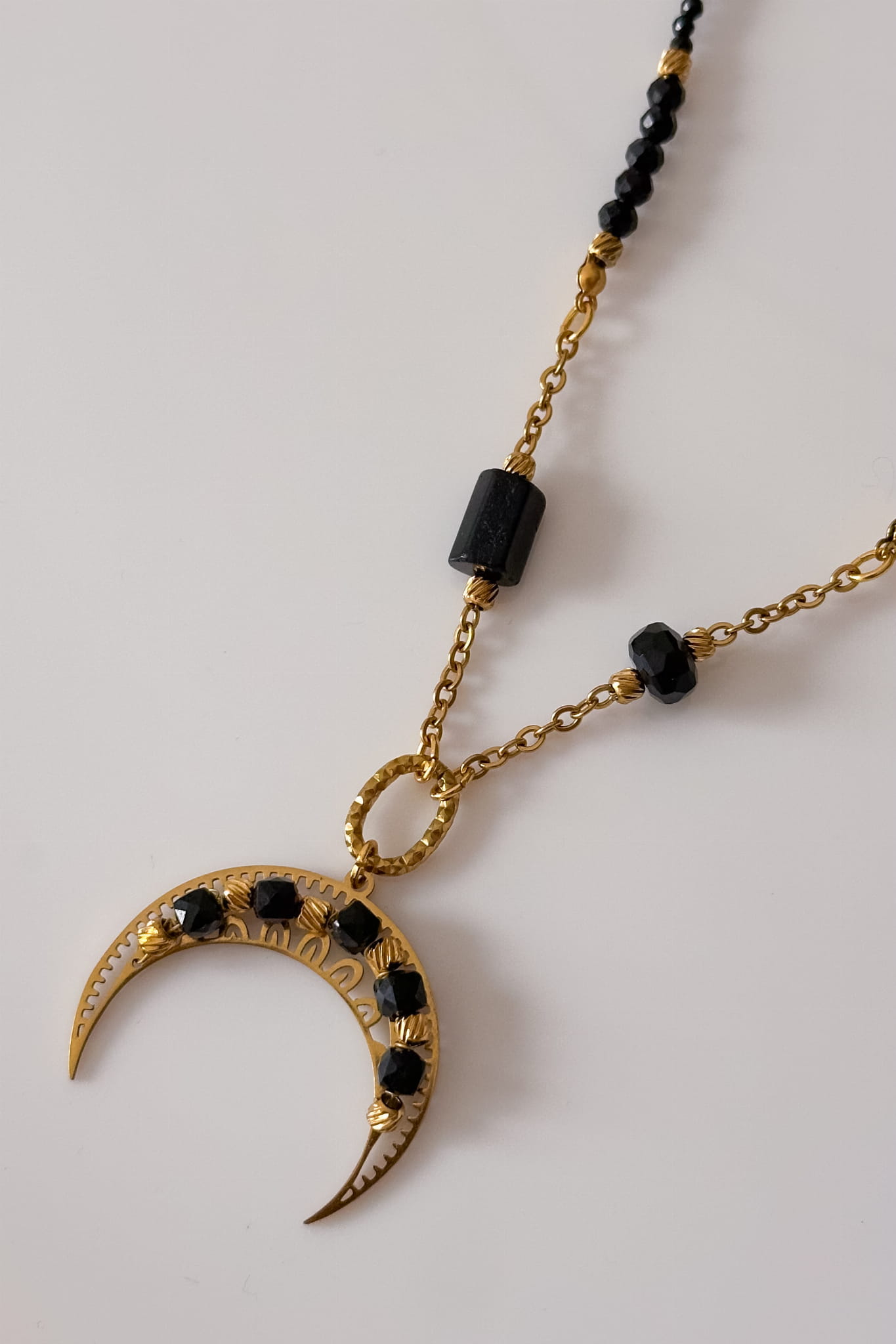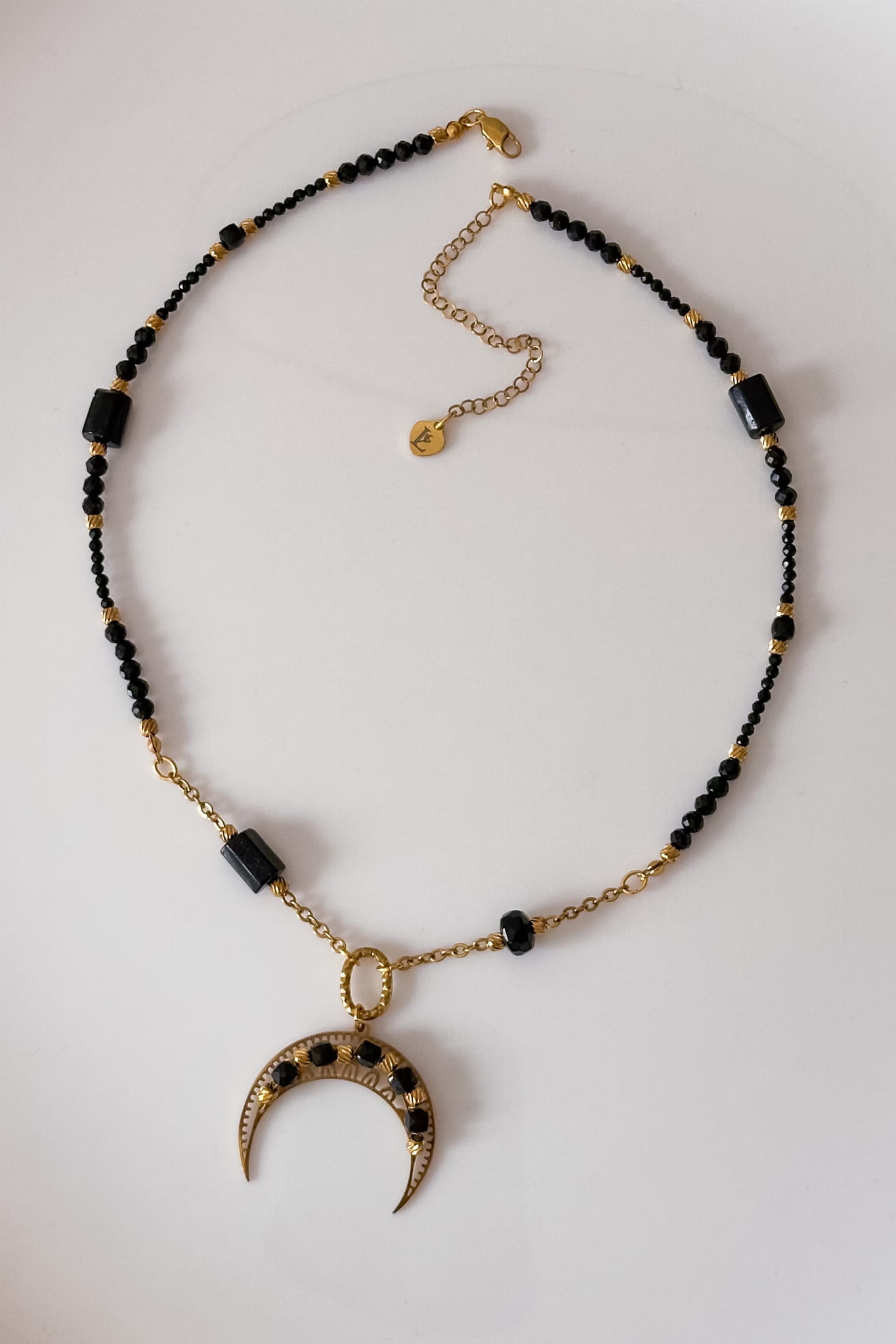 Unikatowy naszyjnik z lunulą, czarnym turmalinem i onyksu – symbolem wewnętrznego bezpieczeństwa i ochrony.