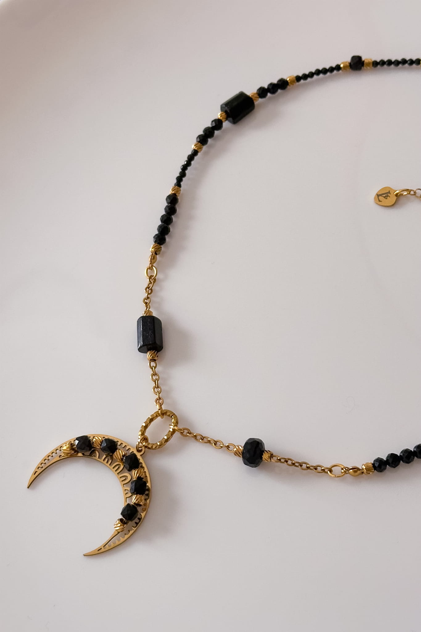 Ten naszyjnik powstał jako symbol wewnętrznego bezpieczeństwa – tego, które nie zależy od okoliczności, ludzi ani zewnętrznych gwarancji. Lunula od wieków była znakiem ochrony i kobiecej mocy, a w tej wersji została otulona czernią kamieni, które kojarzą się z granicą, stabilnością i osadzeniem w sobie.