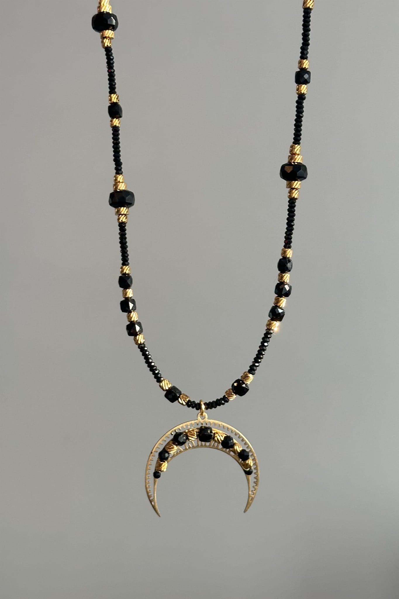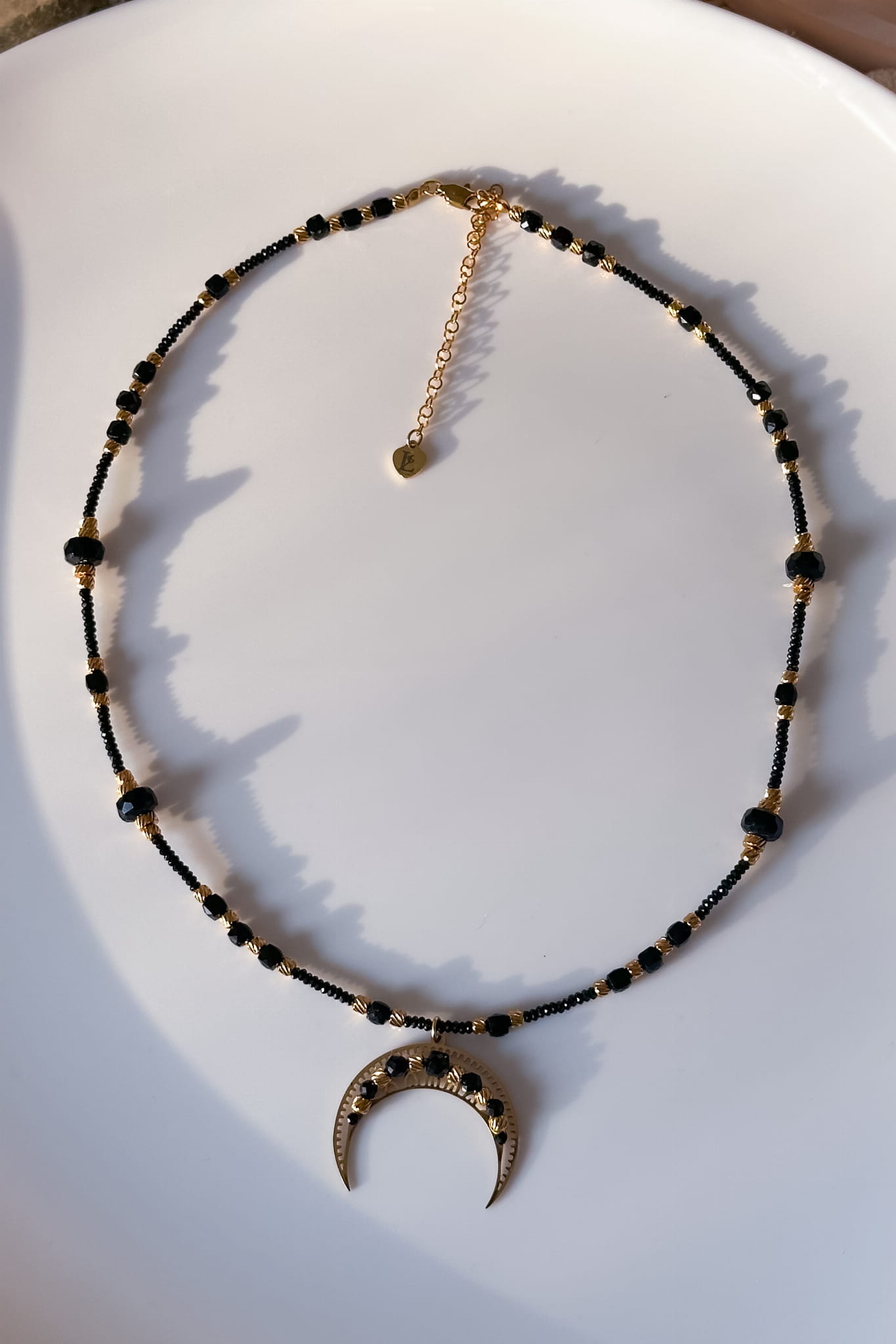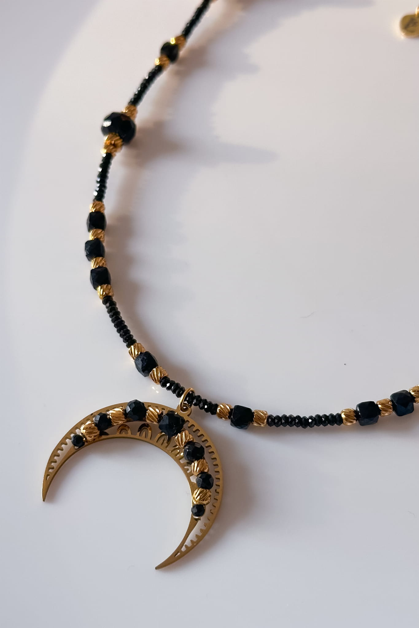 Symboliczny naszyjnik z lunulą, onyksem i czarnym turmalinem - dla kobiet, które cenią spokój, granice i wewnętrzną siłę. Regulowana długość pozwala dopasować go do stylu i nastroju. Unikatowy egzemplarz stworzony jako subtelny znak ochrony.