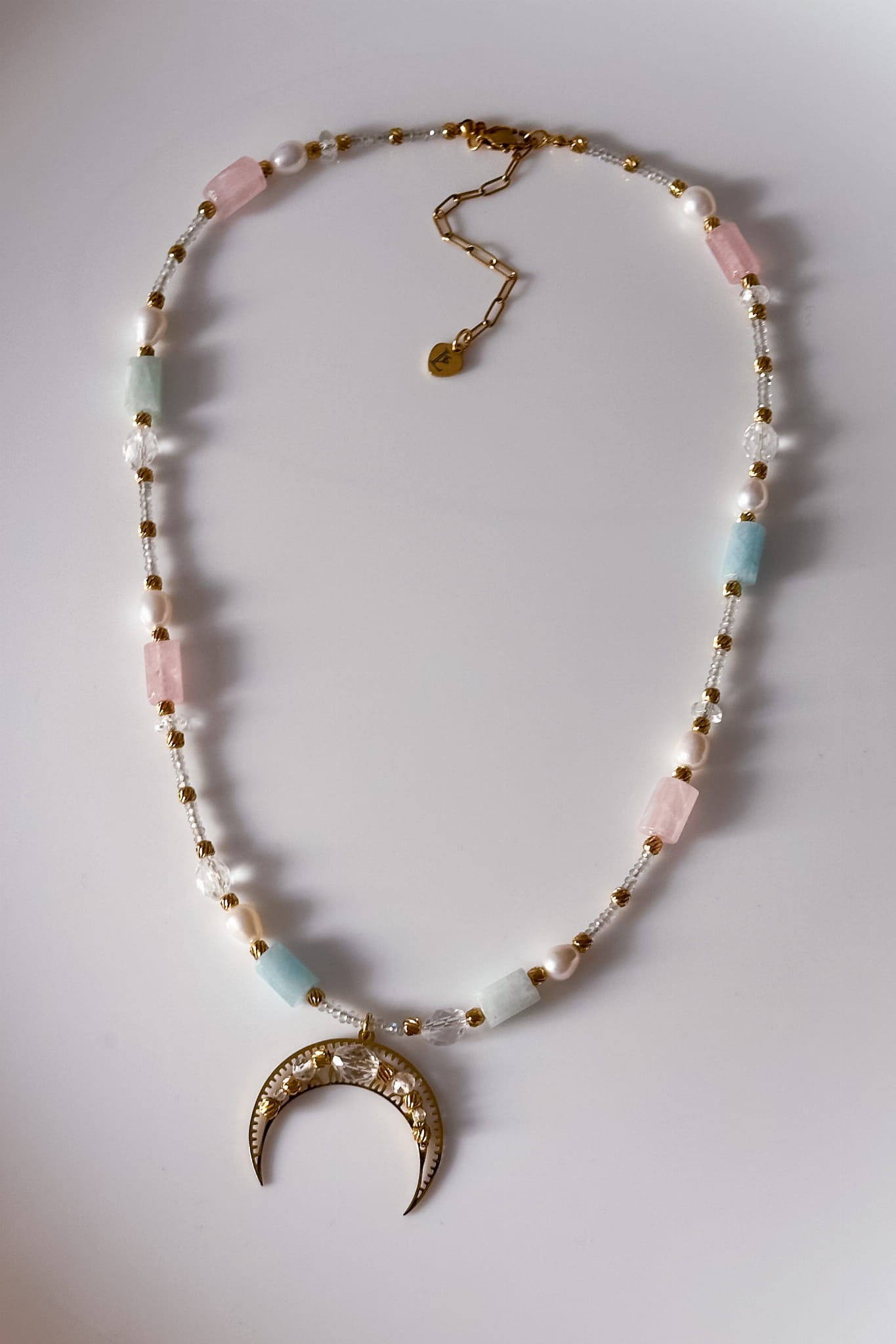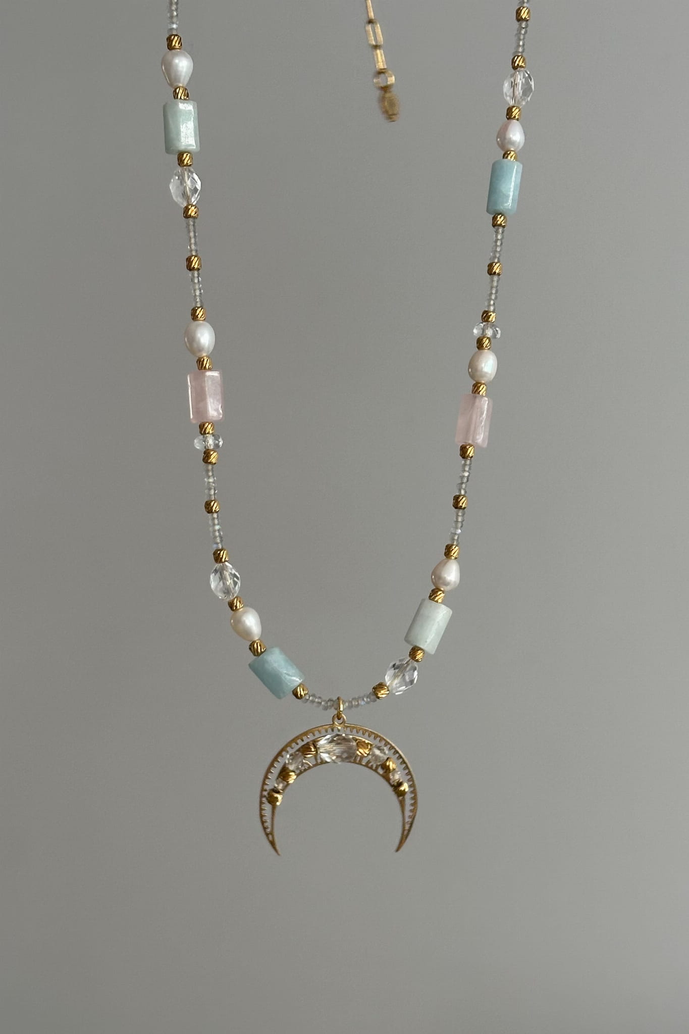 Połączenie labradorytu, kryształu górskiego, kwarcu różowego, perły i akwamarynu tworzy biżuterię pełną ciszy, światła i kobiecej łagodności.