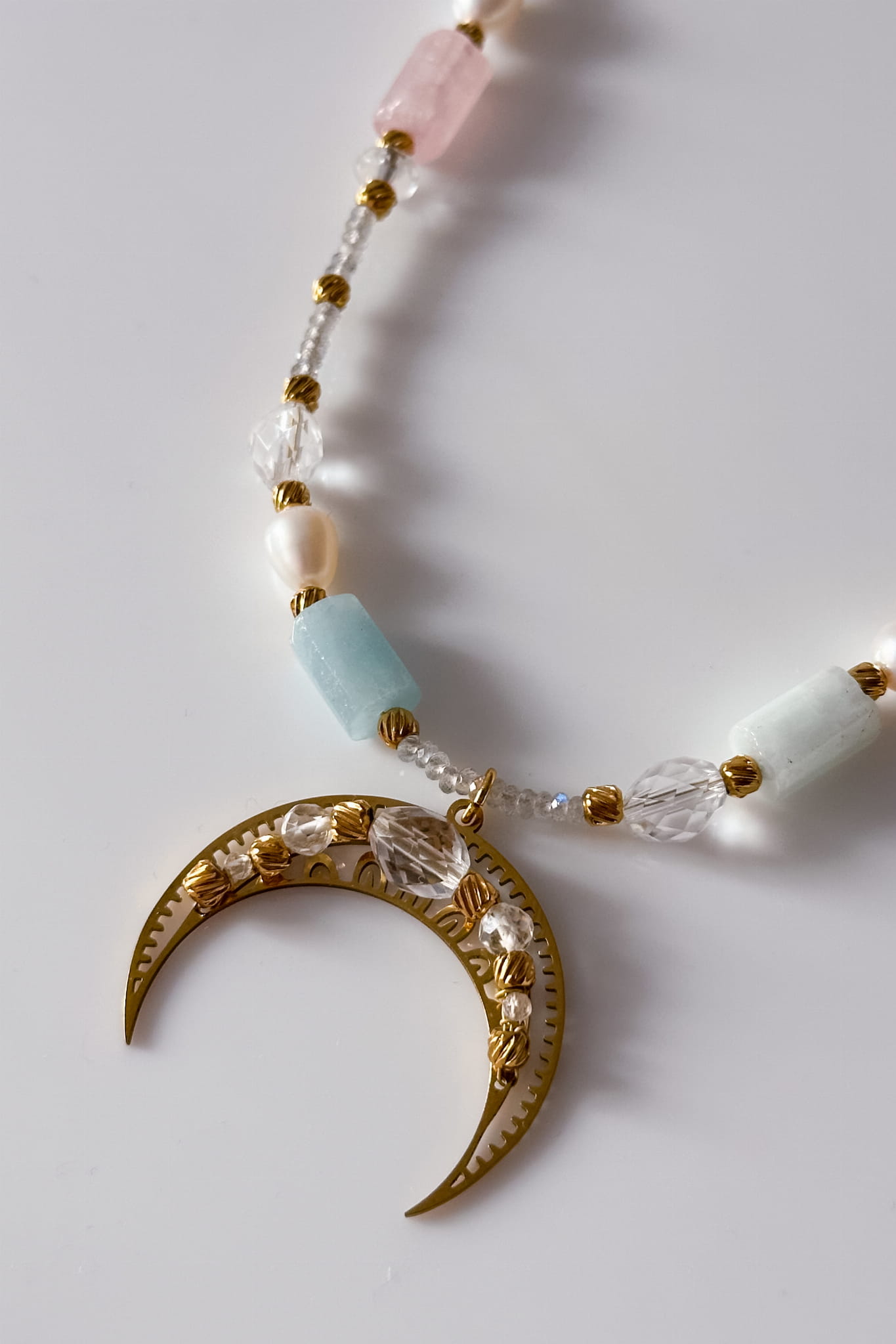 160 Unikat Anielska Lunula z labradorytem, kryształem górskim, kwarcem różowym, perłą, akwamarynem