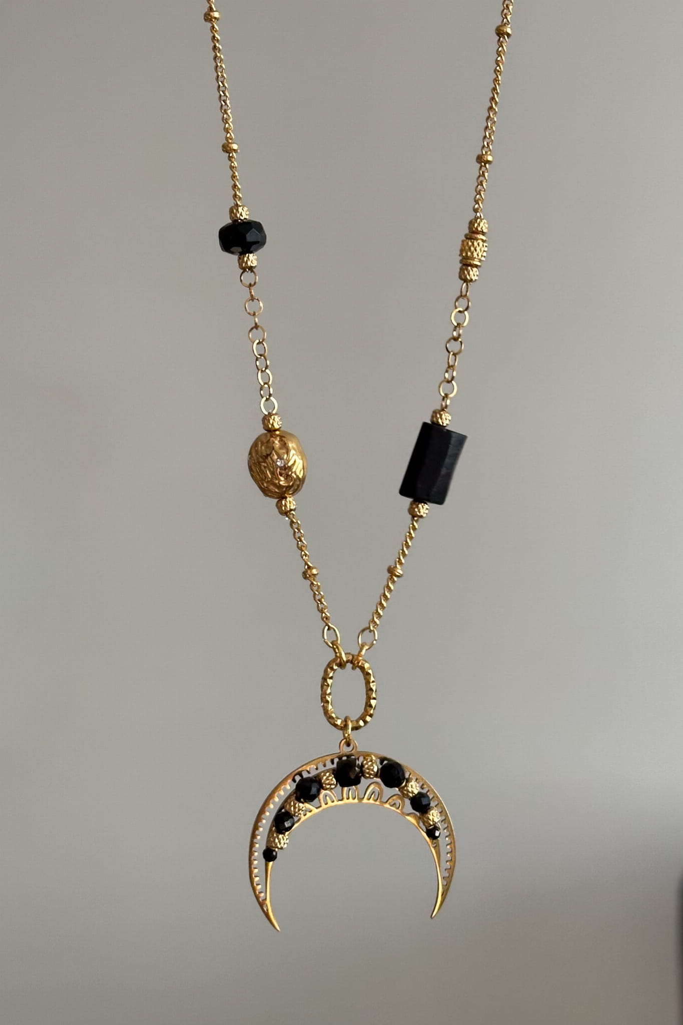 Złota lunula przyciąga światło, a czarne kamienie trzymają ton – spokojny, stabilny, pewny.