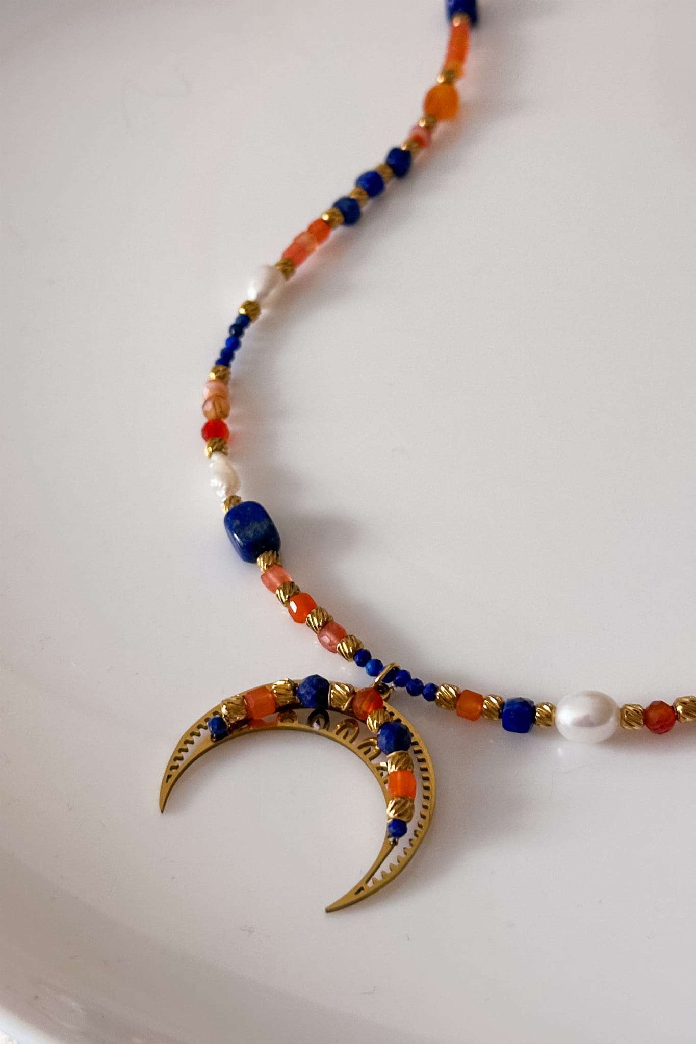 174 Unikat Lunula Radosnych Uniesień – naszyjnik z księżycem z kamieniami lapis lazuli, agat pomarańczowy, karneol, perła