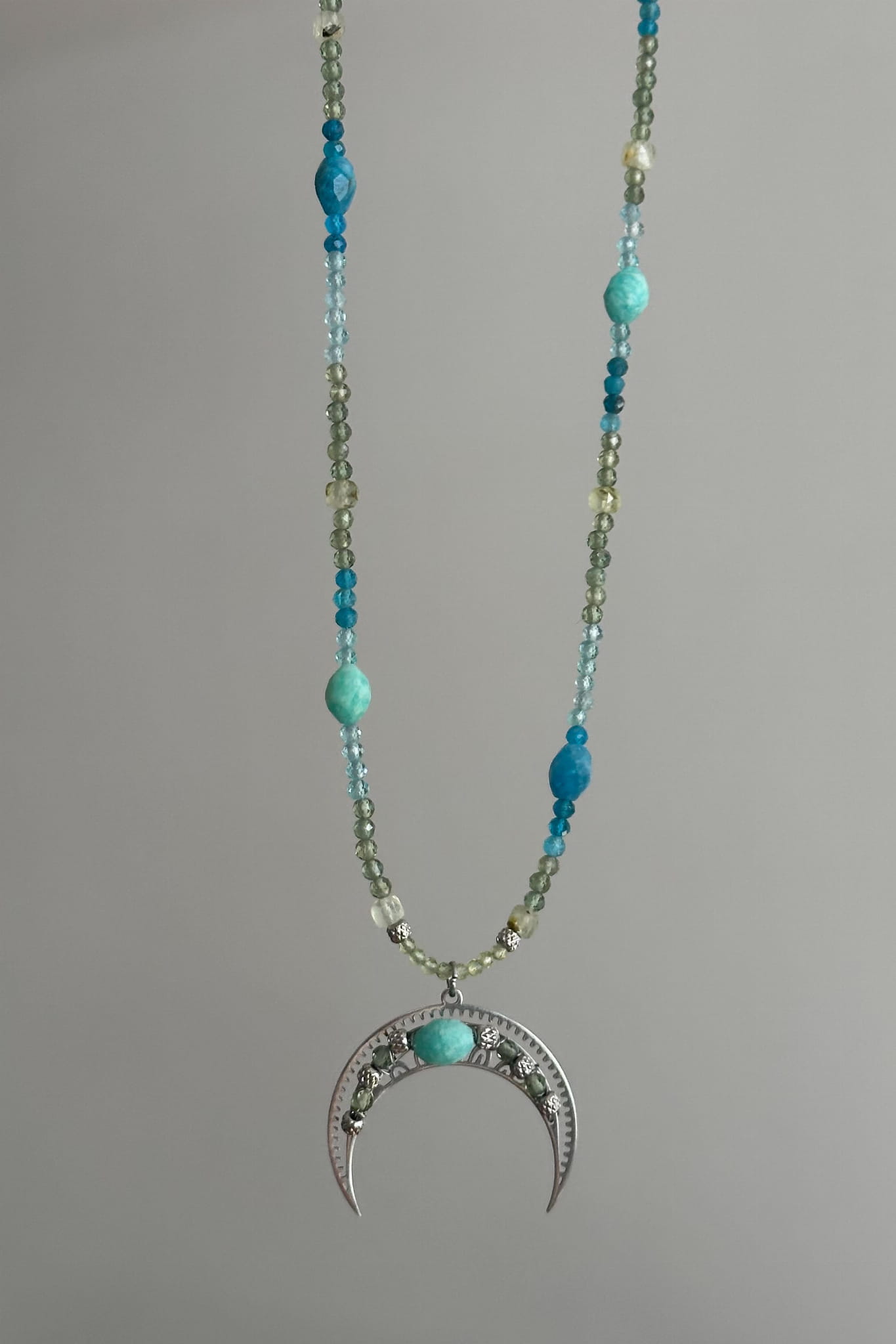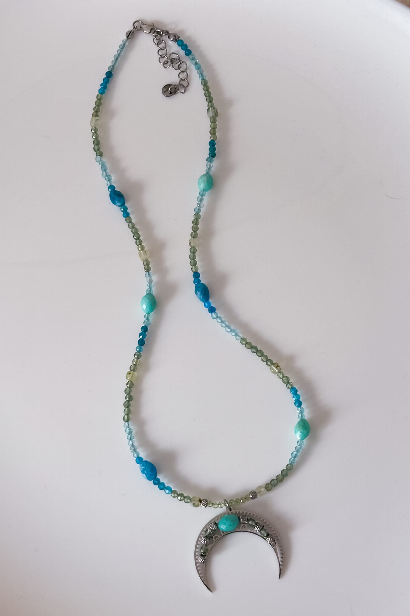 183 Unikat Lunula idealnego przepływu z dodatkami w kolorze srebrnym z kamieni: agat , apatyt, prehnit, oliwin, kyjanit