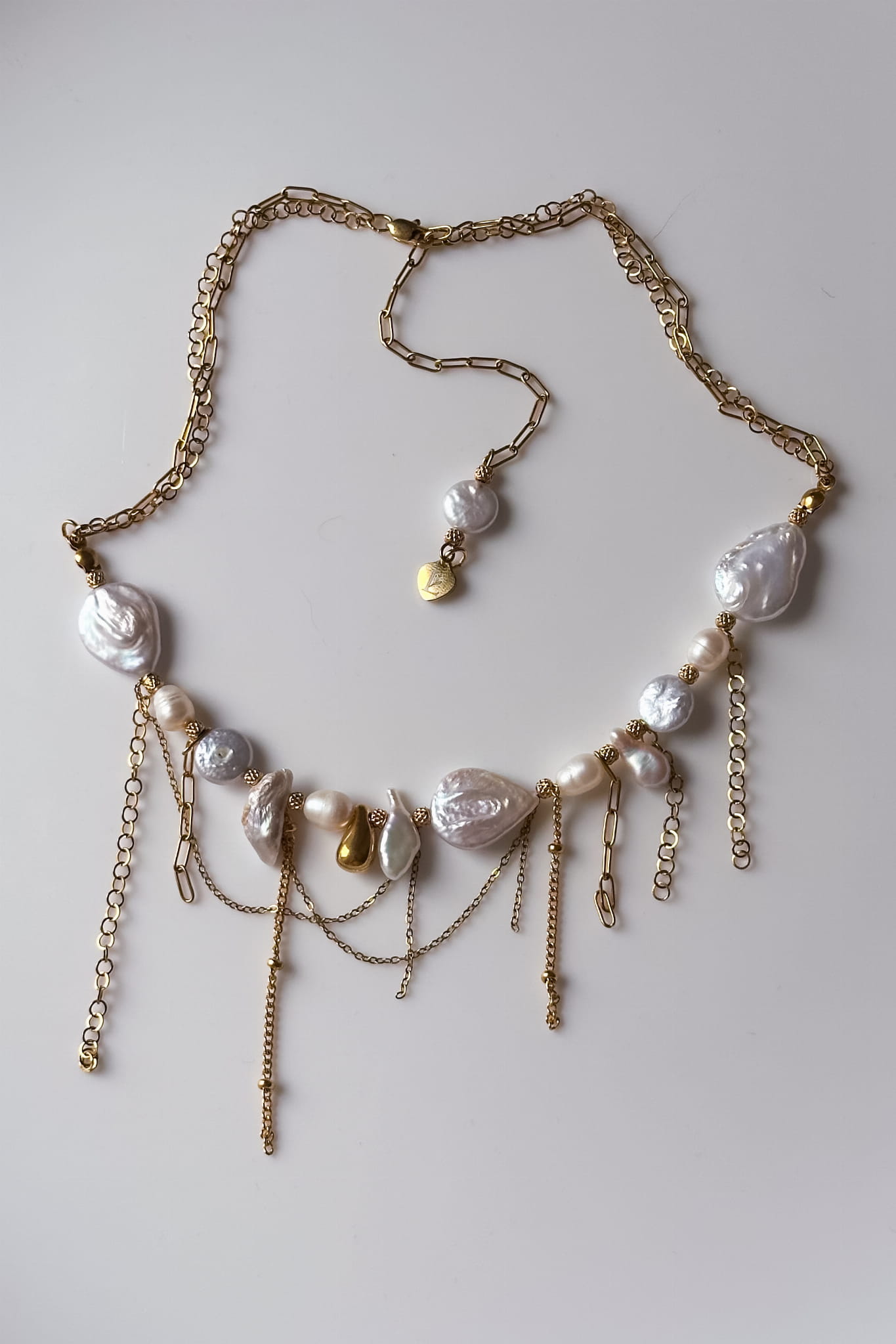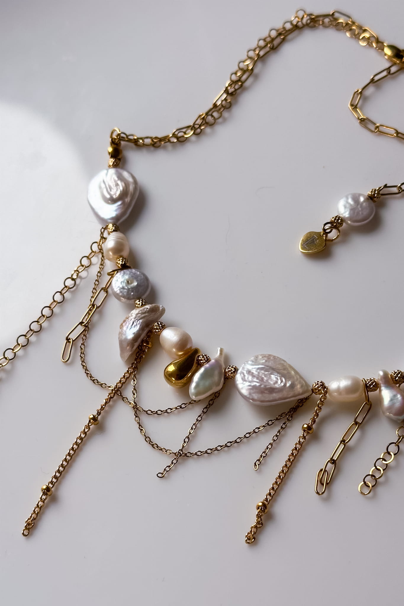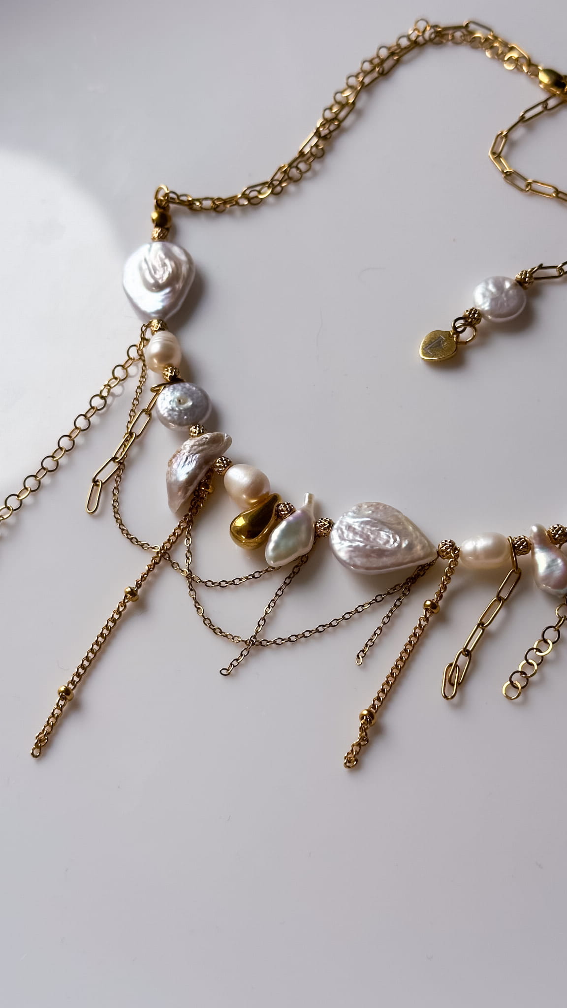 Perły w tej kolii są nieregularne, naturalne, każda inna. Ich symbolika od wieków łączy się z kobiecością, emocjonalną dojrzałością i czułym kontaktem z samą sobą. Przypominają, że prawdziwe piękno nie musi być równe ani doskonałe. Jest żywe, zmienne i autentyczne. Złote łańcuszki poruszają się swobodnie przy każdym ruchu ciała, jak oddech, jak delikatny dotyk. Całość tworzy formę, która nie dominuje, lecz otula.