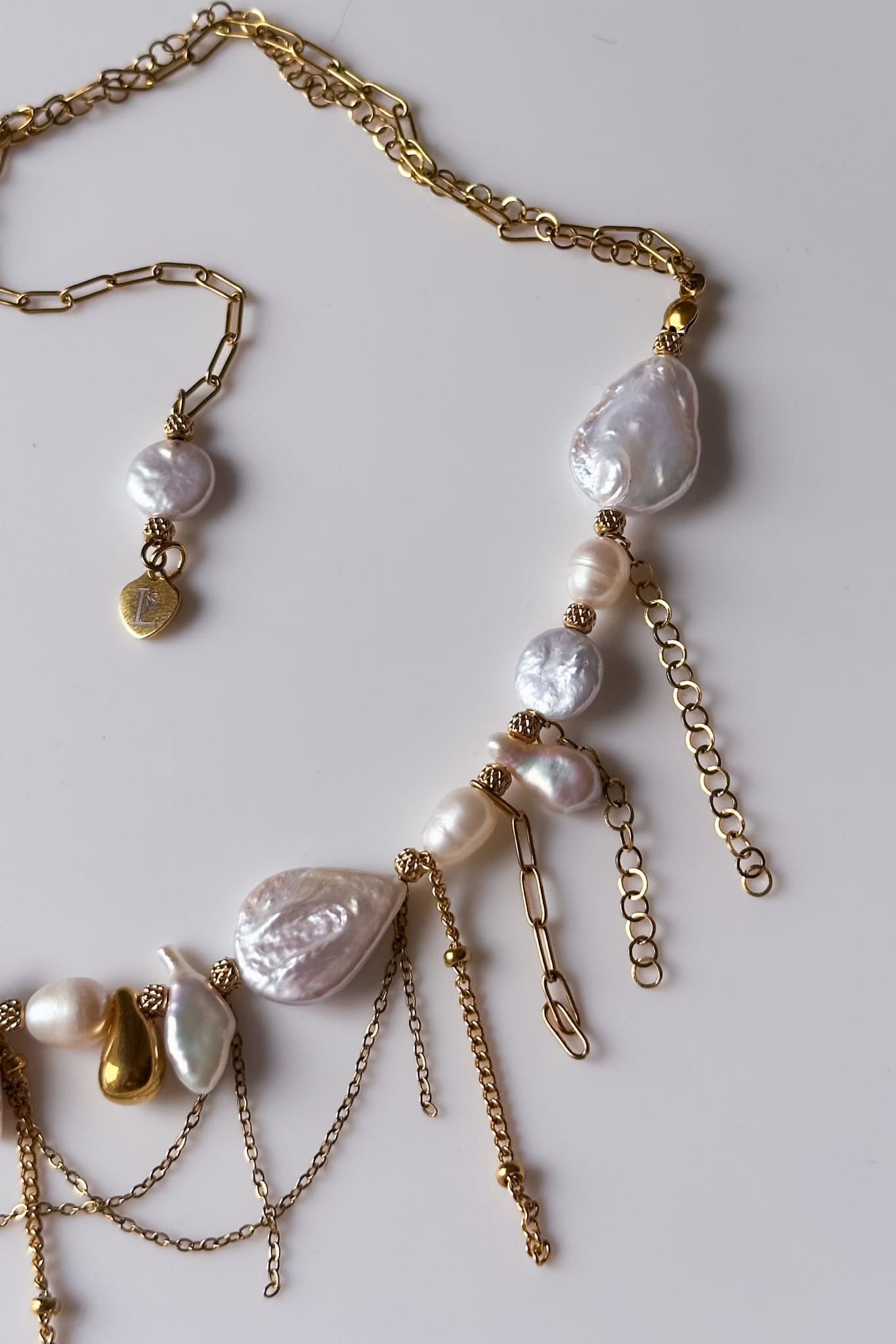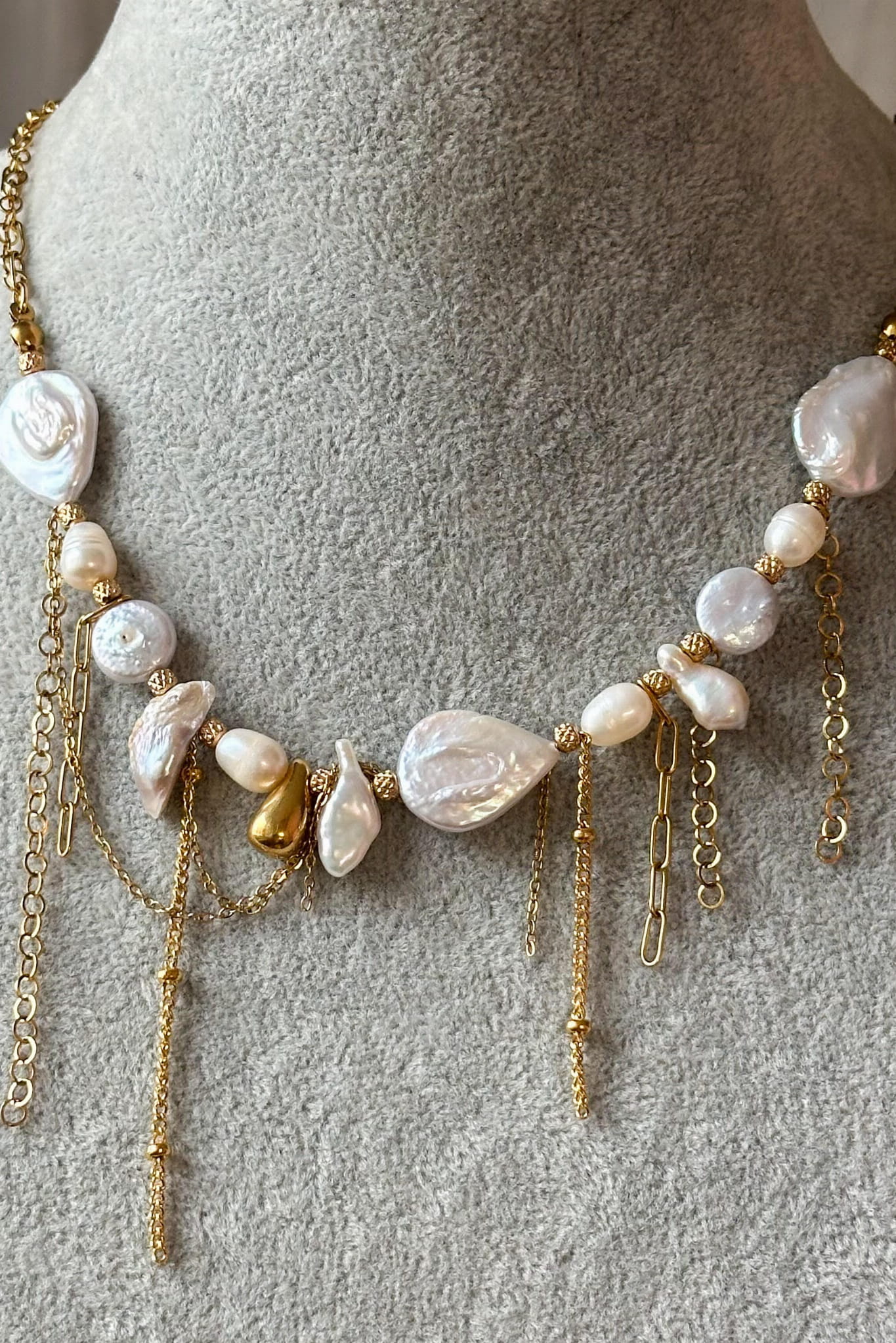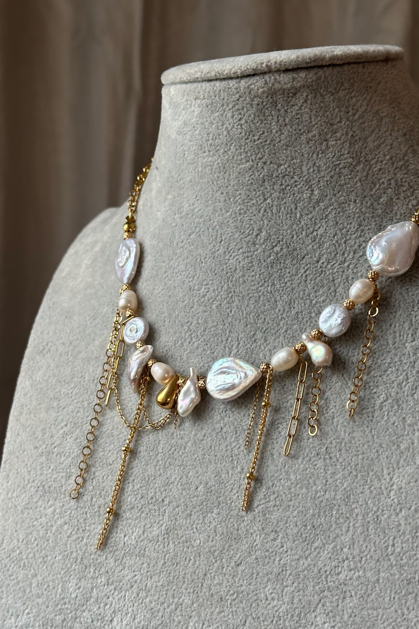 Perły w tej kolii są nieregularne, naturalne, każda inna. Ich symbolika od wieków łączy się z kobiecością, emocjonalną dojrzałością i czułym kontaktem z samą sobą. Przypominają, że prawdziwe piękno nie musi być równe ani doskonałe. Jest żywe, zmienne i autentyczne. Złote łańcuszki poruszają się swobodnie przy każdym ruchu ciała, jak oddech, jak delikatny dotyk. Całość tworzy formę, która nie dominuje, lecz otula.