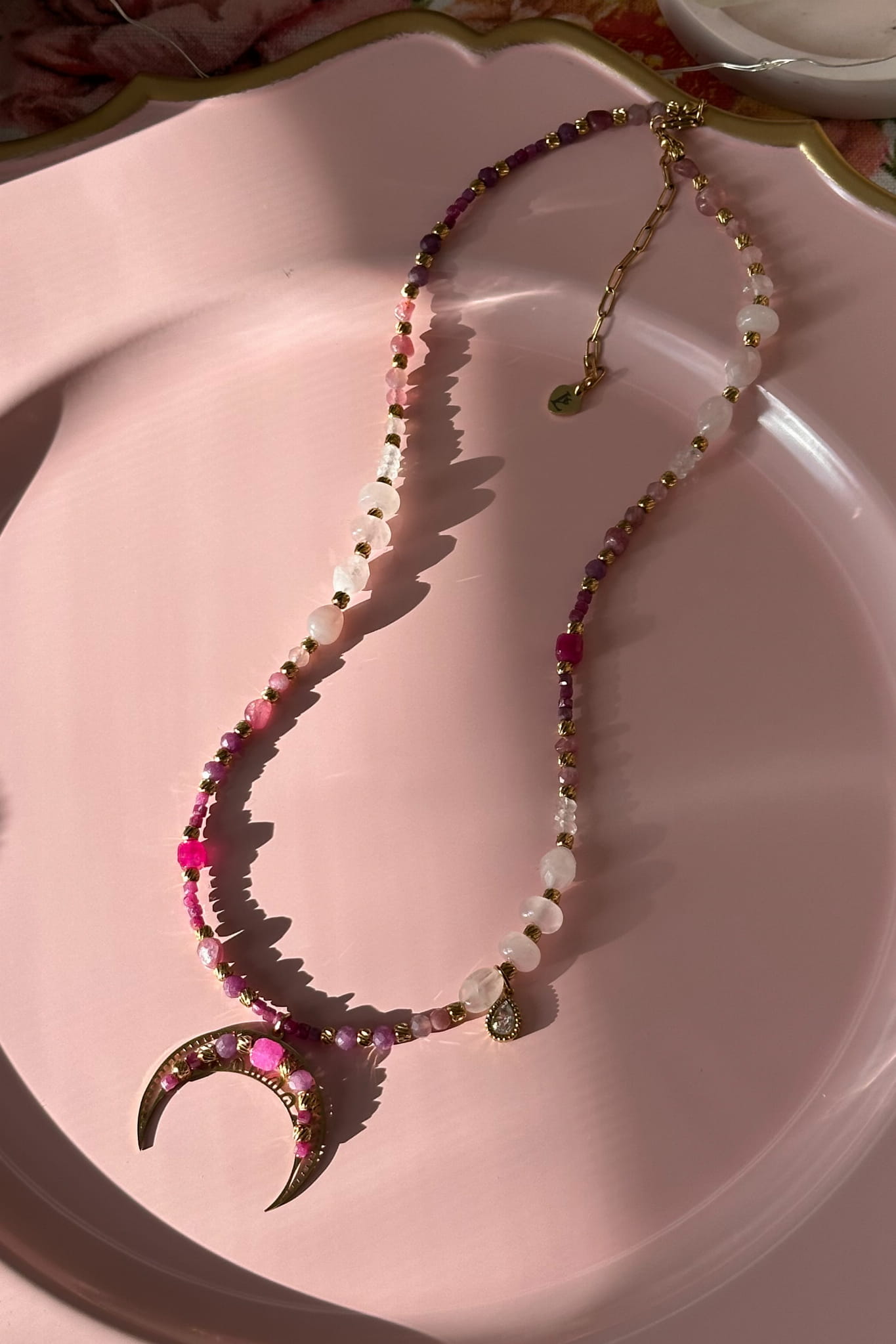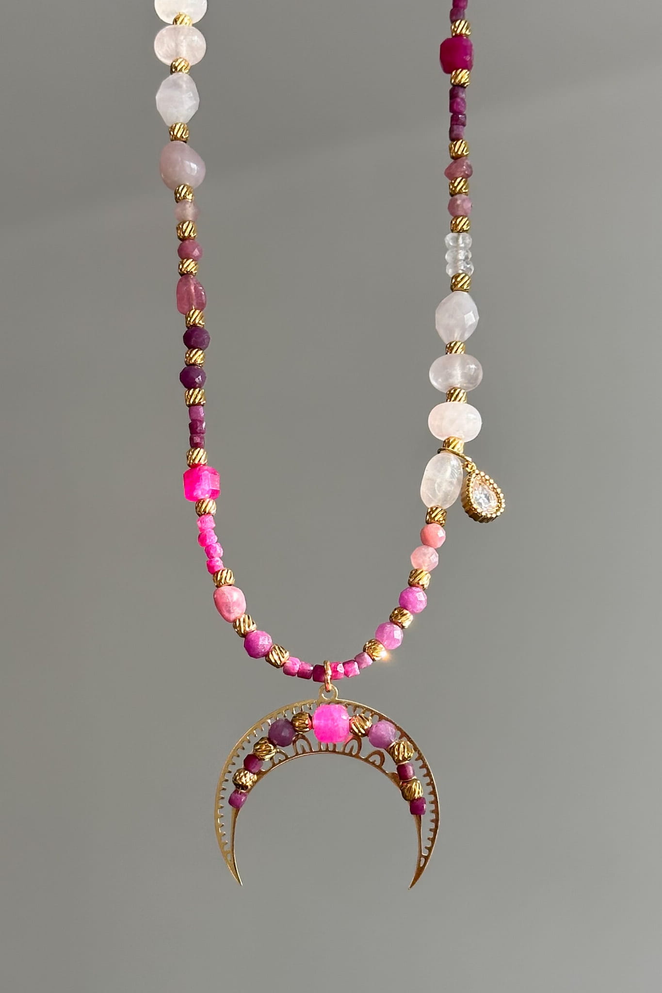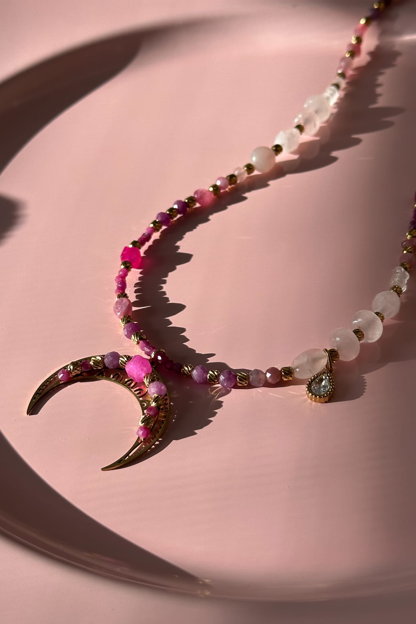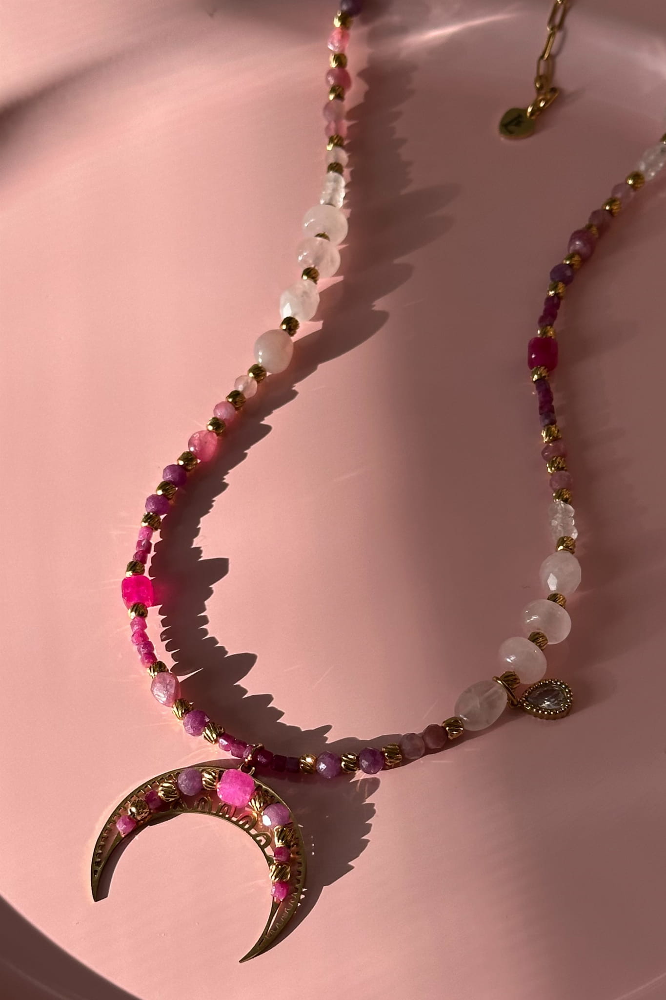 Miłość potrafi być delikatna, silna, namiętna i spokojna jednocześnie. Ta unikatowa lunula z różowym turmalinem, kwarcem różowym, kryształem górskim, rubinem, agatem i granatem powstała dla kobiety, która mieści w sobie wszystkie te barwy. Regulowana długość pozwala nosić ją dokładnie tak, jak czujesz.