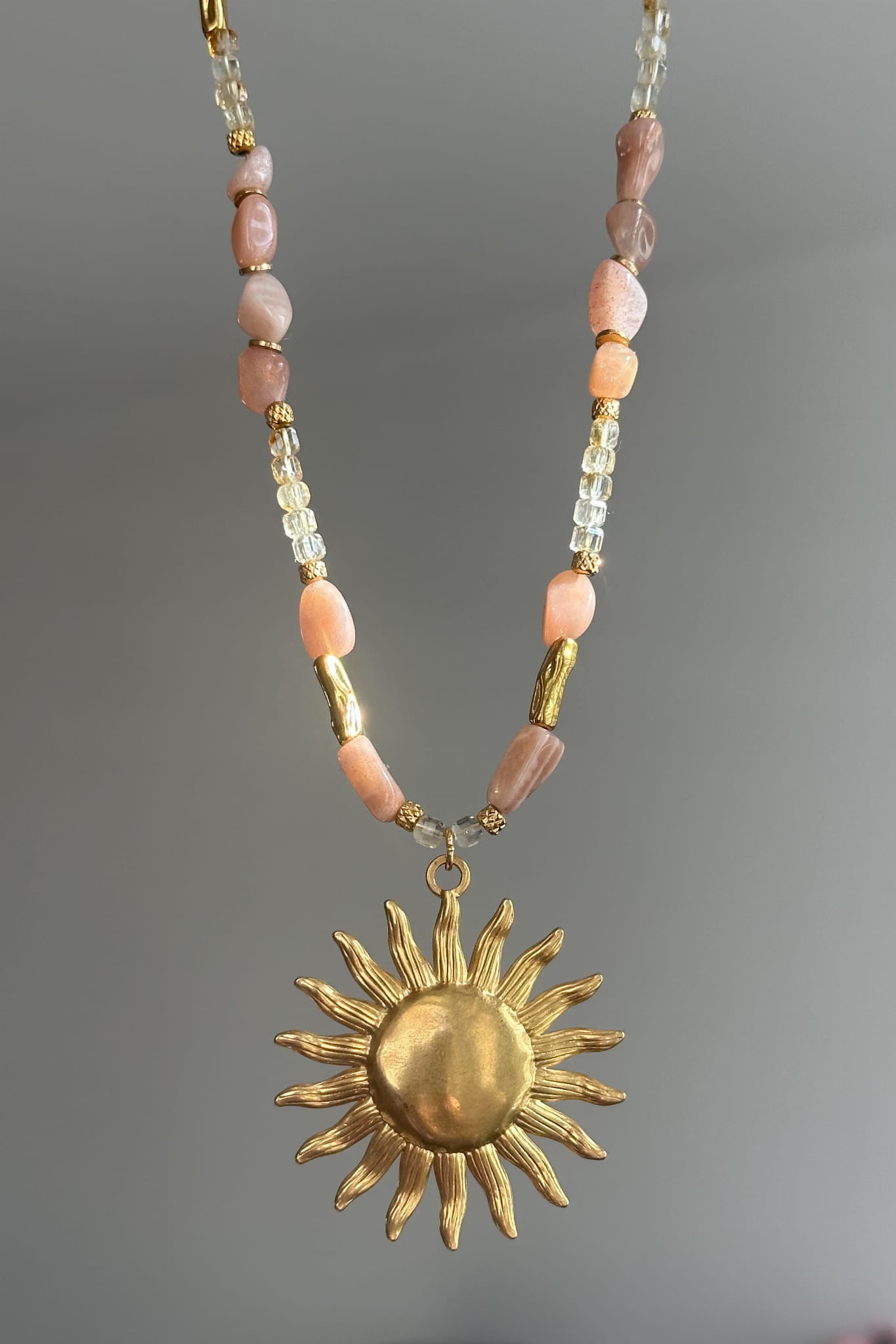 Centralnym punktem naszyjnika jest złote słońce. Symbol życia, energii i odwagi, aby wyjść z cienia i stanąć w swoim świetle. Towarzyszą mu kamienie w ciepłych odcieniach złota i różu, które budują kompozycję przypominającą światło późnego popołudnia.