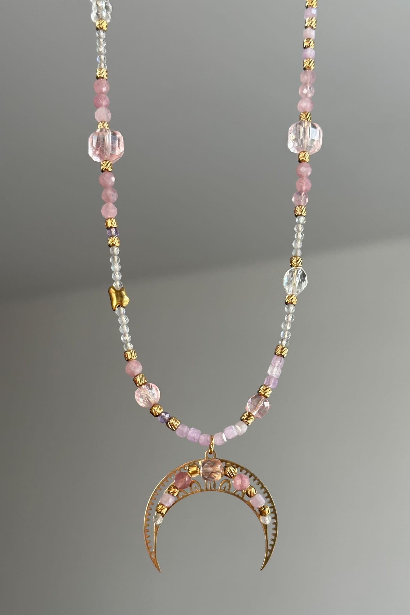 201 Unikat Różana lunula z kwarcu różowego, kryształu górskiego, berylu, labradorytu