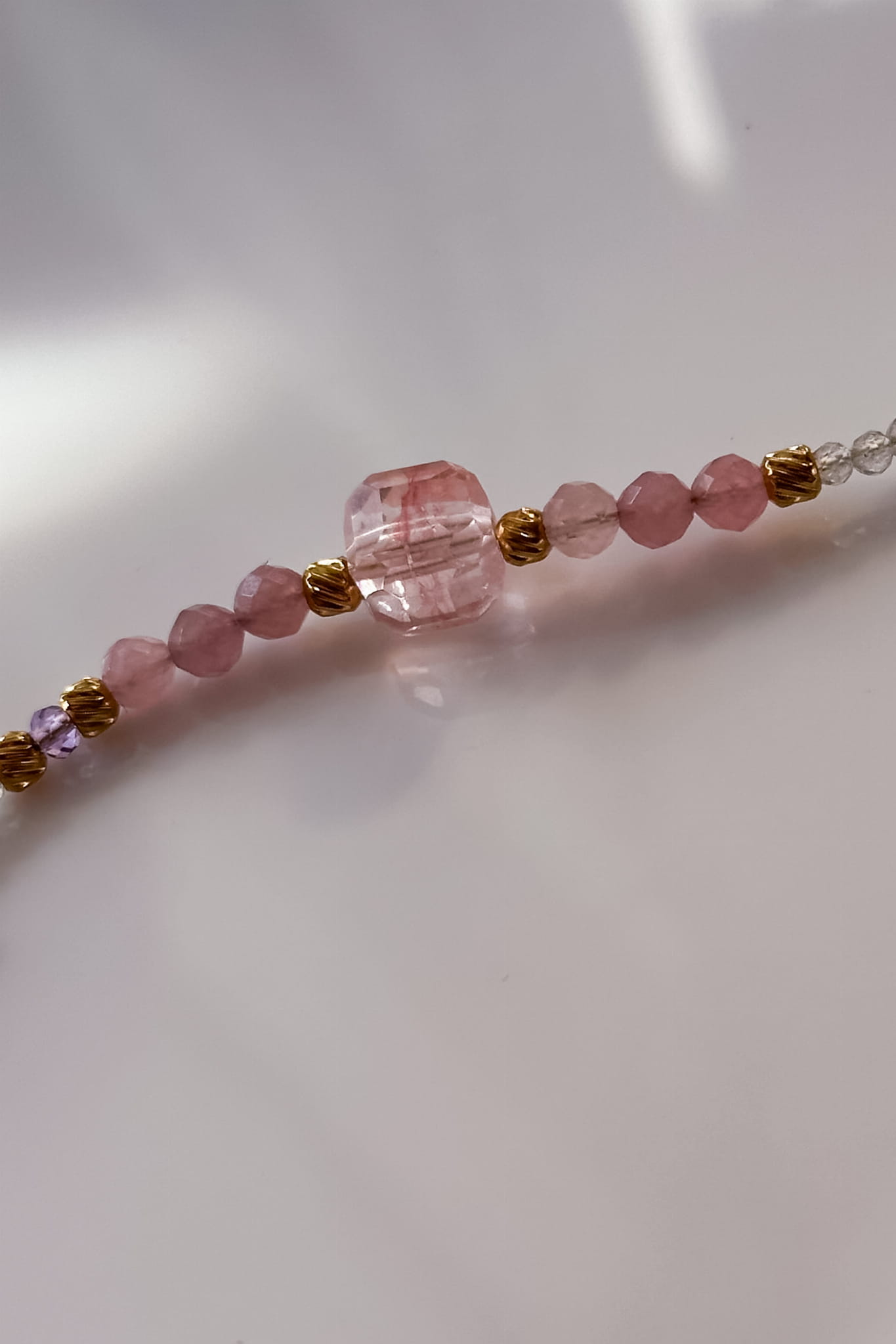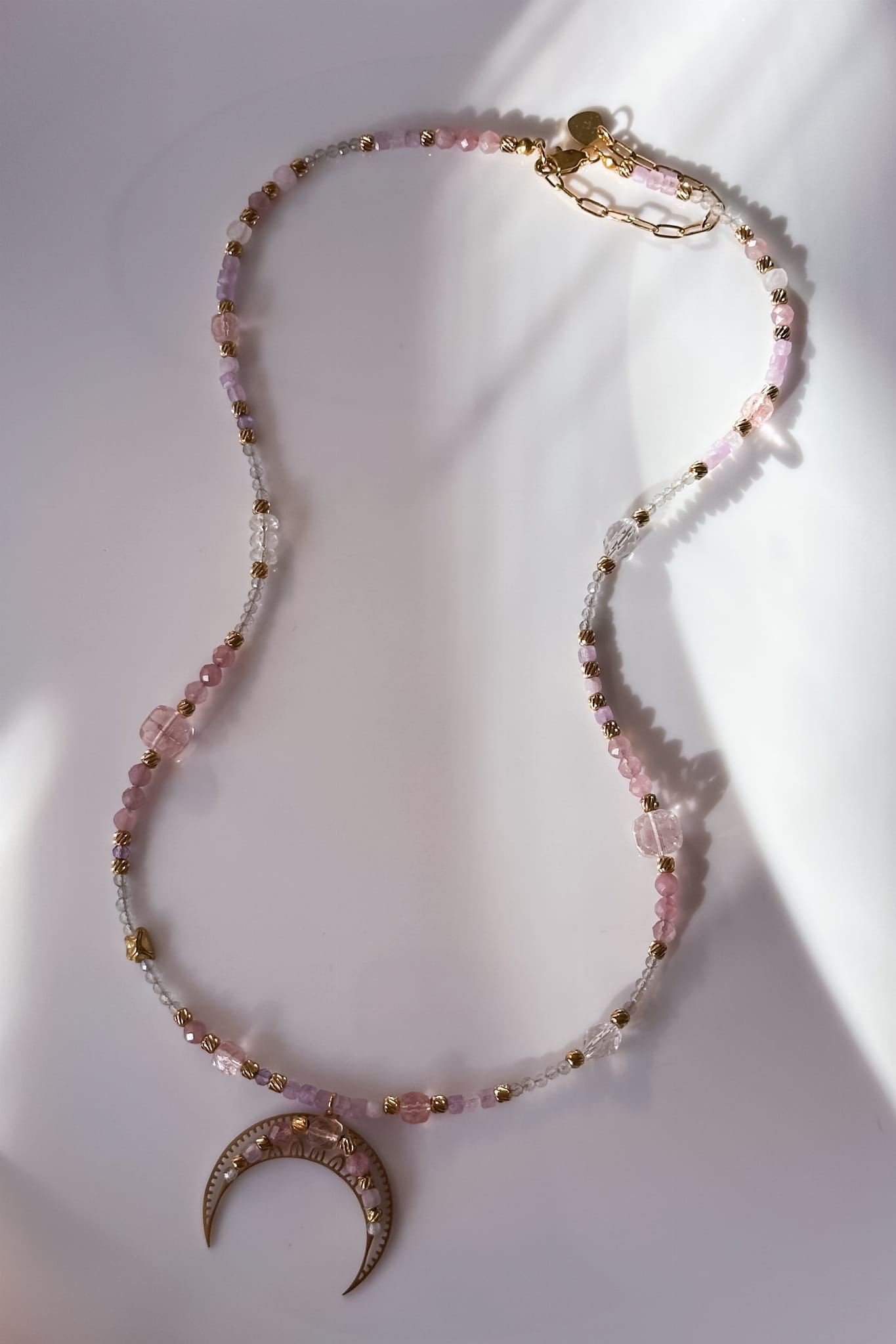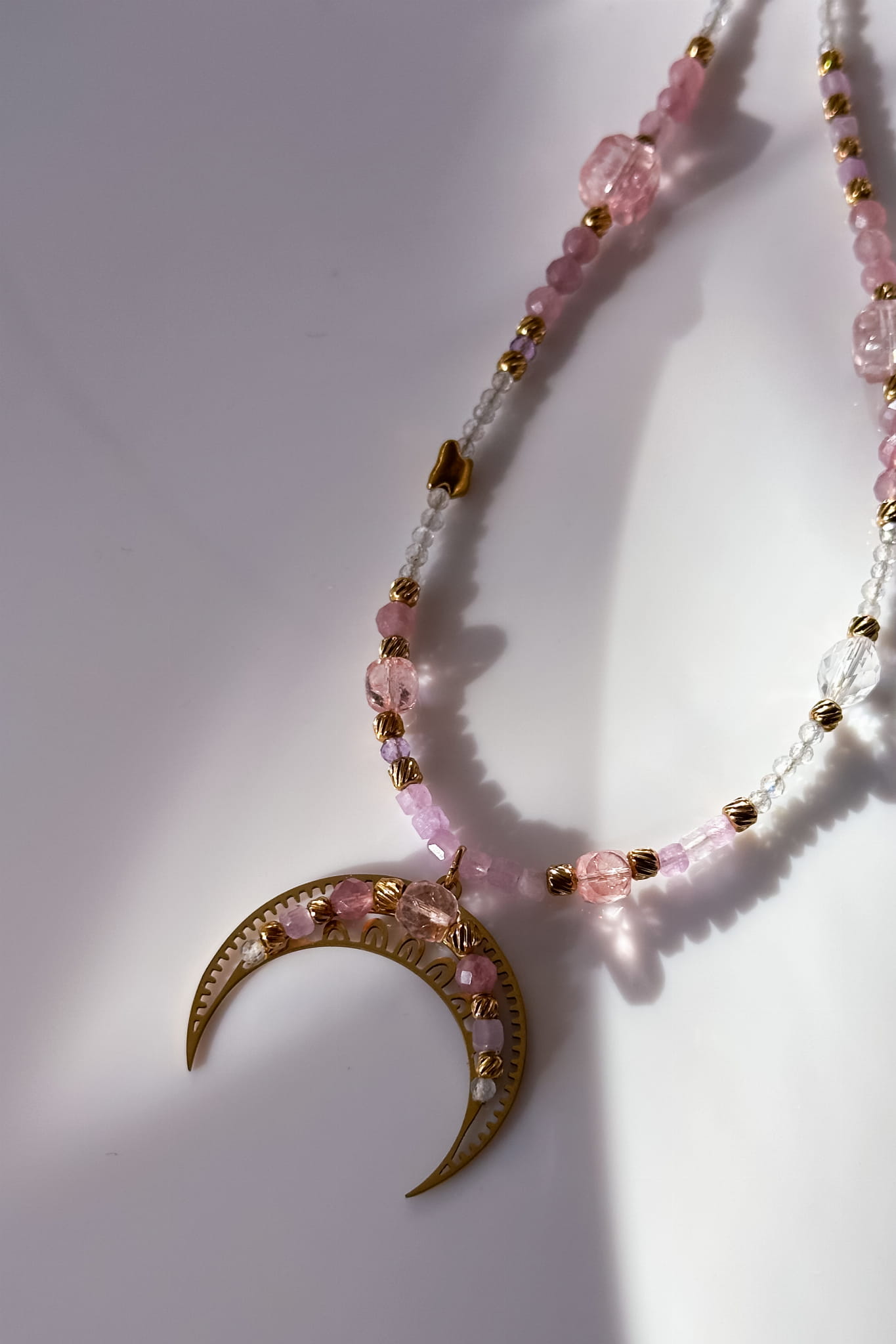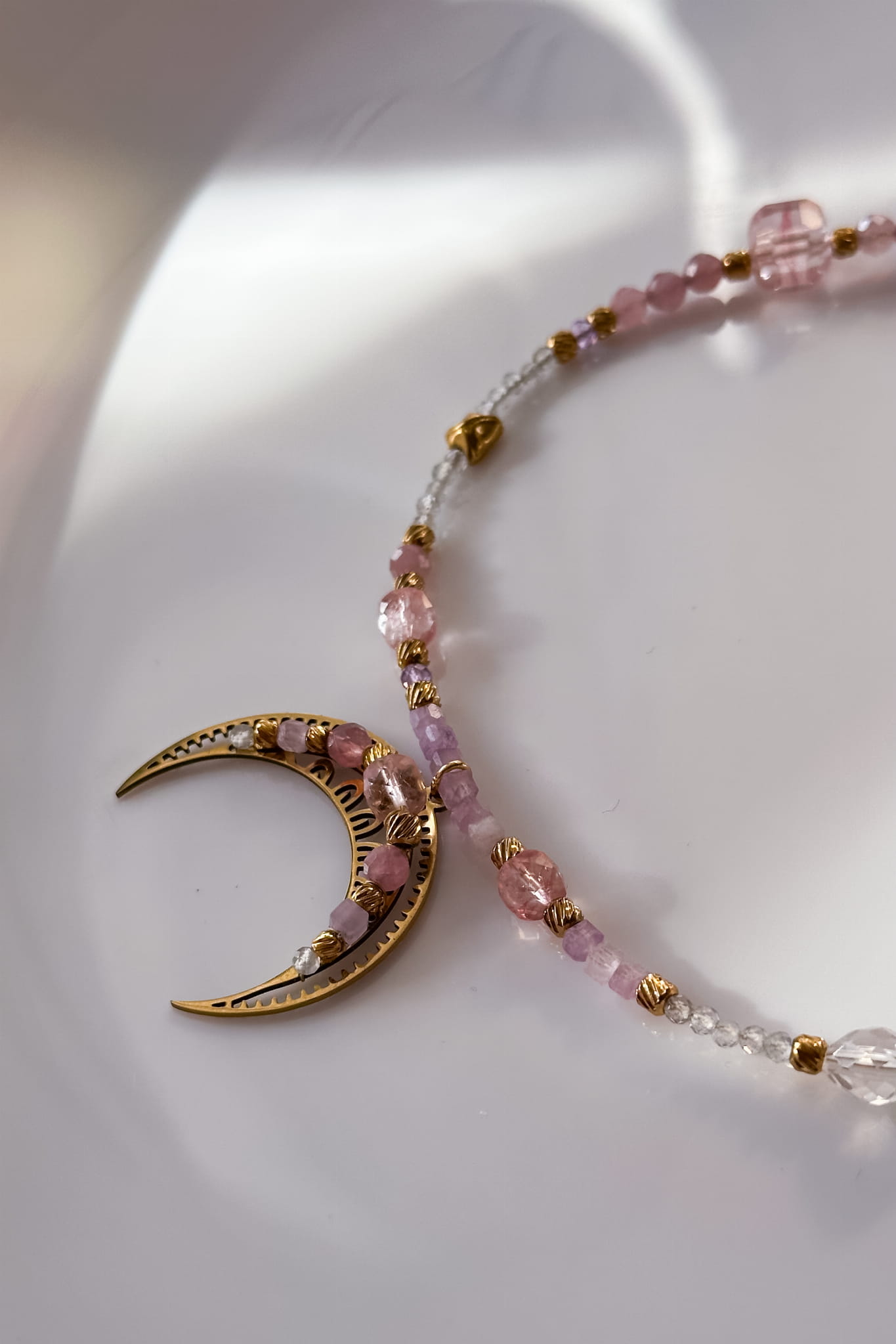 Różana lunula z kwarcu różowego, kryształu górskiego, berylu i labradorytu to subtelna opowieść o intuicji, łagodności i powrocie do siebie.
