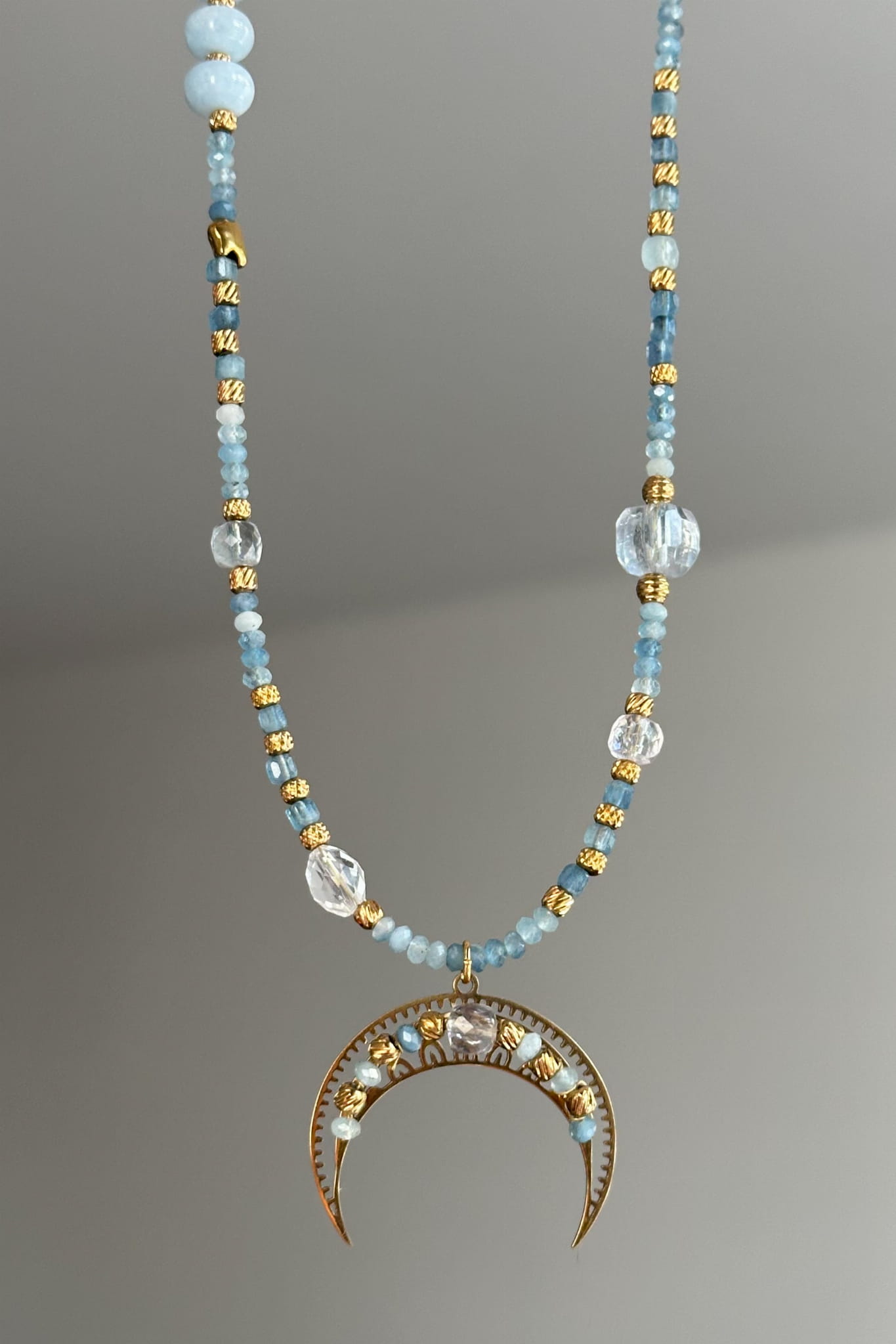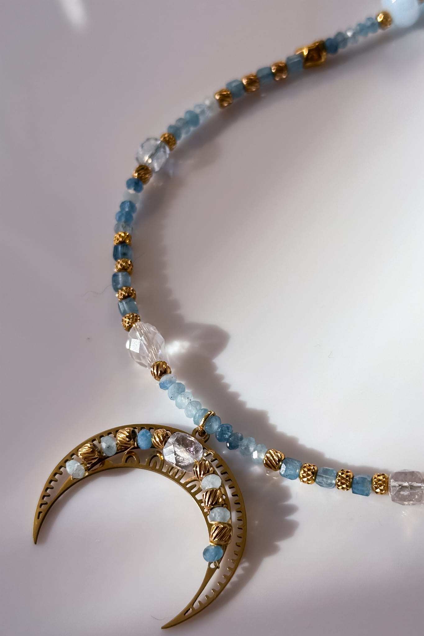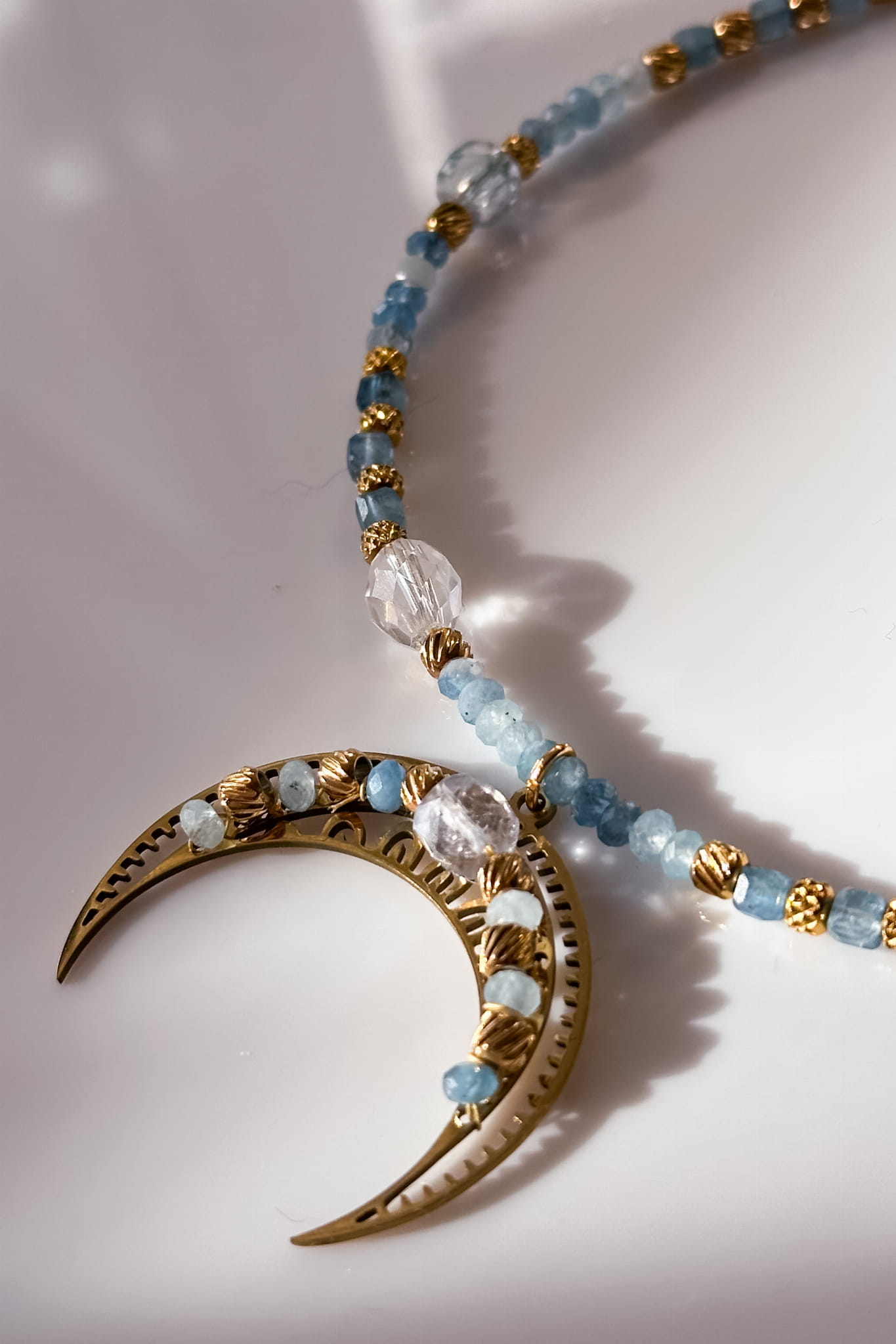 Błękitna lunula z akwamarynu, kryształu górskiego i jadeitu to opowieść o spokoju, klarowności i powrocie do własnego rytmu.