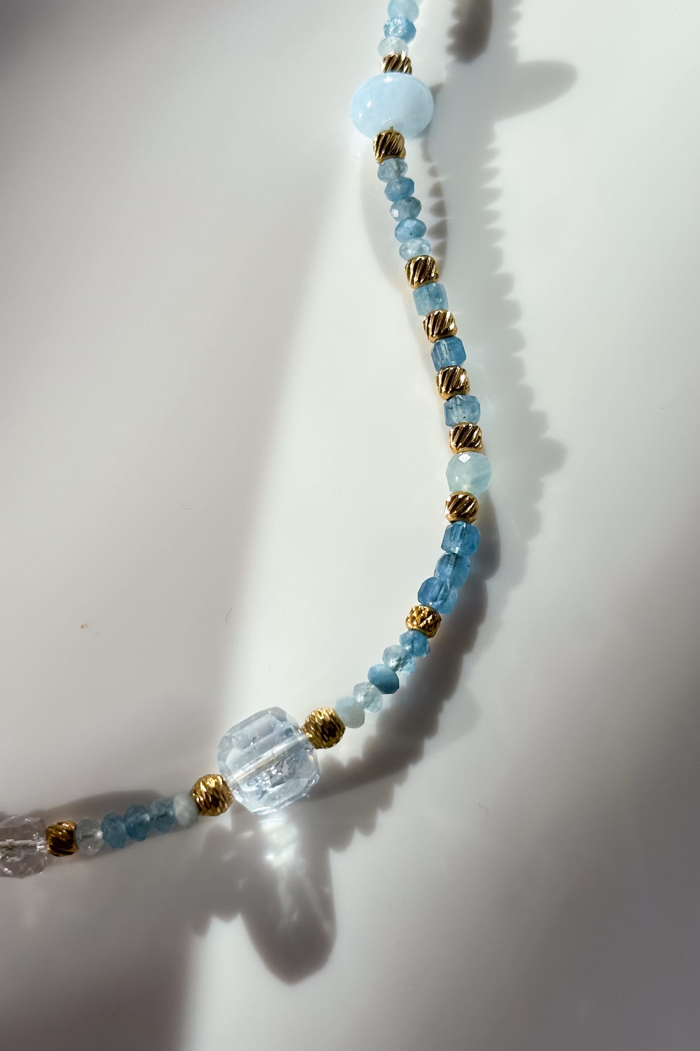 202 Unikat Błękitna Lunula z akwamarynu, kryształu górskiego, jadeitu z dodatkami w kolorze złota