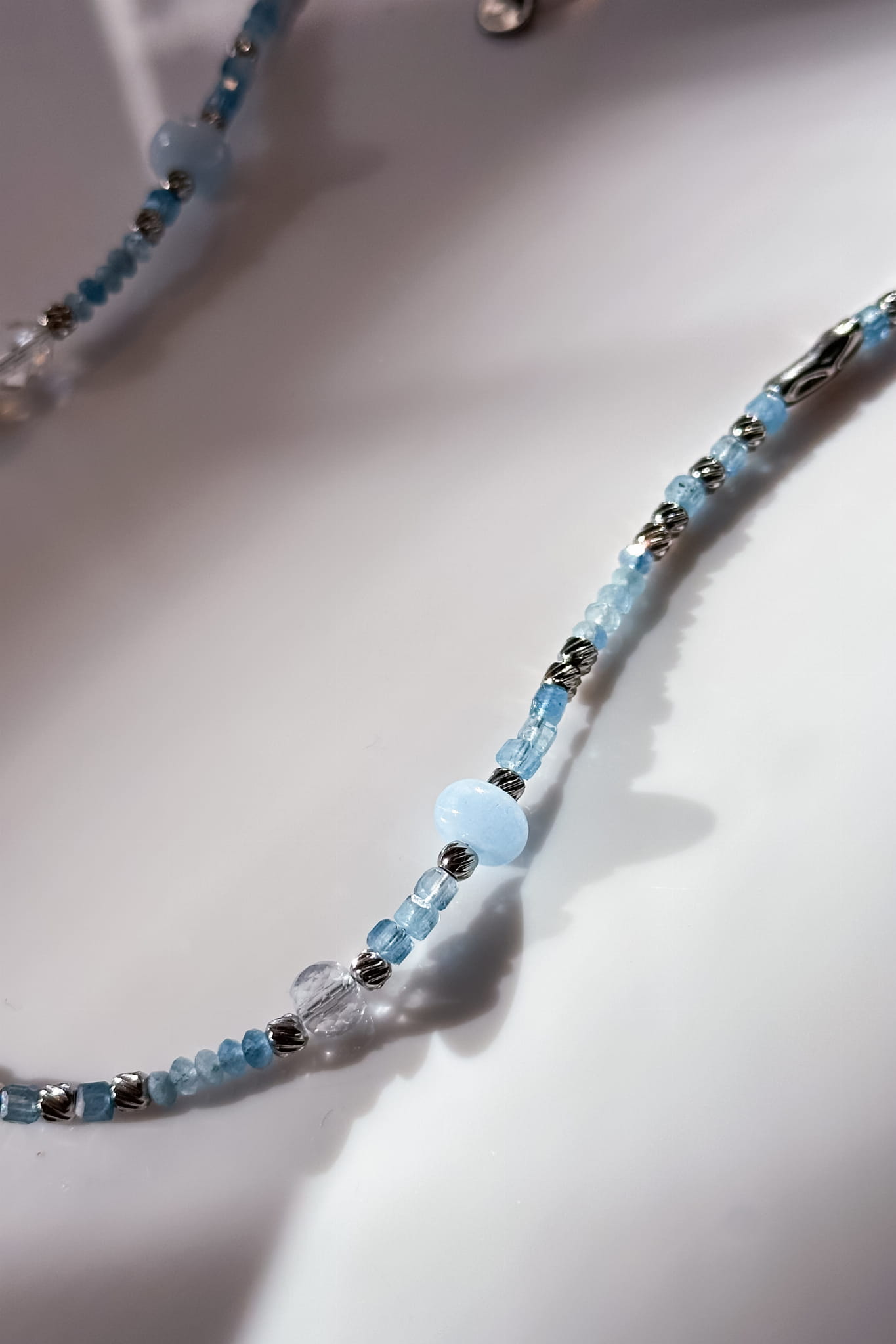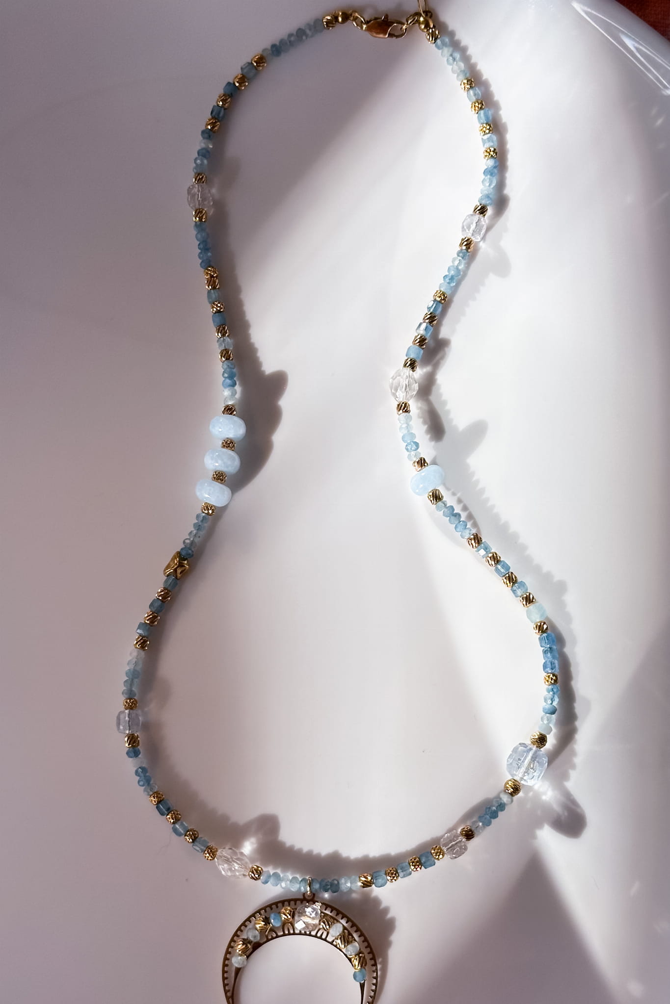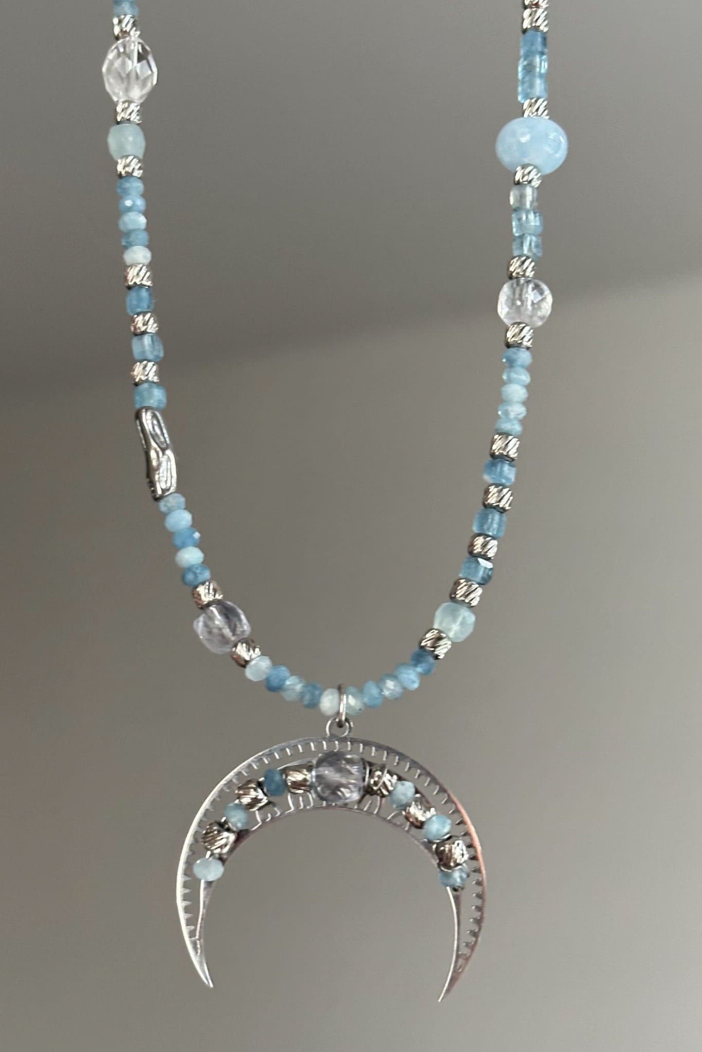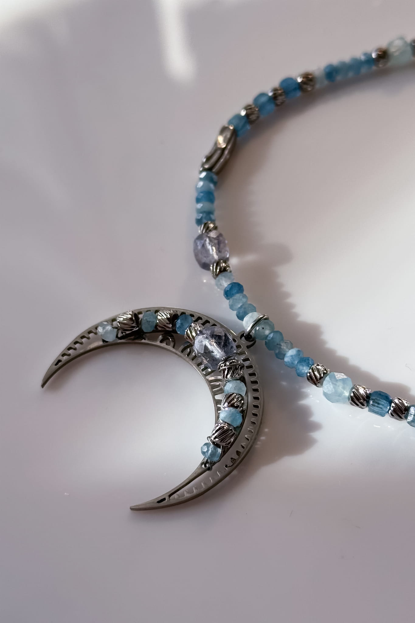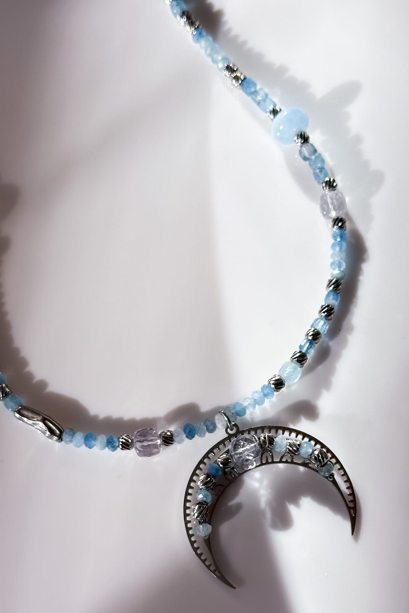 Błękitna lunula z akwamarynu, kryształu górskiego i jadeitu w srebrnym wykończeniu to spokojna opowieść o klarowności i powrocie do siebie.