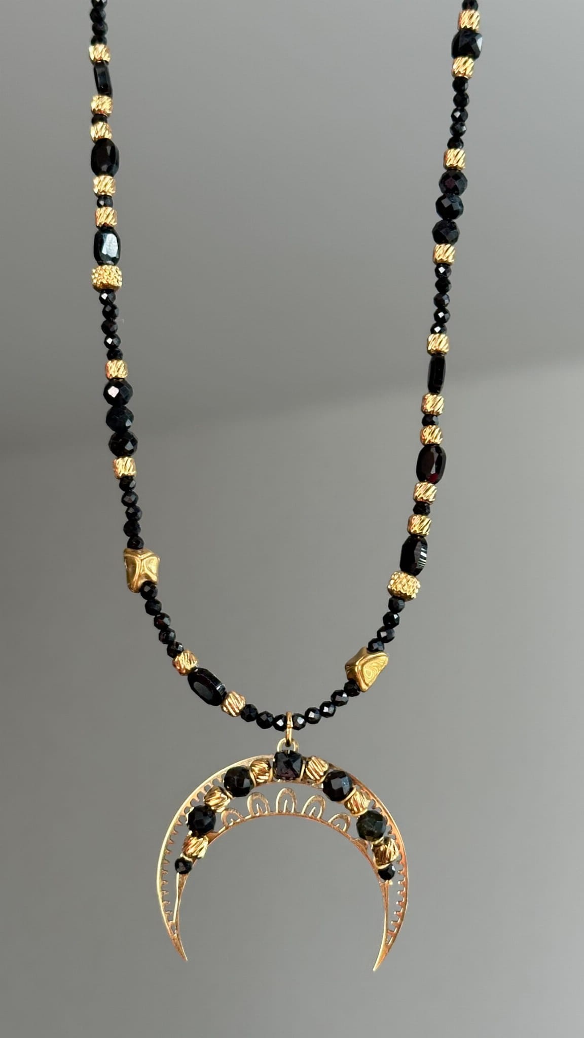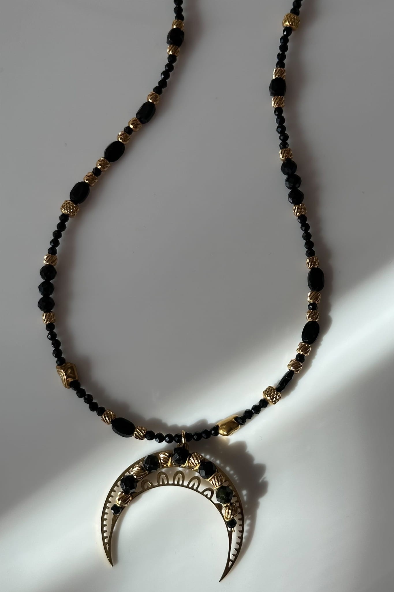 Złota lunula z czarnym turmalinem to symbol siły, spokoju i wewnętrznej pewności.