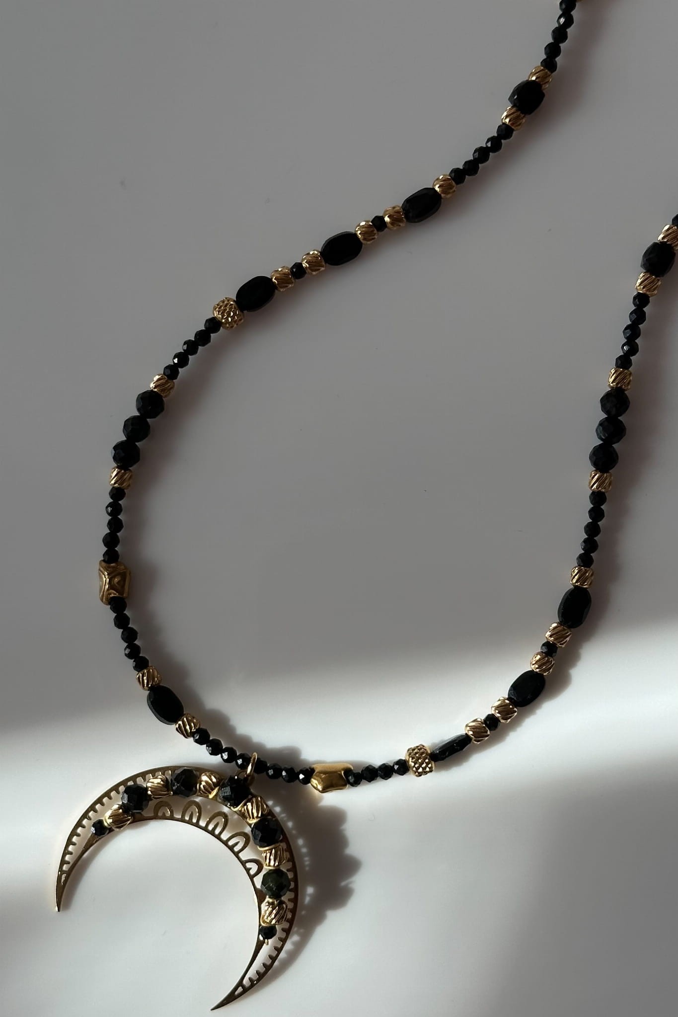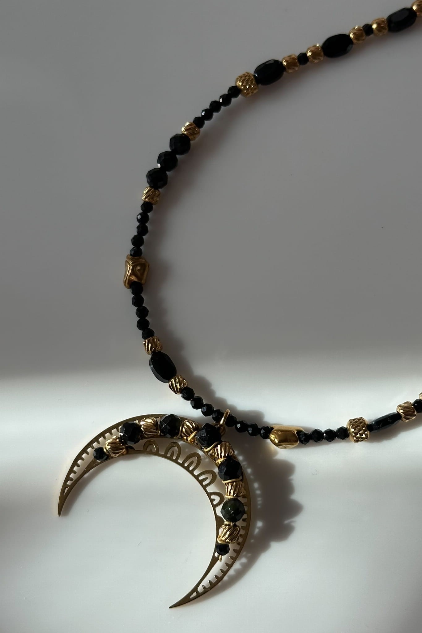 Złota lunula otulona czarnym turmalinem ma w sobie głębię i światło jednocześnie. To połączenie siły i wewnętrznego spokoju, które nie potrzebuje uzasadnienia. Nie przyciąga uwagi krzykiem, tylko obecnością.