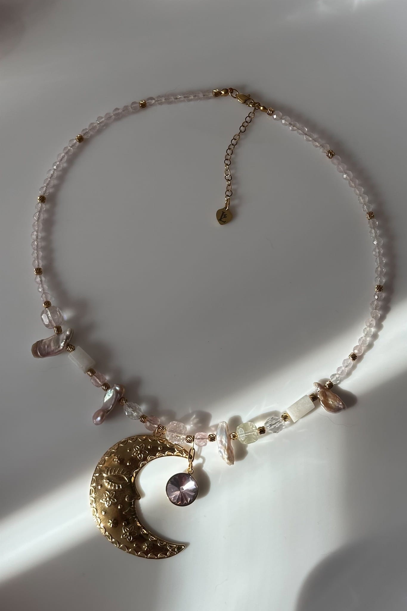 Złoty księżyc przyciąga spojrzenia, ale to detale budują całość. Nieregularne perły, świetliste kamienie i poruszające się łańcuszki tworzą kompozycję, która żyje razem z Tobą. Subtelna magia zamknięta w formie, która nie próbuje być idealna.