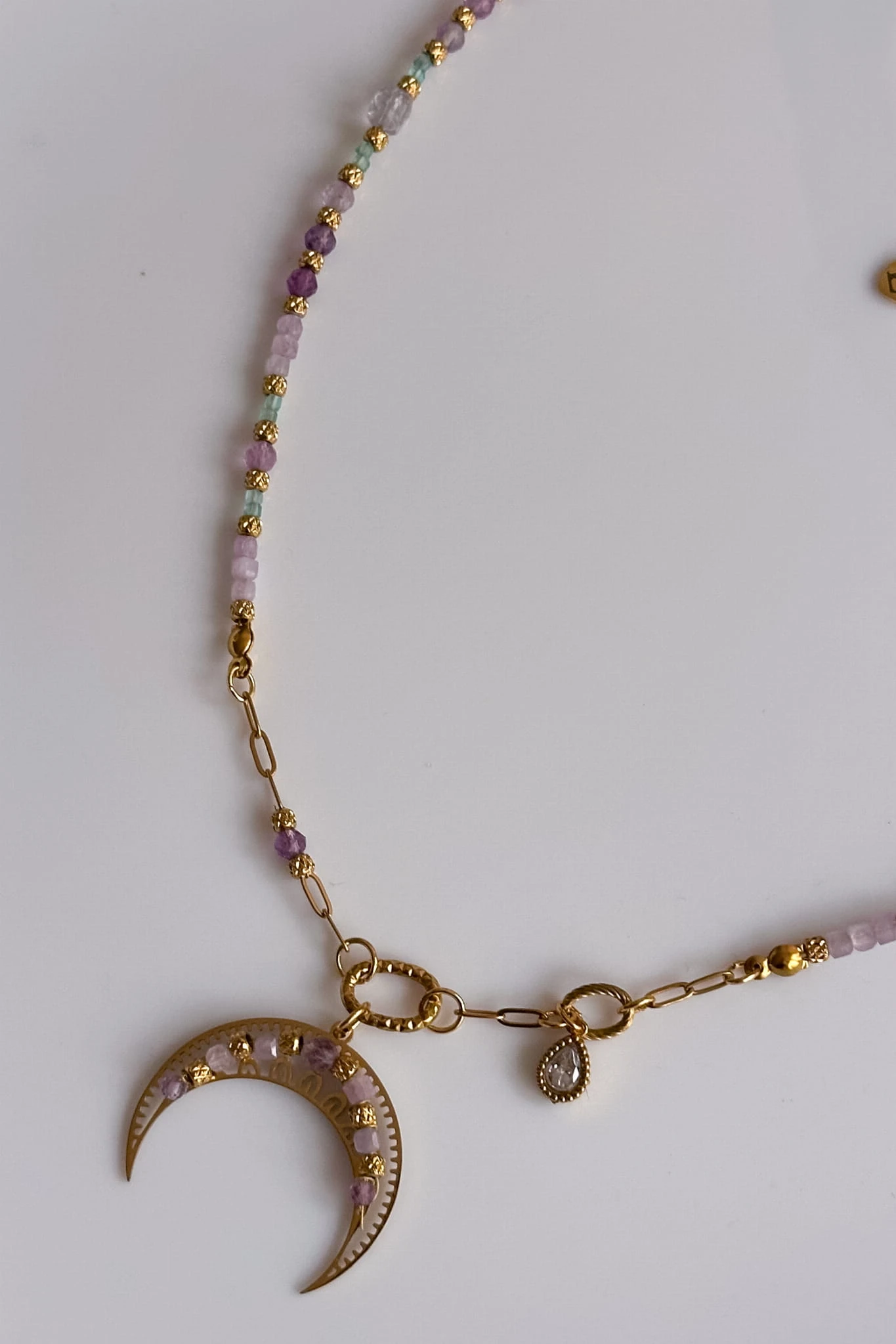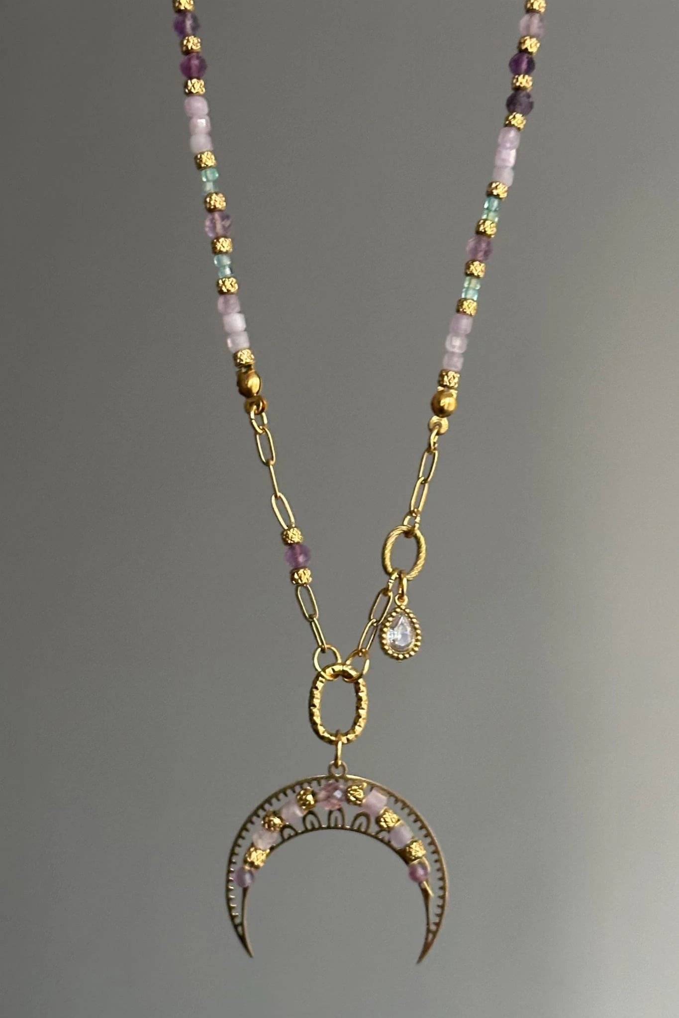 Lunula z kunzytem, fluorytem, apatytem i berylem to symbol lekkości, spokoju i wewnętrznej harmonii.