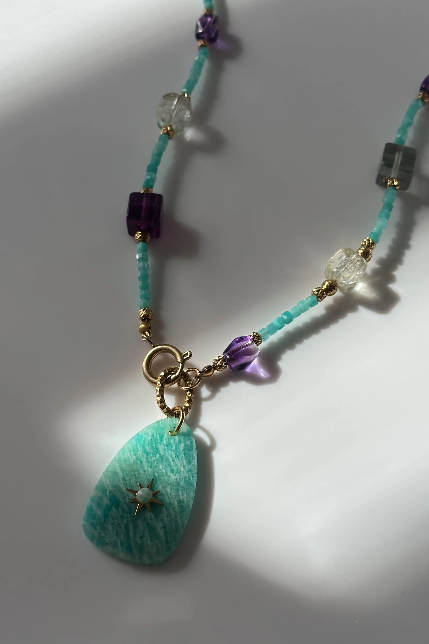 Naszyjnik z amazonitu, fluorytu, cytrynu, ametystu i berylu to połączenie spokoju, światła i lekkości.