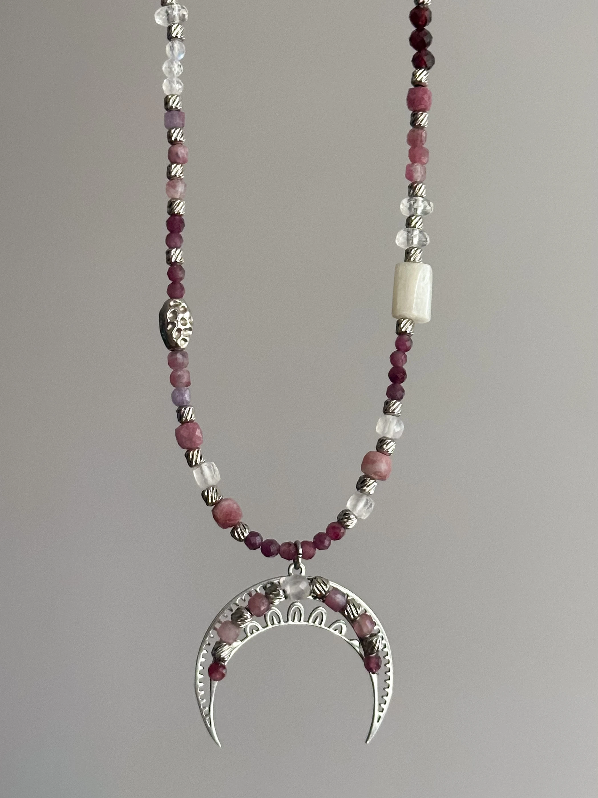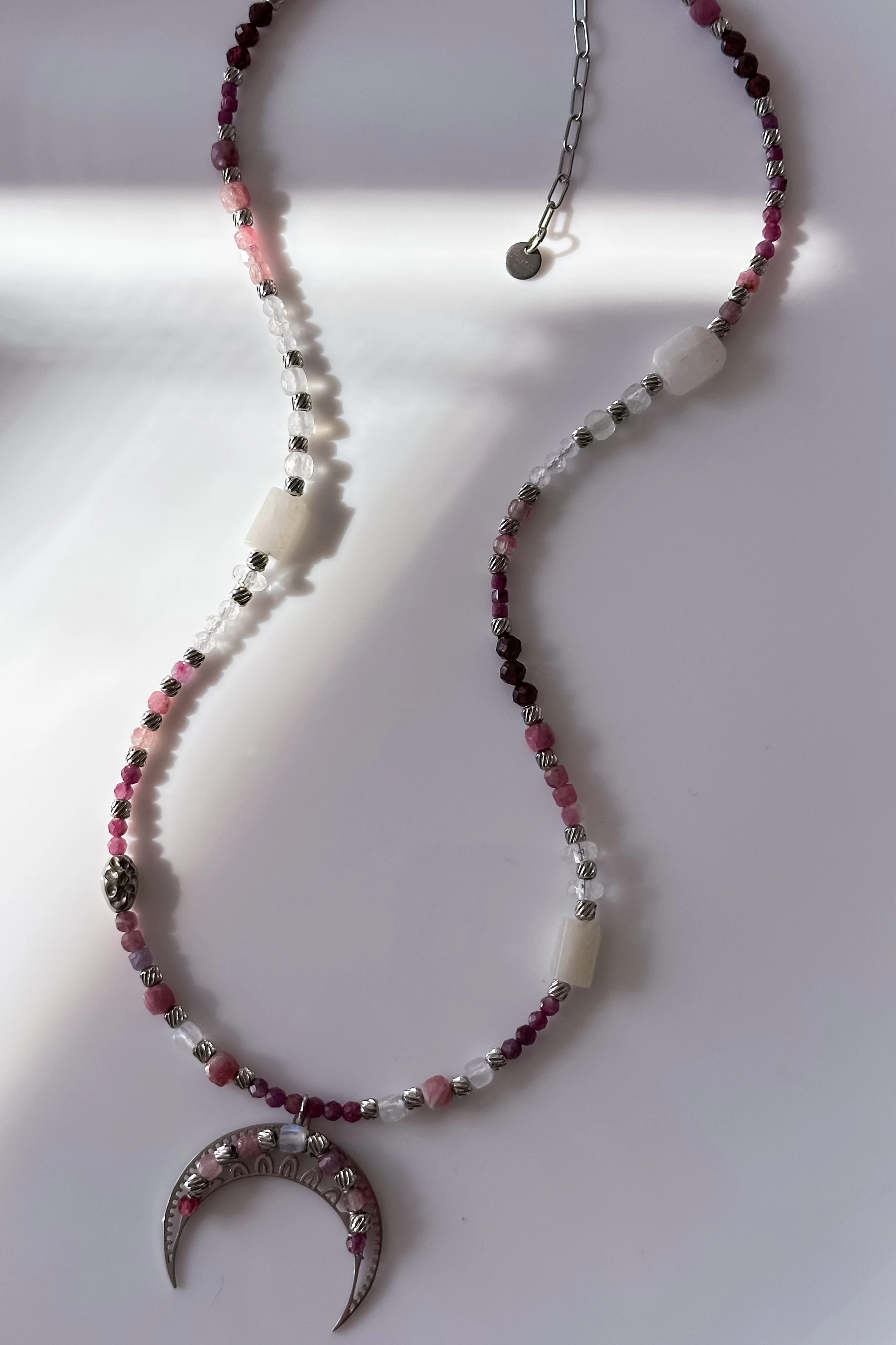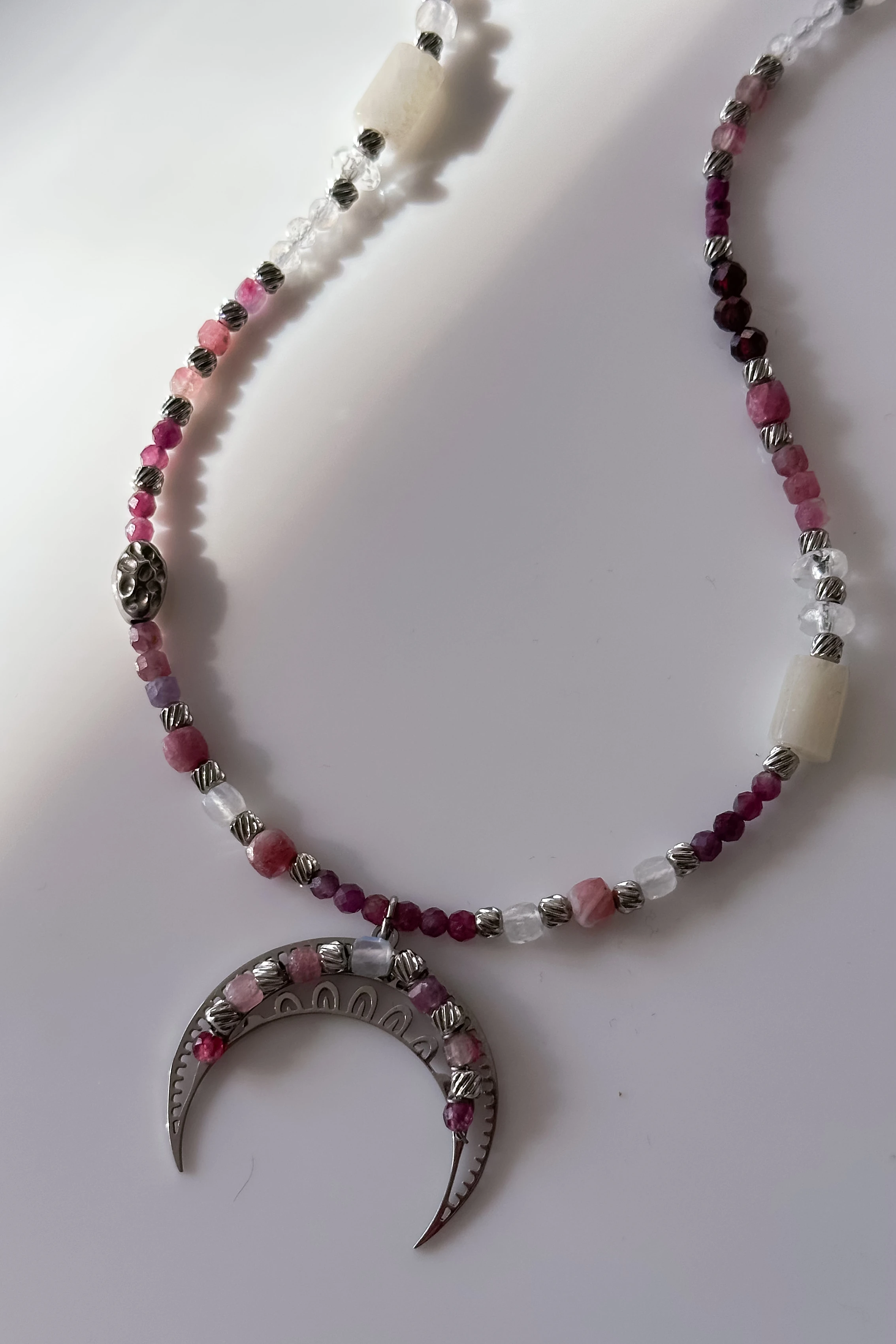 215 Unikat Lunula ukochania z granatu, rubinu, różowego turmalinu, kryształu górskiego, kamienia księżycowego