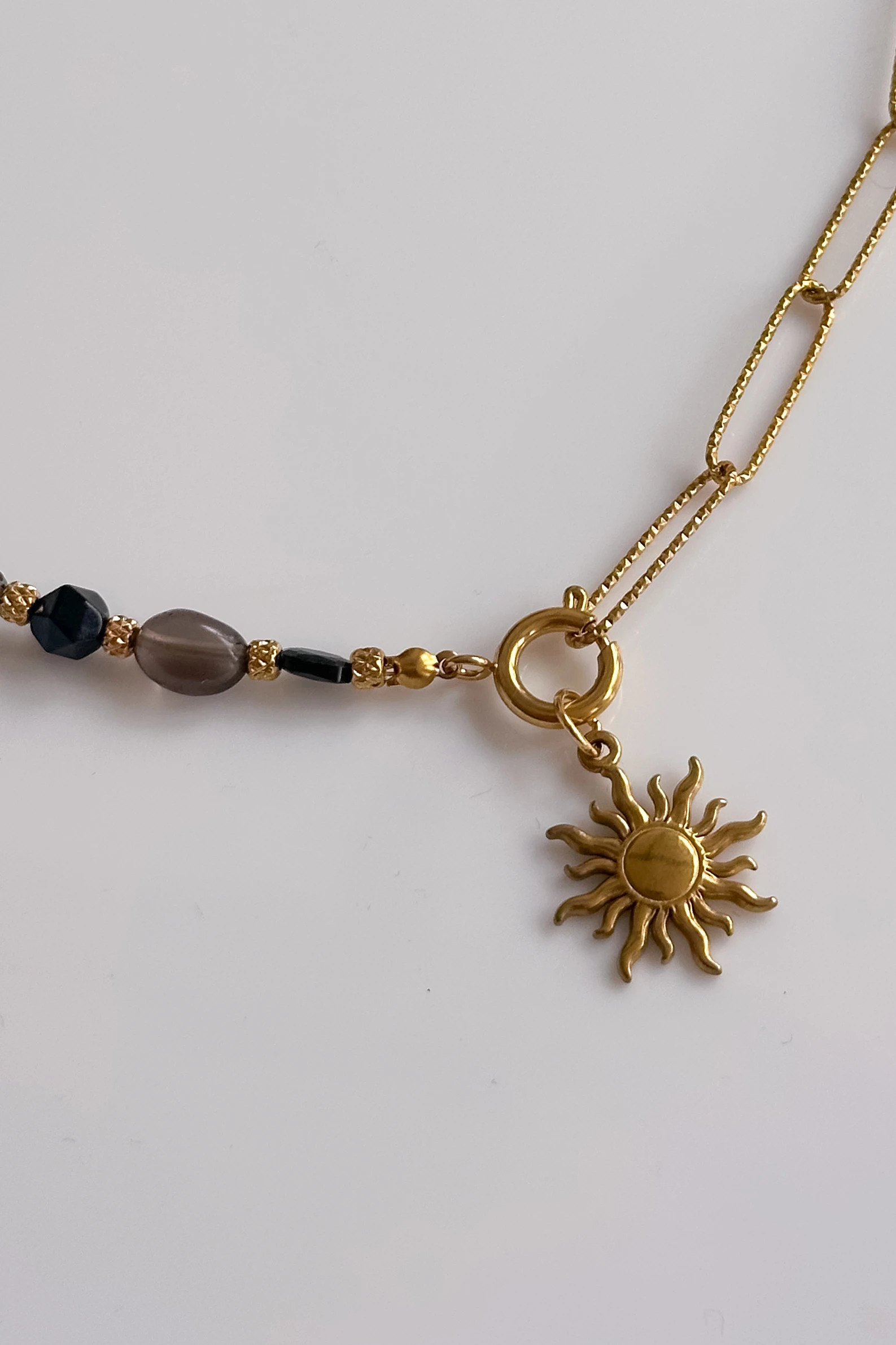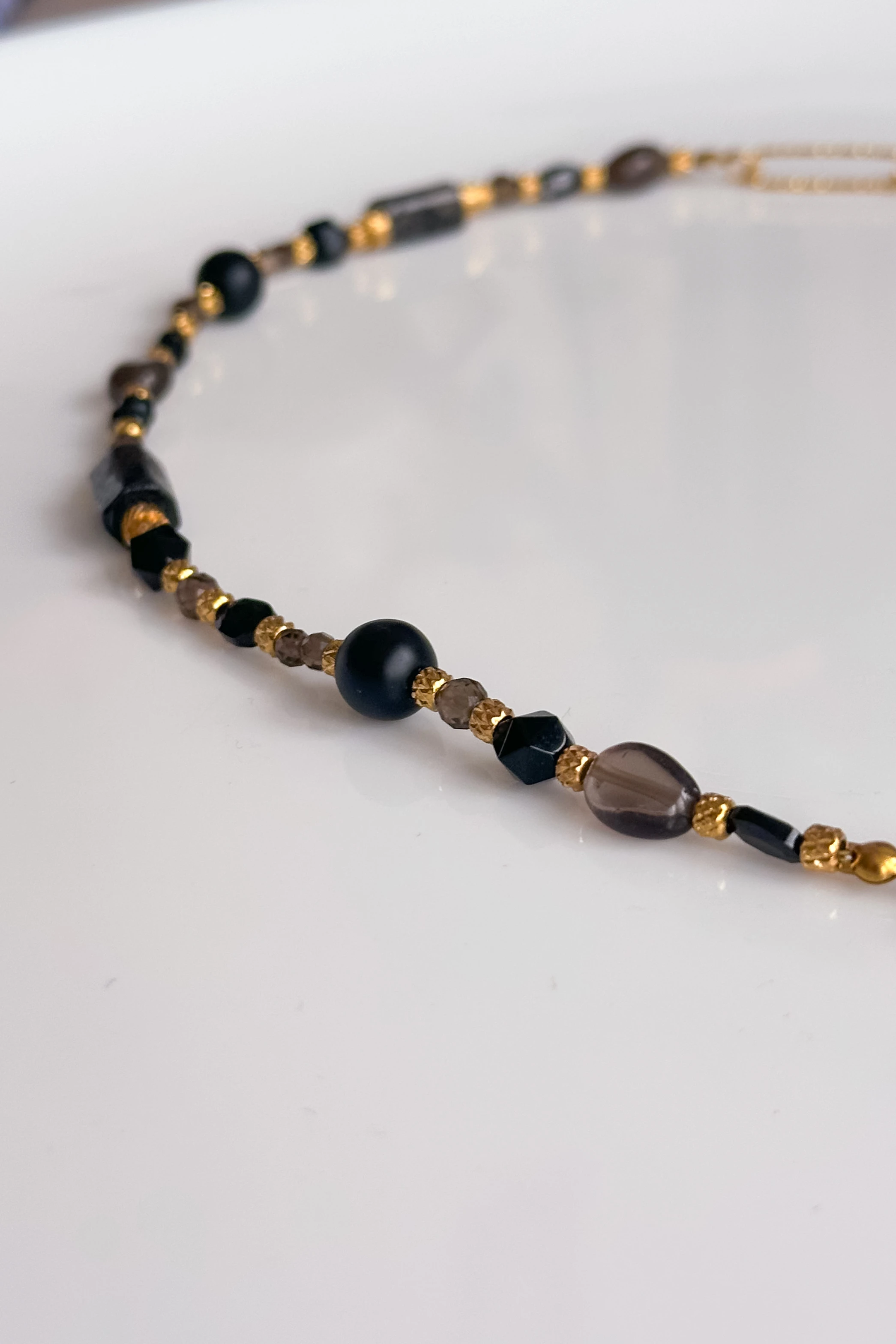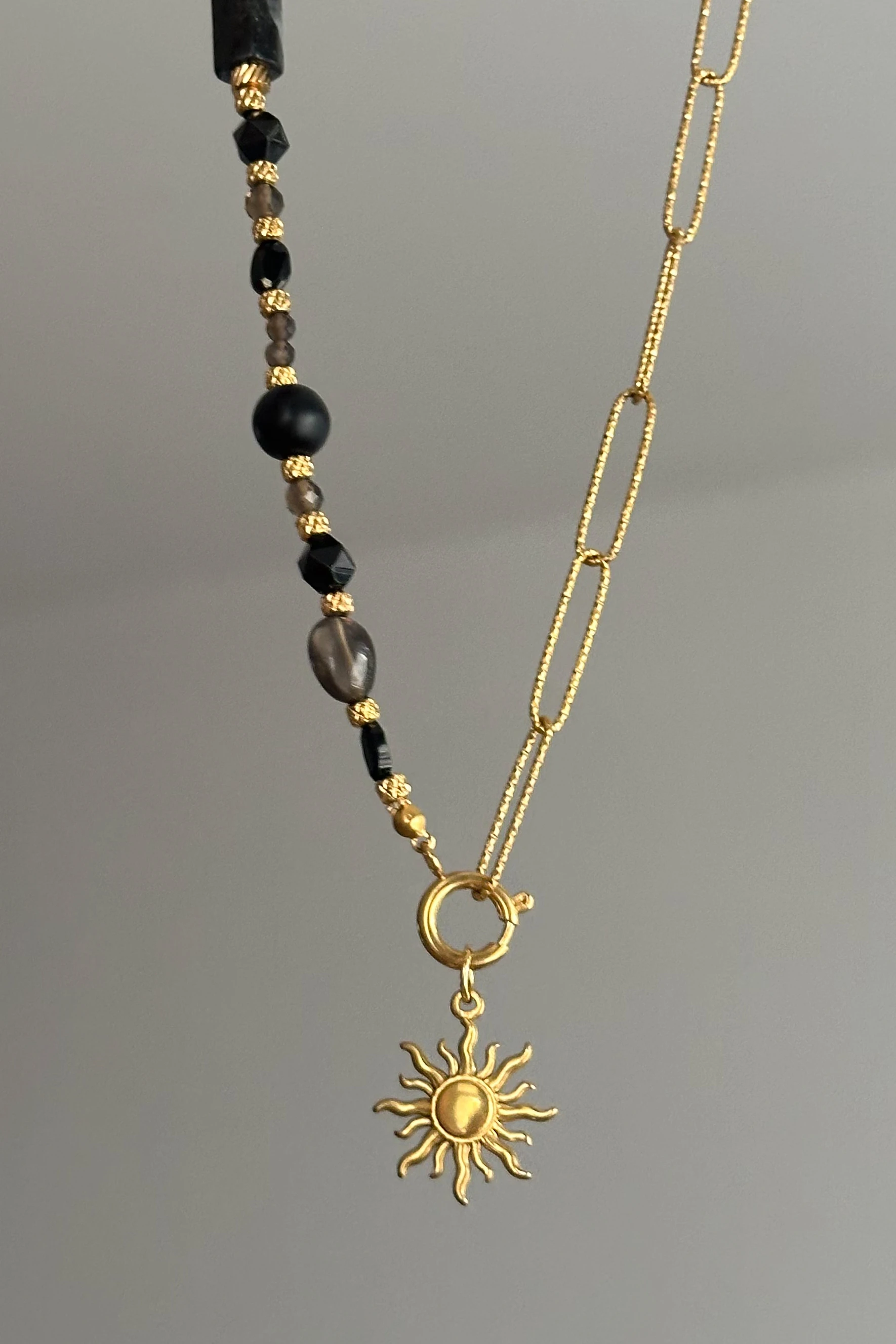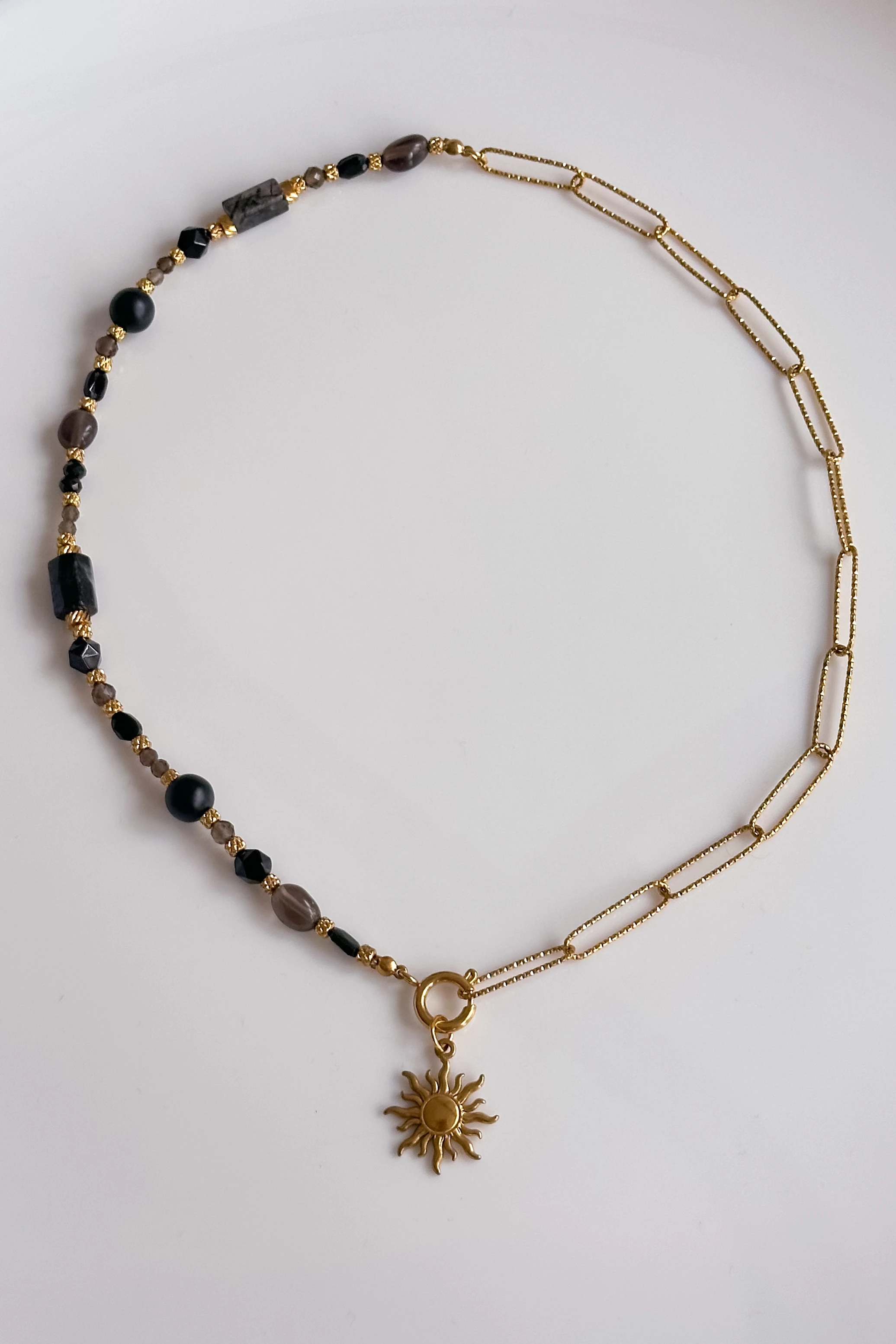 216 Unikat Słońce Mocy - naszyjnik z kamieniami: kwarc dymny, czarny turmalin, onyks, kwarc z rutylem