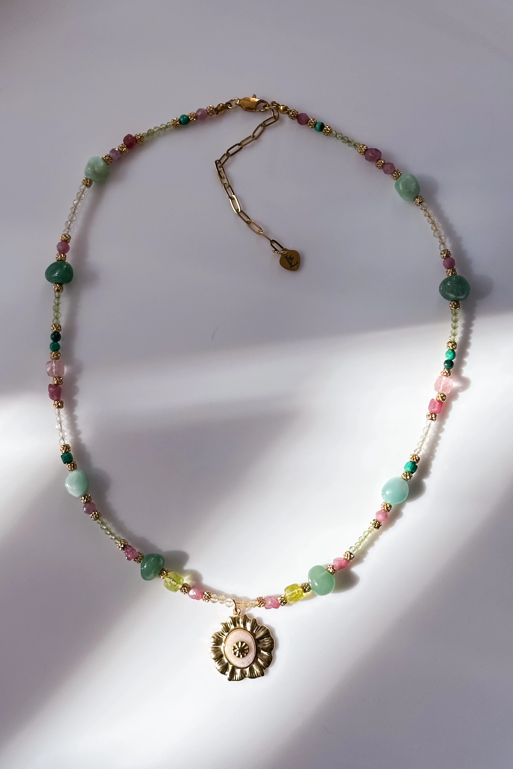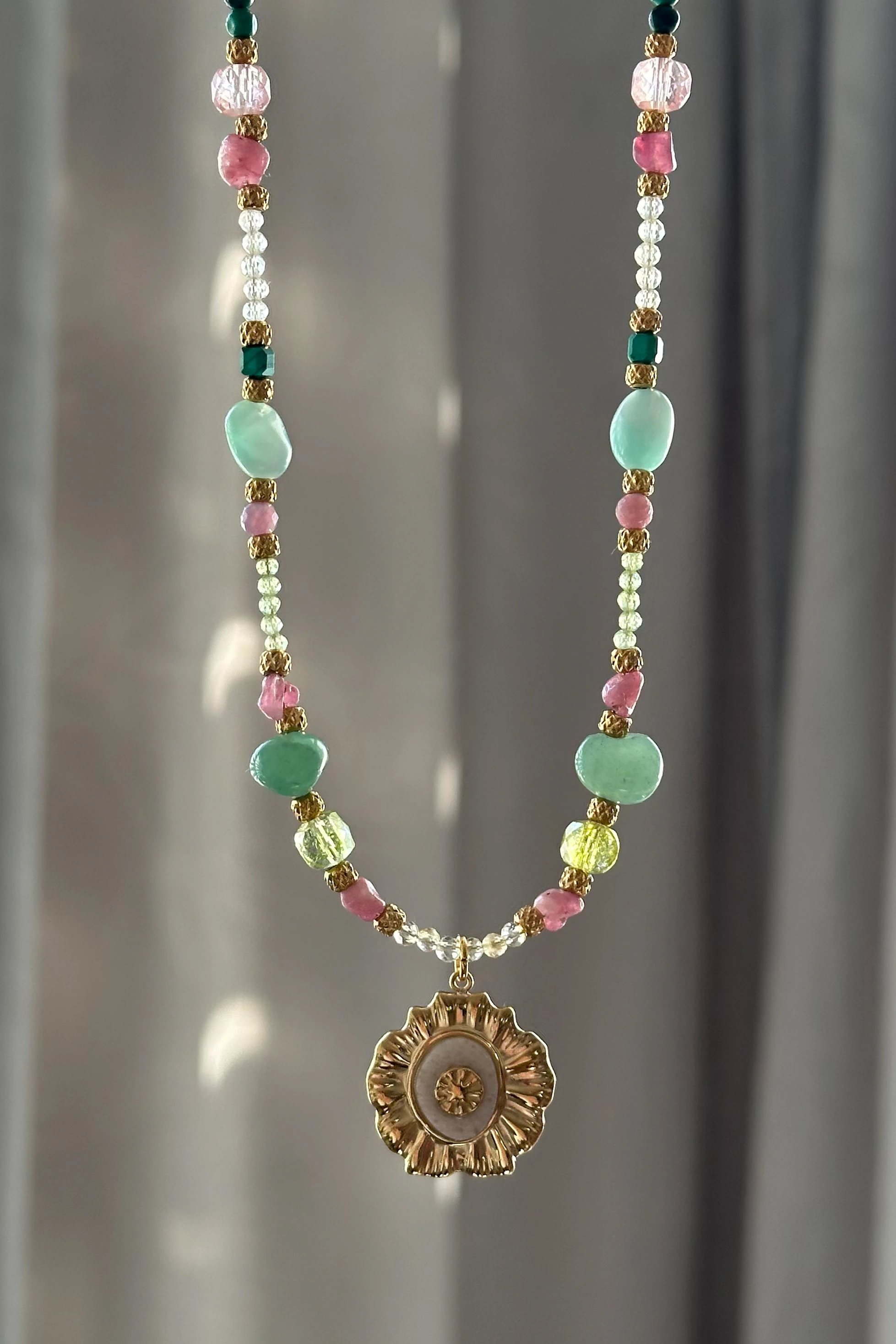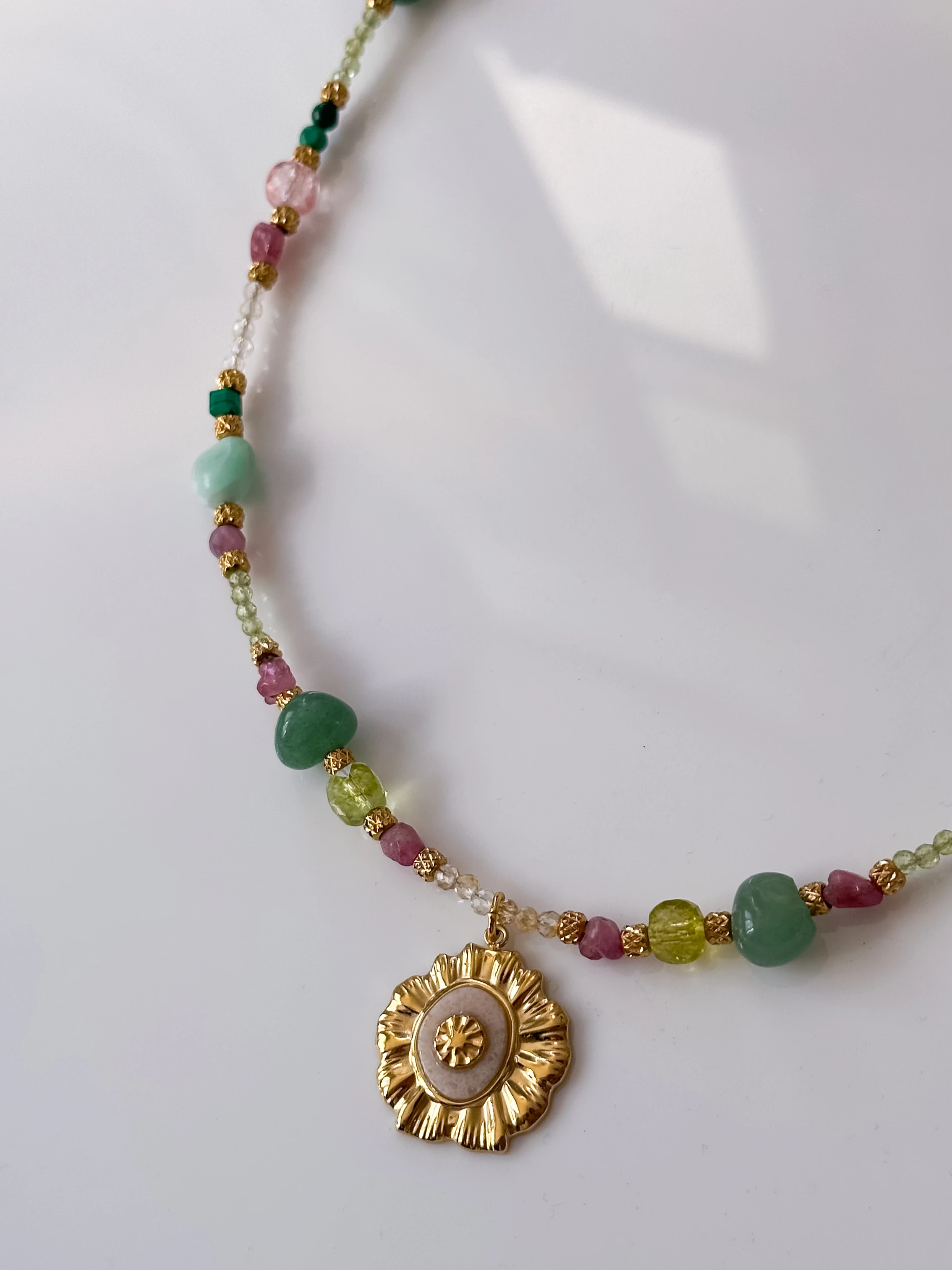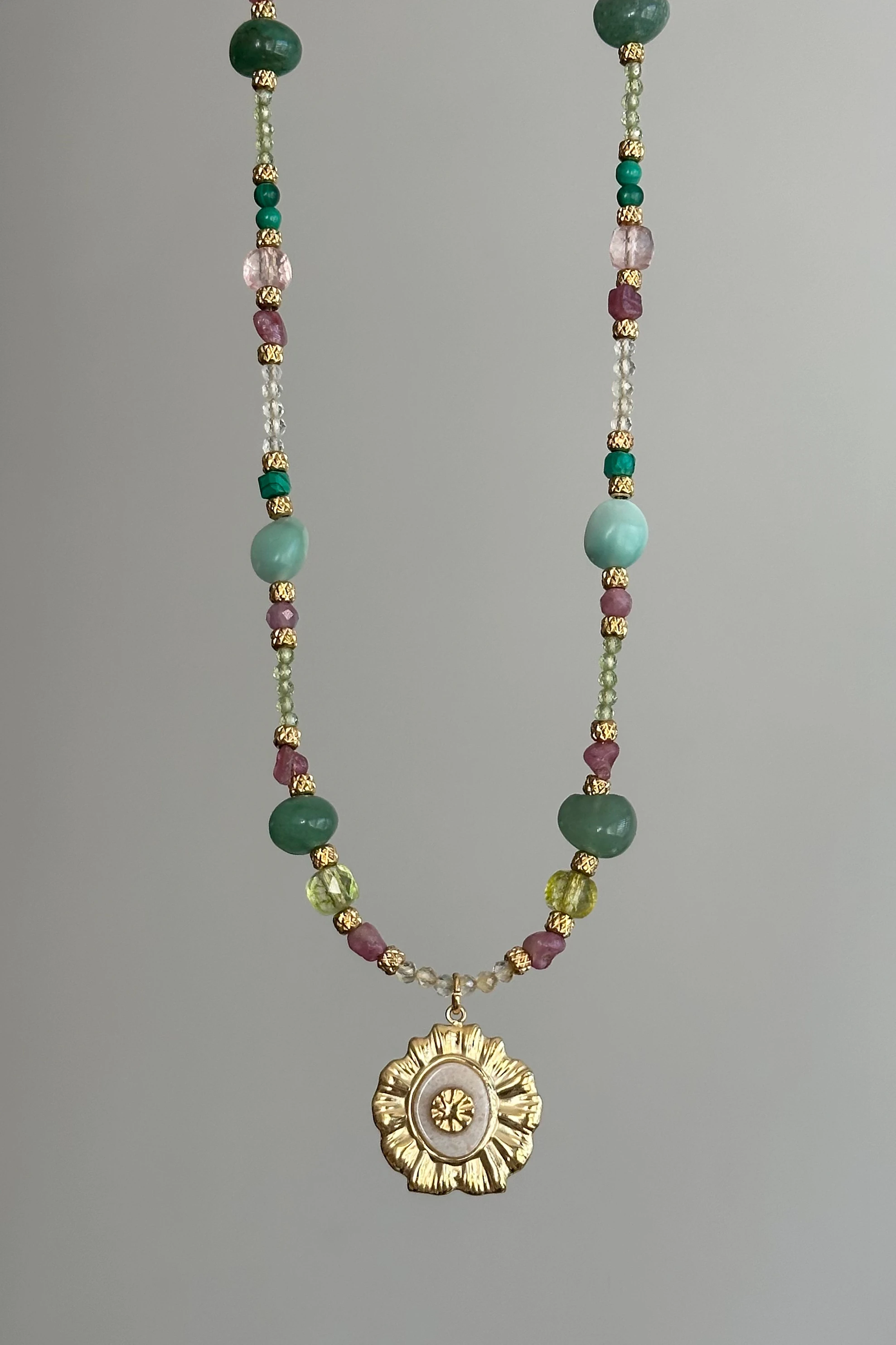 225 Unikat Piwonia naszyjnik z motywem kwiatowym z kamieniami cytryn, oliwin, różowy turmalin, zielony awenturyn, beryl, malachit