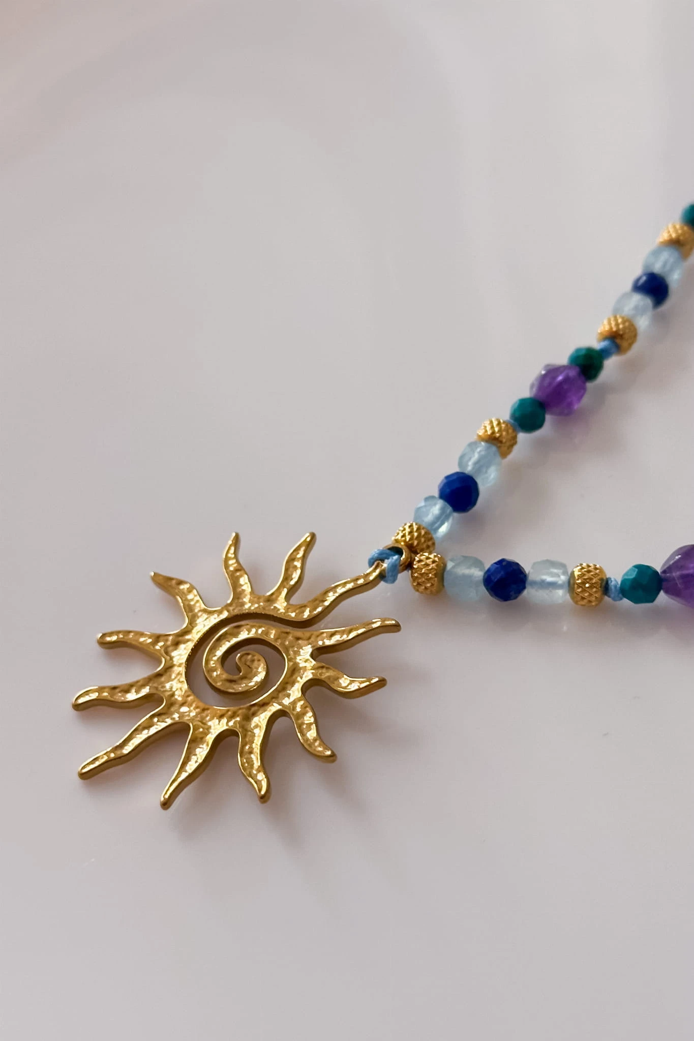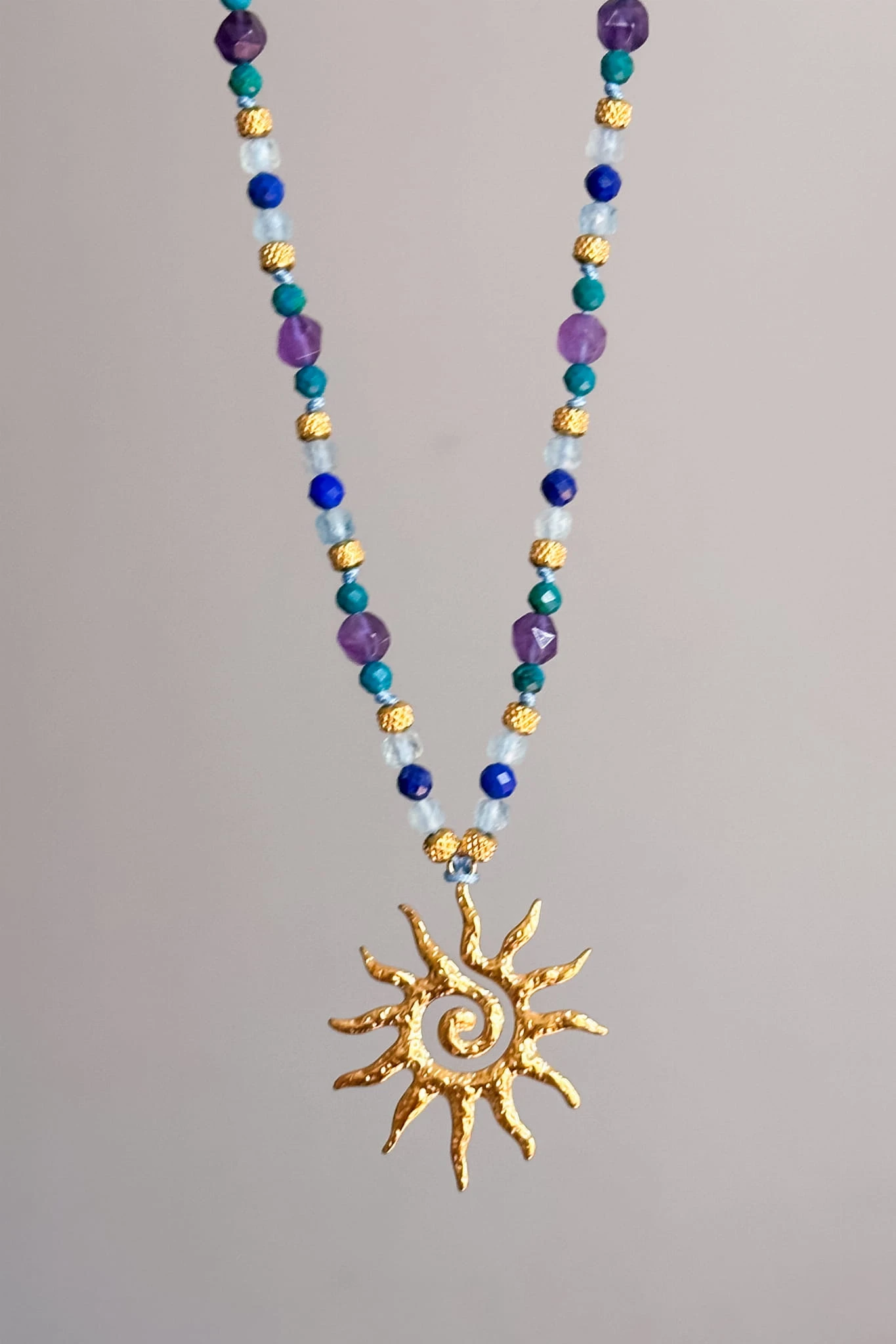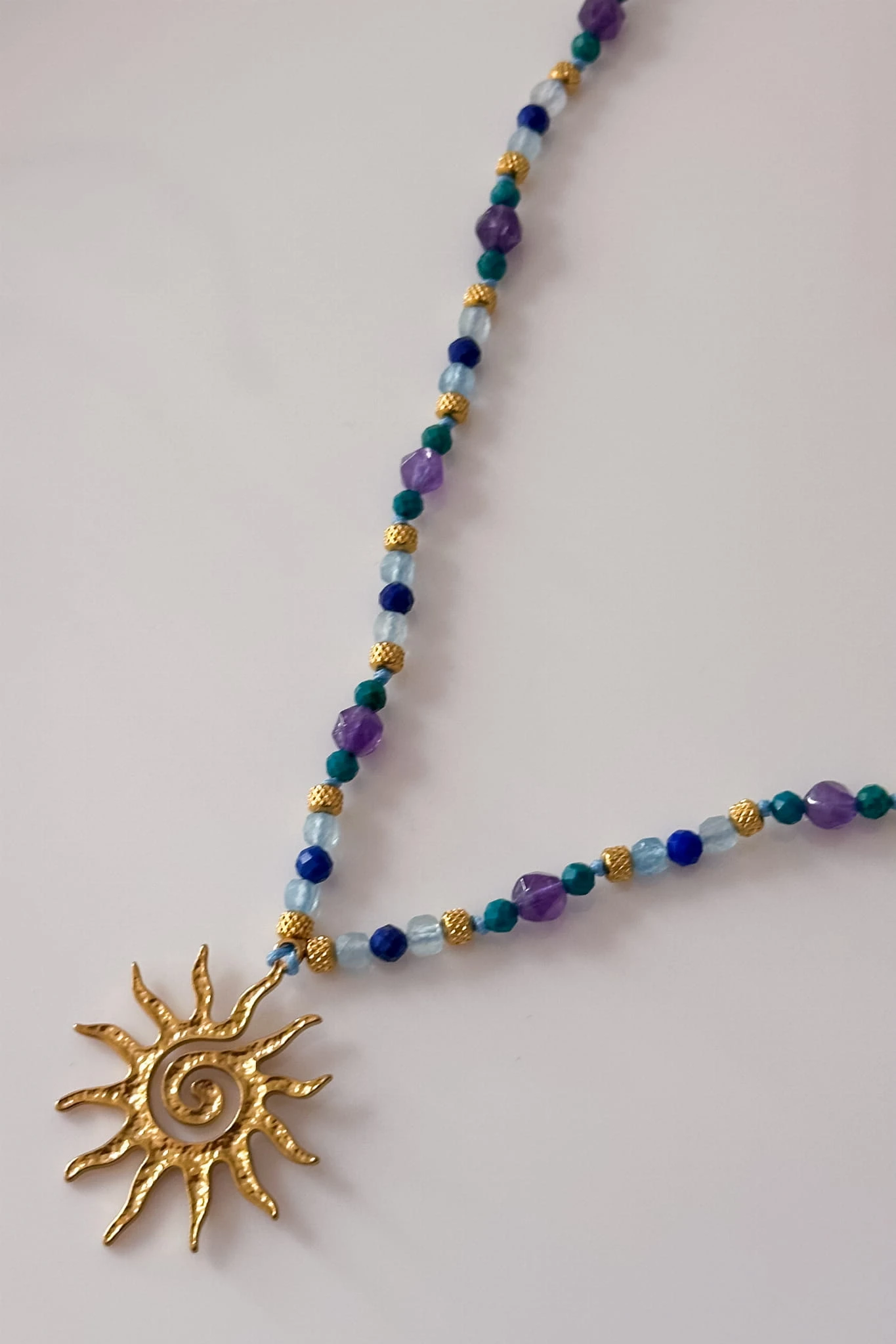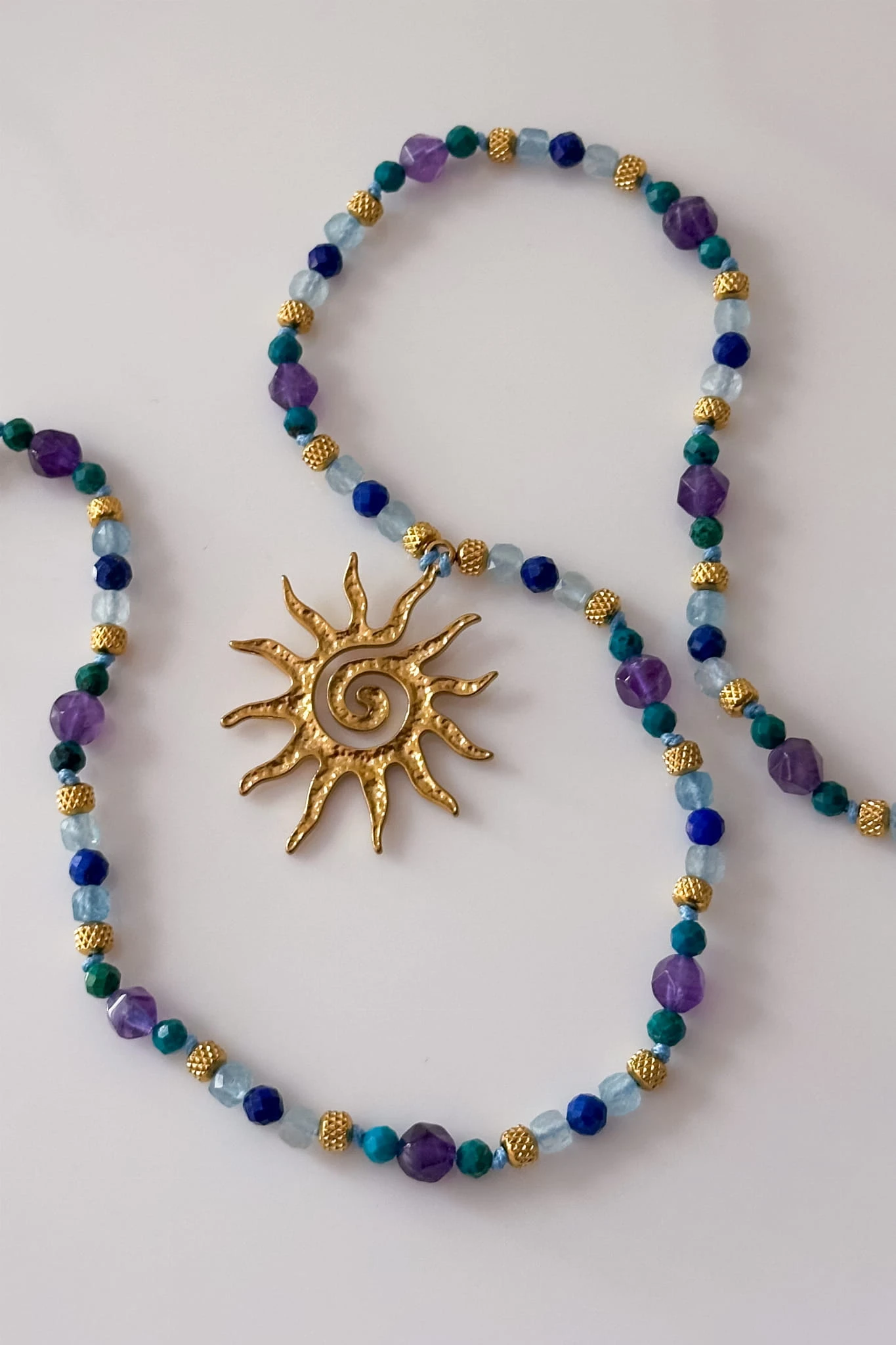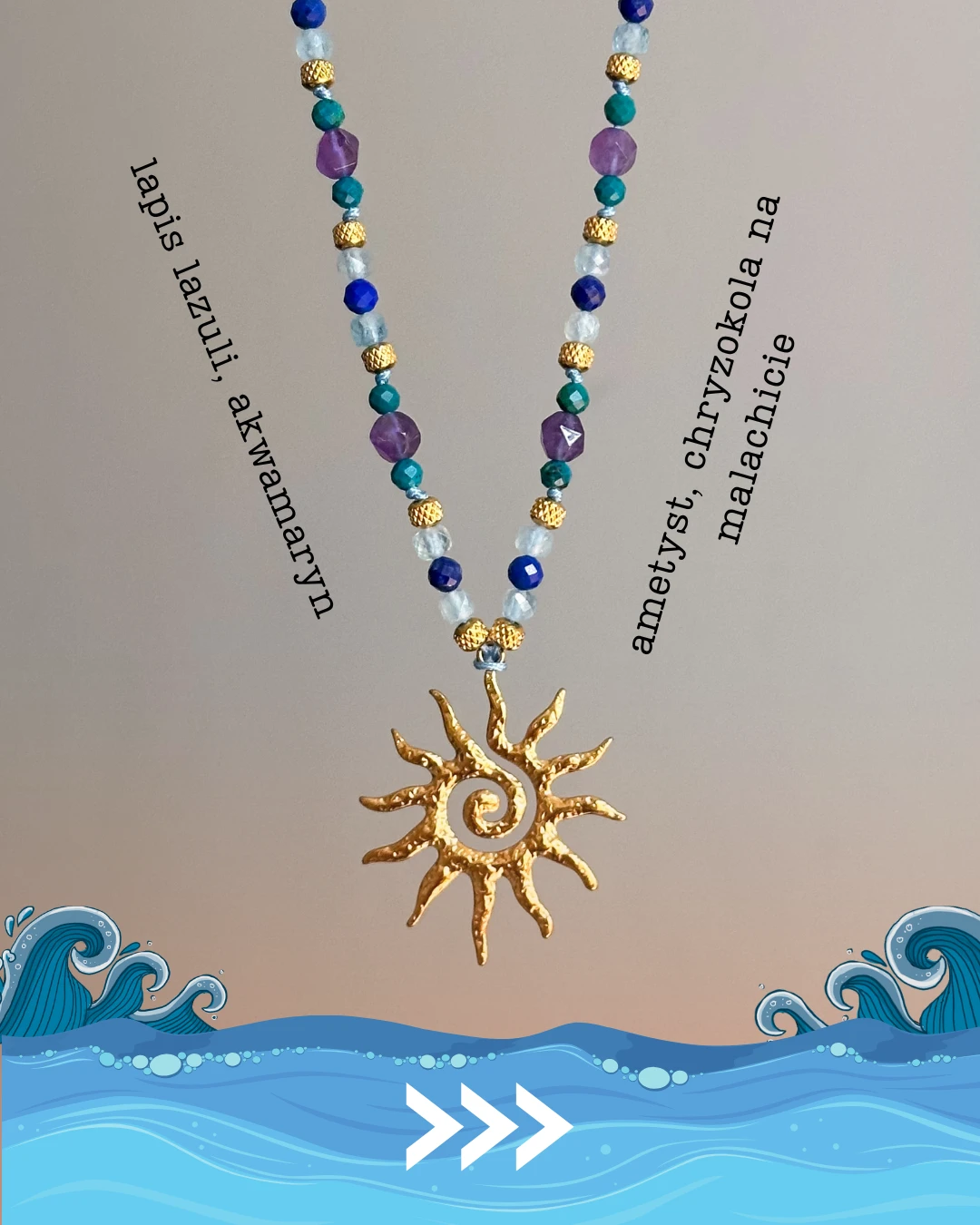 78 Unikat Szept Morza V naszyjnik z spiralnym słońcem akwamaryn, lapis lazuli, ametyst, chryzokola na malachicie
