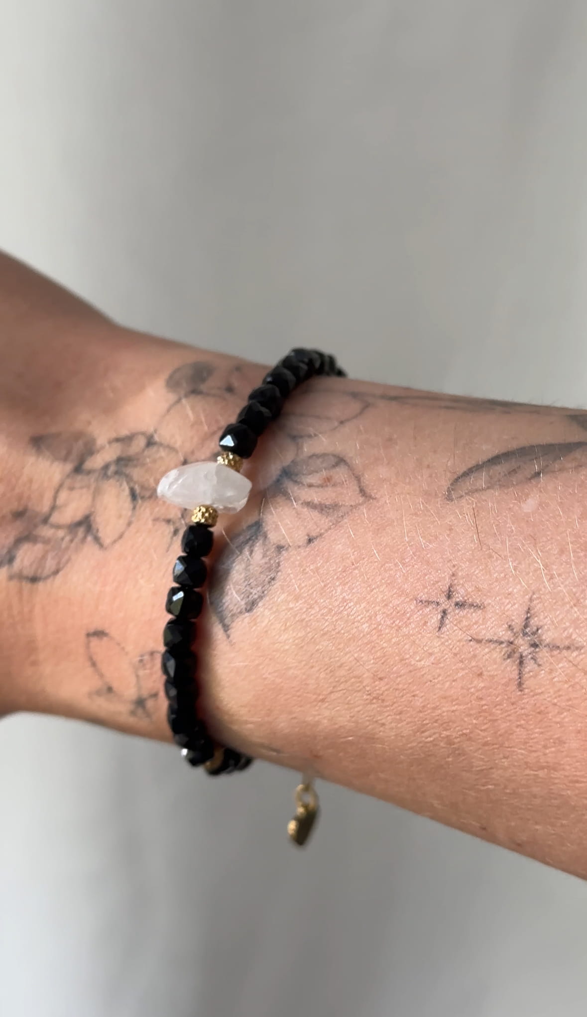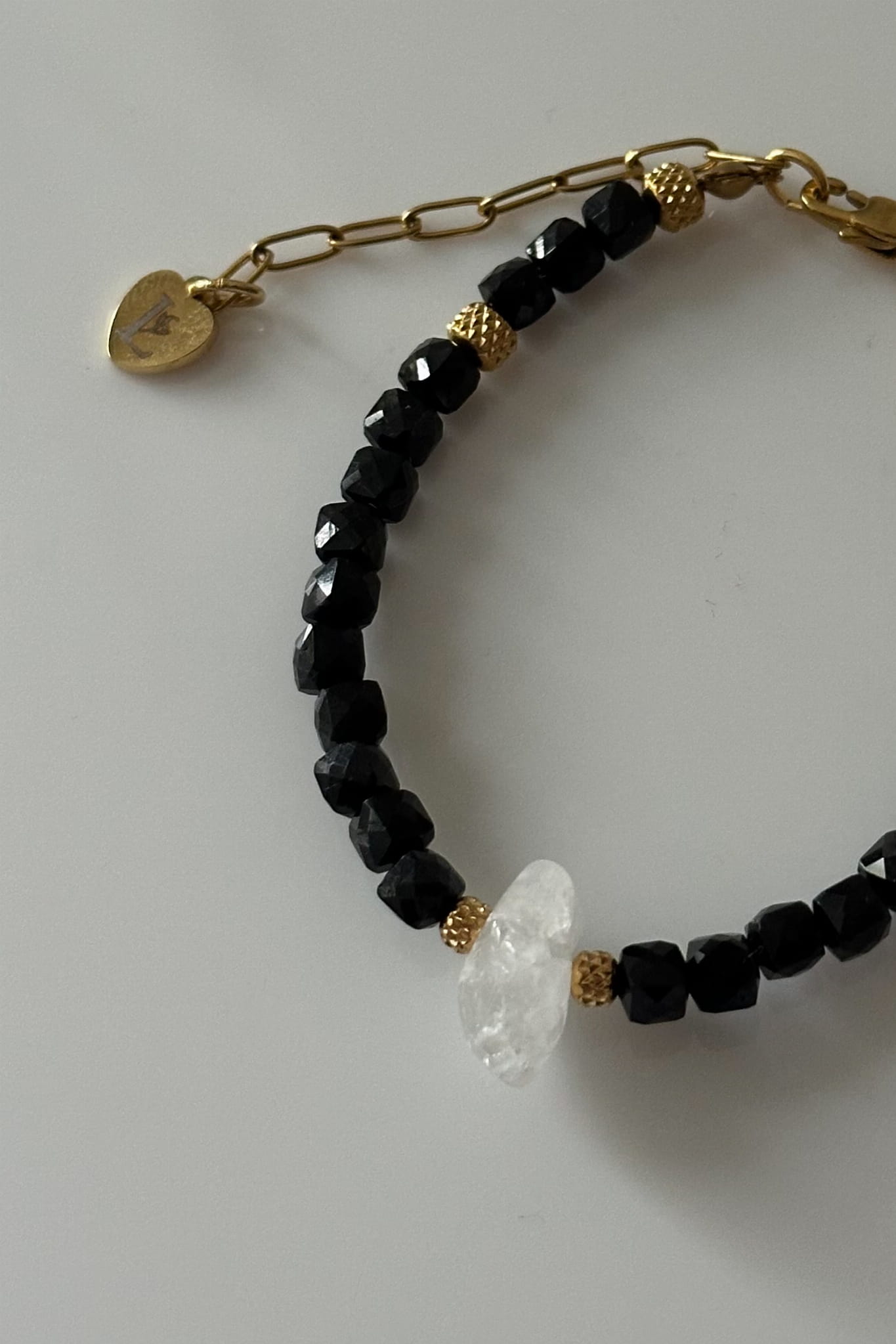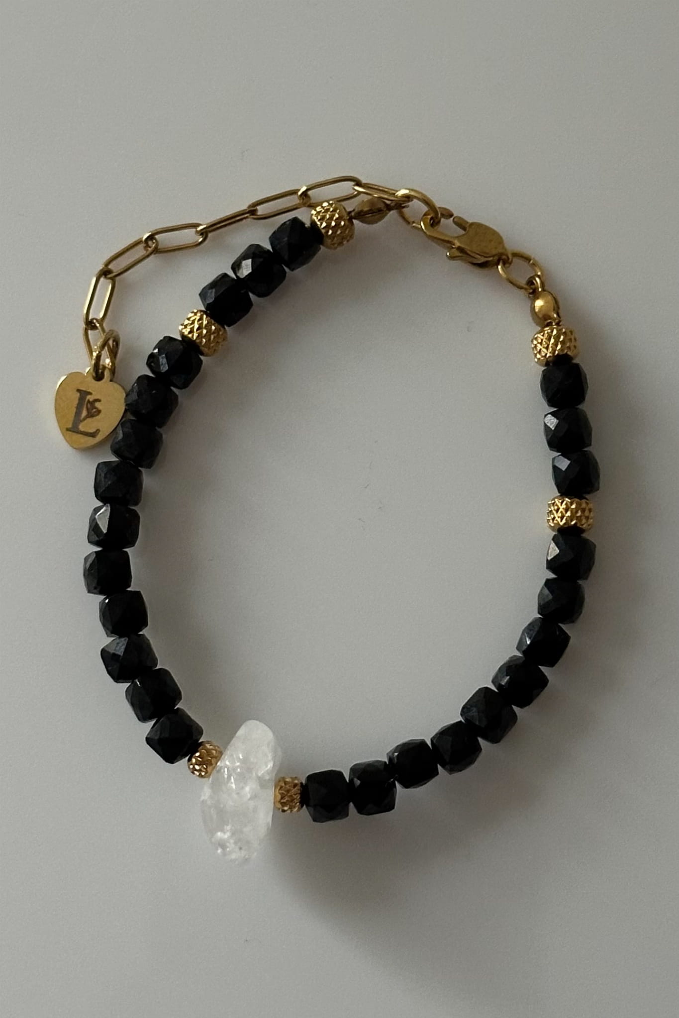 Dla tych, które wiedzą, że siła tkwi w spokoju. Ta bransoletka łączy w sobie kontrast światła i cienia — ochronną moc czarnego turmalinu i klarowność kryształu górskiego. To amulet równowagi, odwagi i wewnętrznego bezpieczeństwa.