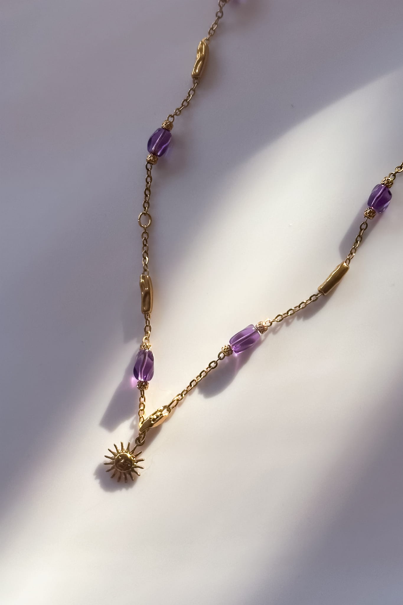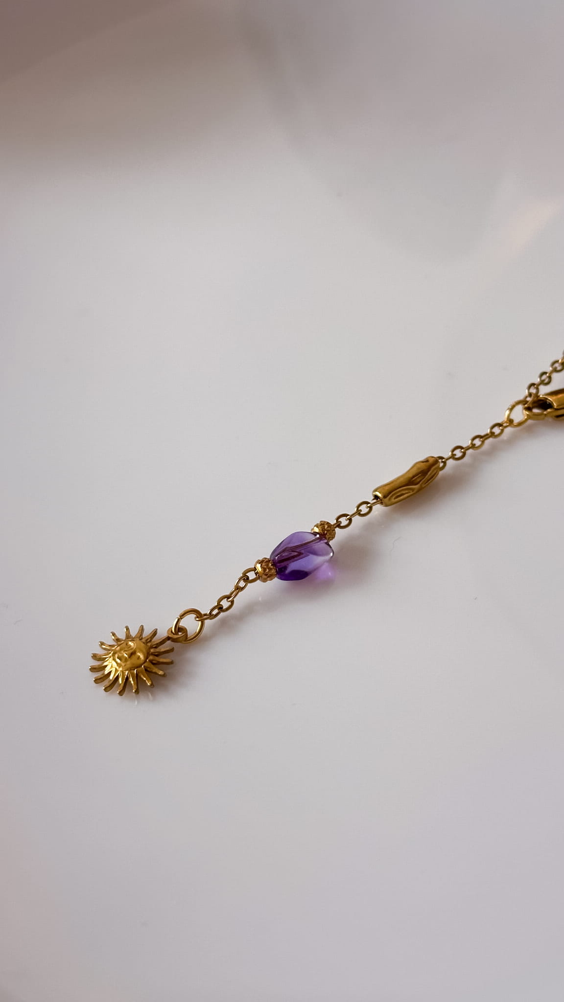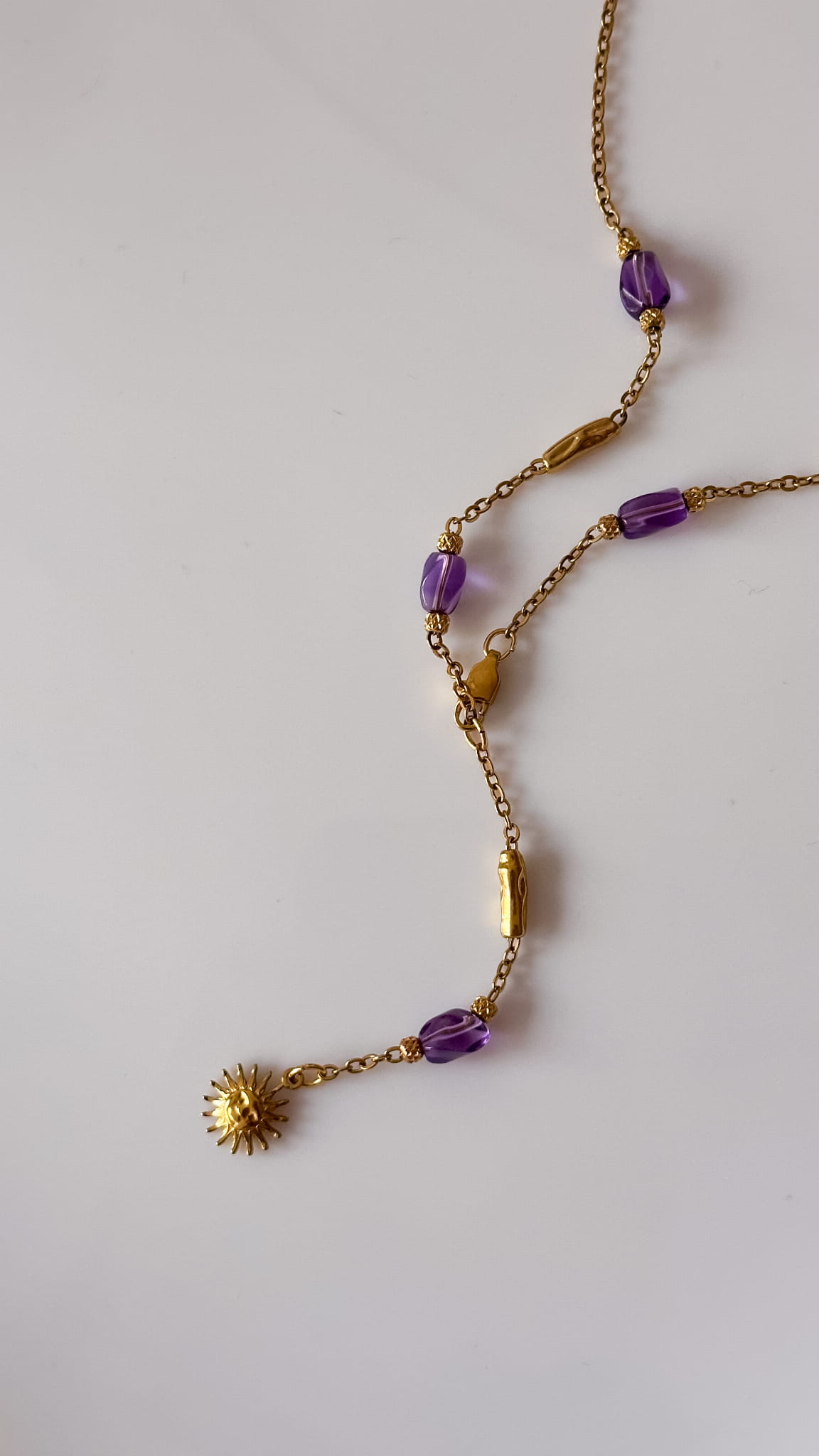 Naszyjnik Calma powstał z myśli o pięknie, które nie krzyczy. O kobiecie, która nie musi niczego udowadniać, bo jej siła wynika z wewnętrznej harmonii. To biżuteria subtelna, ale pełna znaczenia. Delikatny łańcuszek ze stali szlachetnej przeplatają ametysty w odcieniu głębokiego fioletu. Na końcu krawatki pojawia się symboliczne słońce, jak małe przypomnienie, że spokój również potrafi świecić.