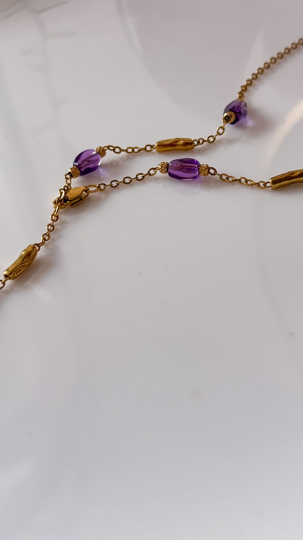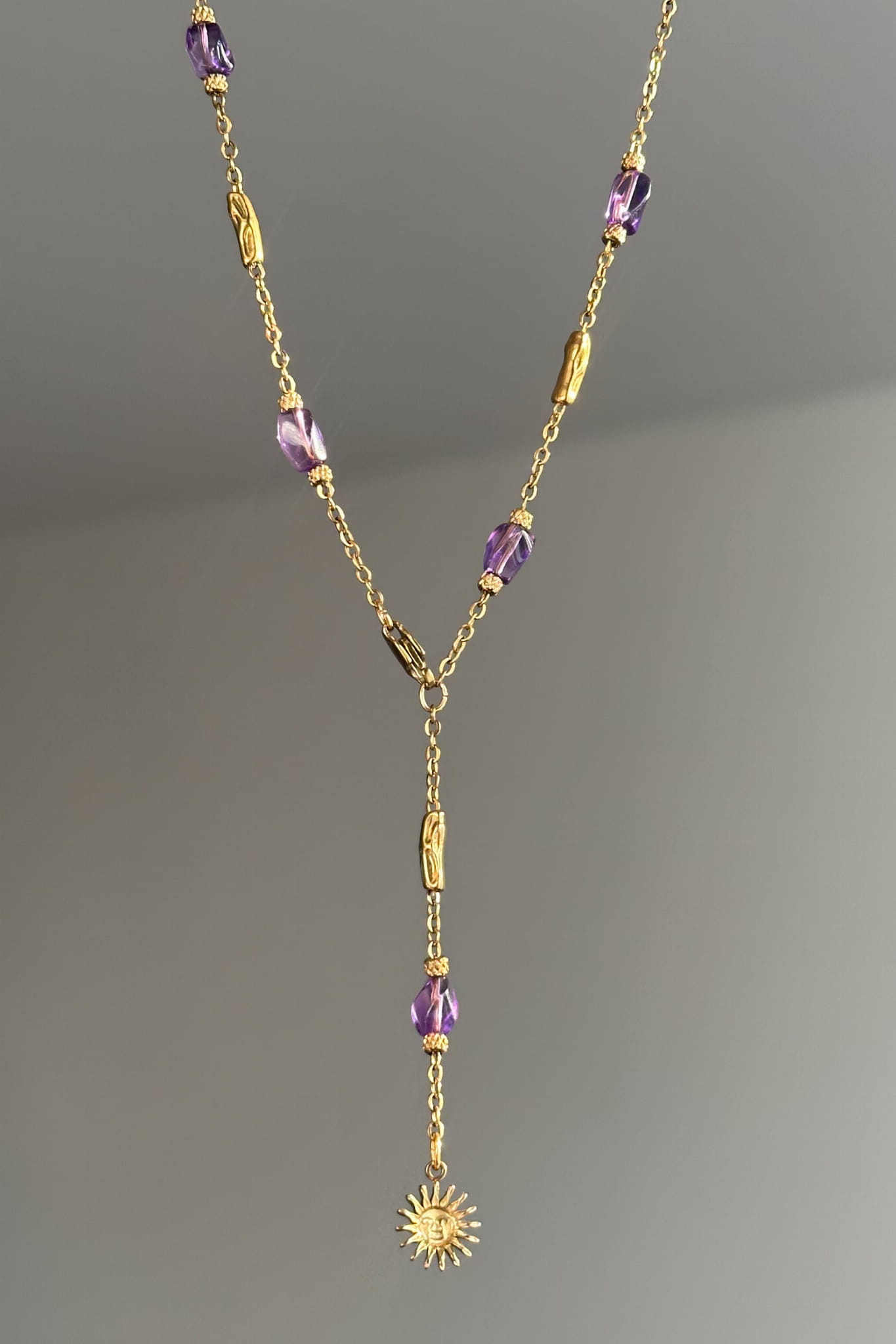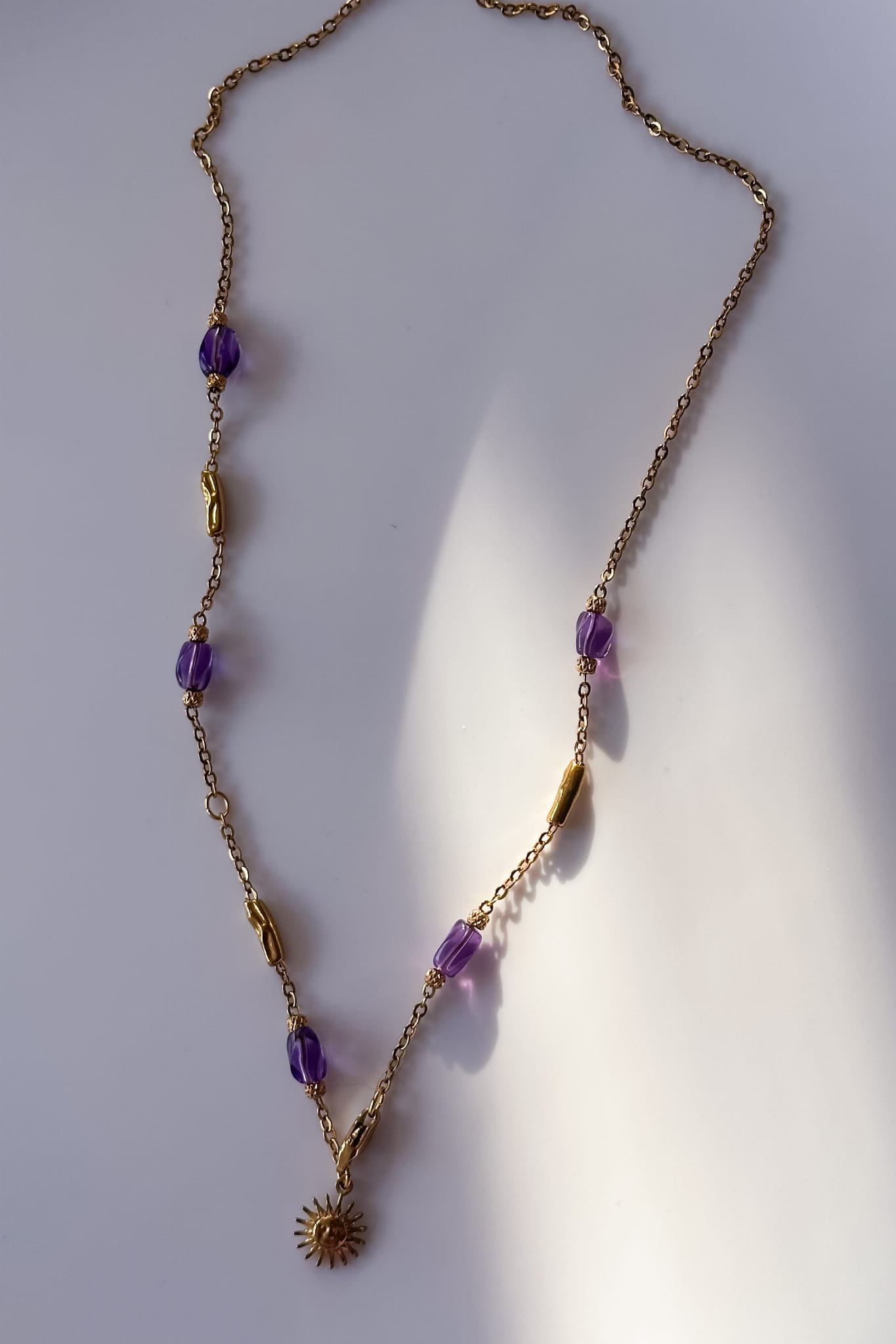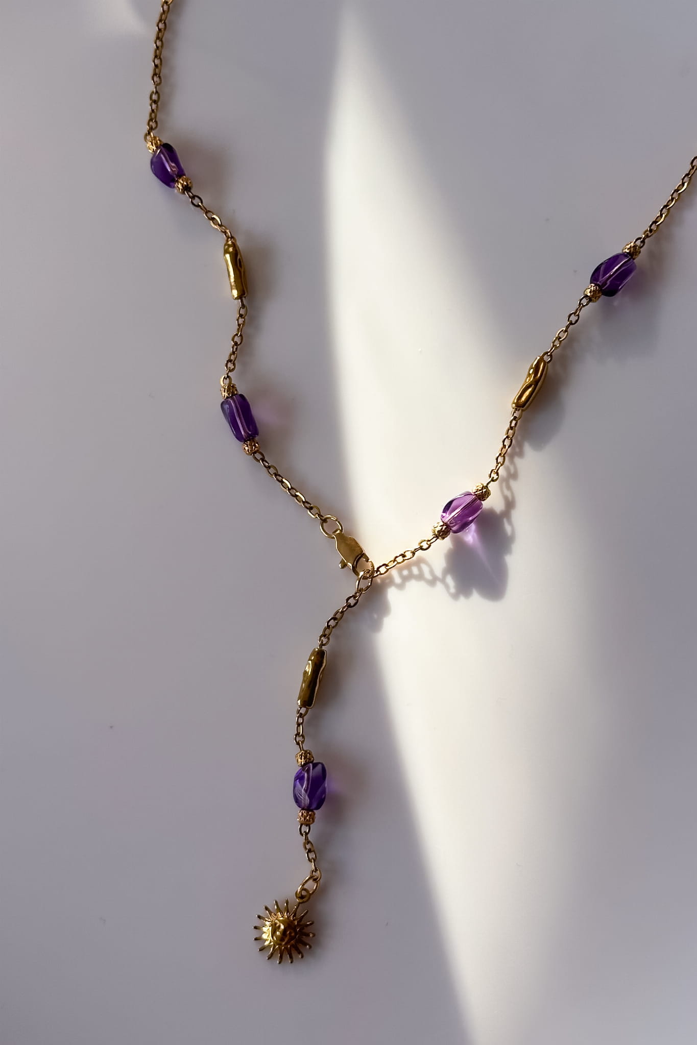 Naszyjnik Calma powstał z myśli o pięknie, które nie krzyczy. O kobiecie, która nie musi niczego udowadniać, bo jej siła wynika z wewnętrznej harmonii. To biżuteria subtelna, ale pełna znaczenia. Delikatny łańcuszek ze stali szlachetnej przeplatają ametysty w odcieniu głębokiego fioletu. Na końcu krawatki pojawia się symboliczne słońce, jak małe przypomnienie, że spokój również potrafi świecić.