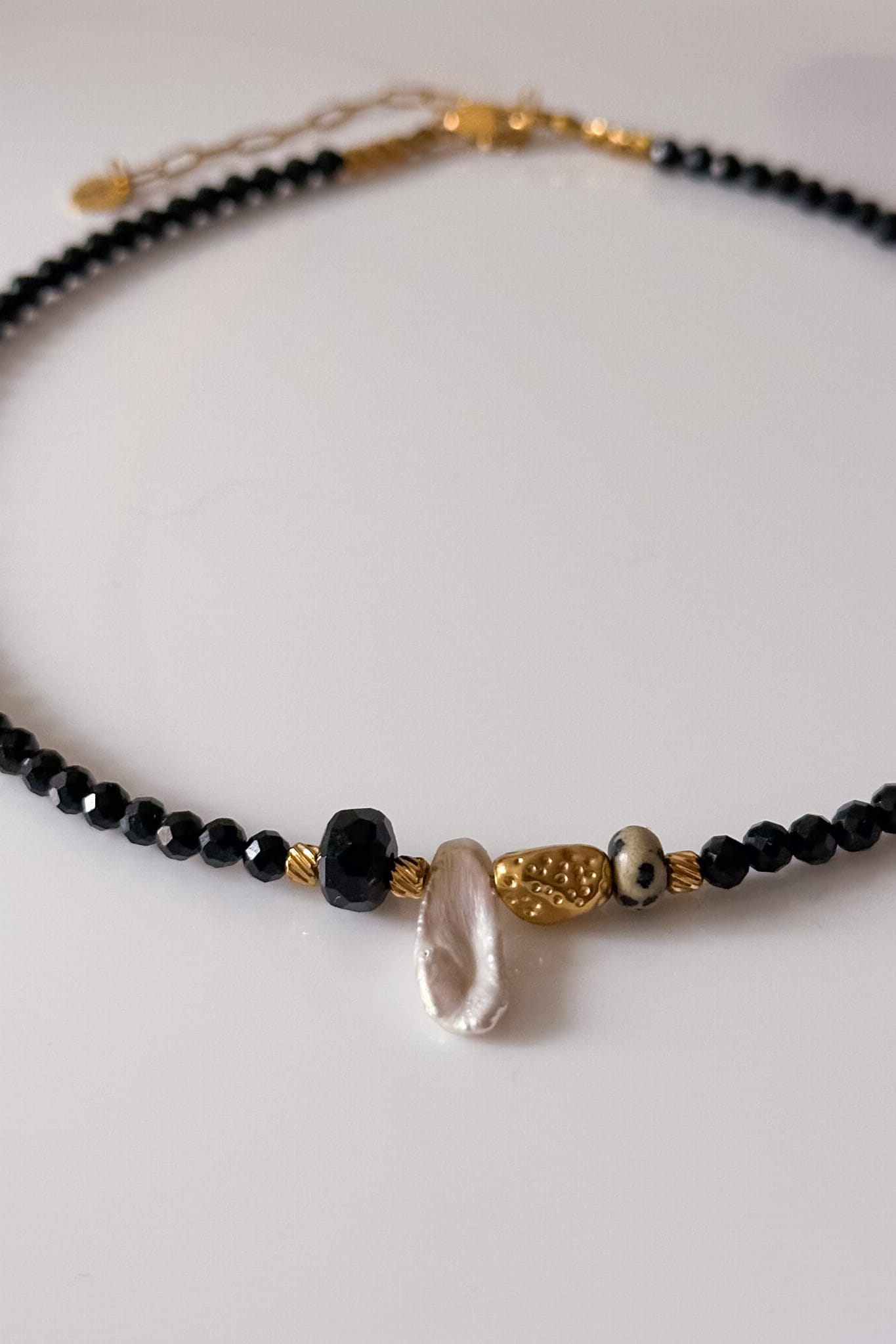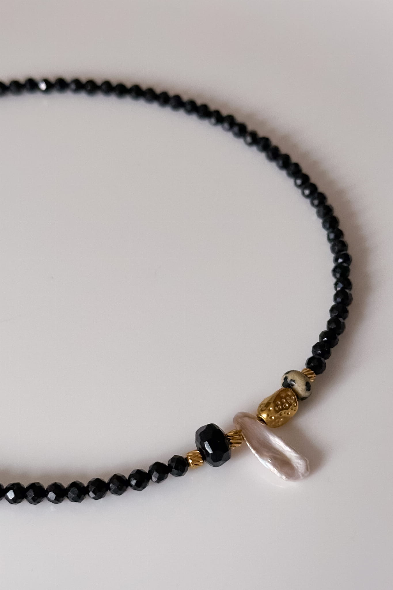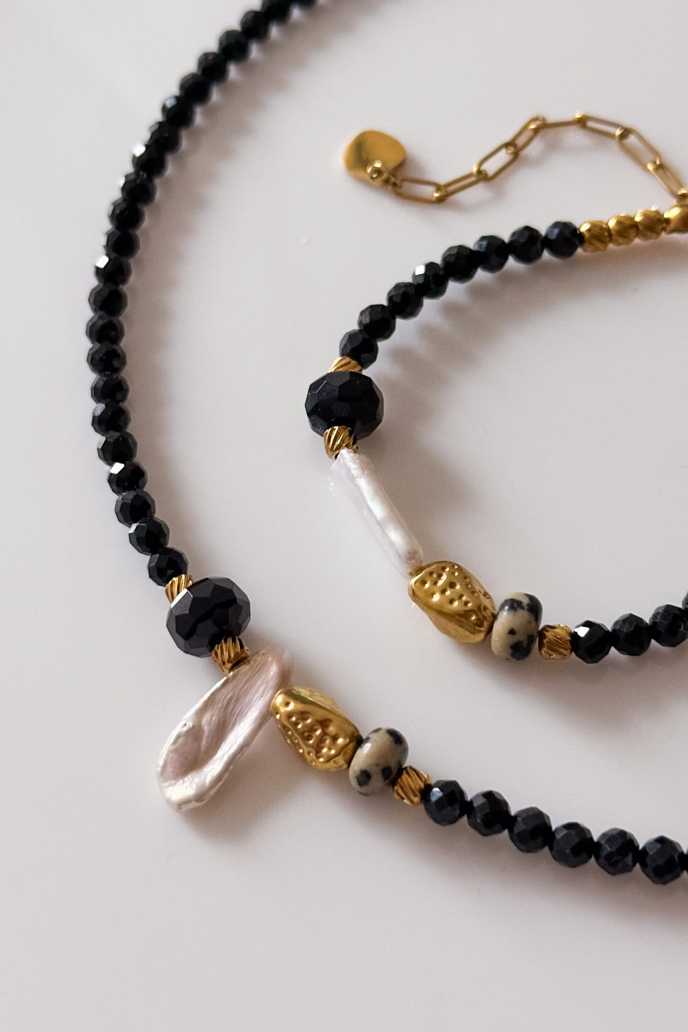 DALIA – komplet z czarnego turmalinu, jaspisu dalmatyńskiego i perły naszyjnik i bransoletka