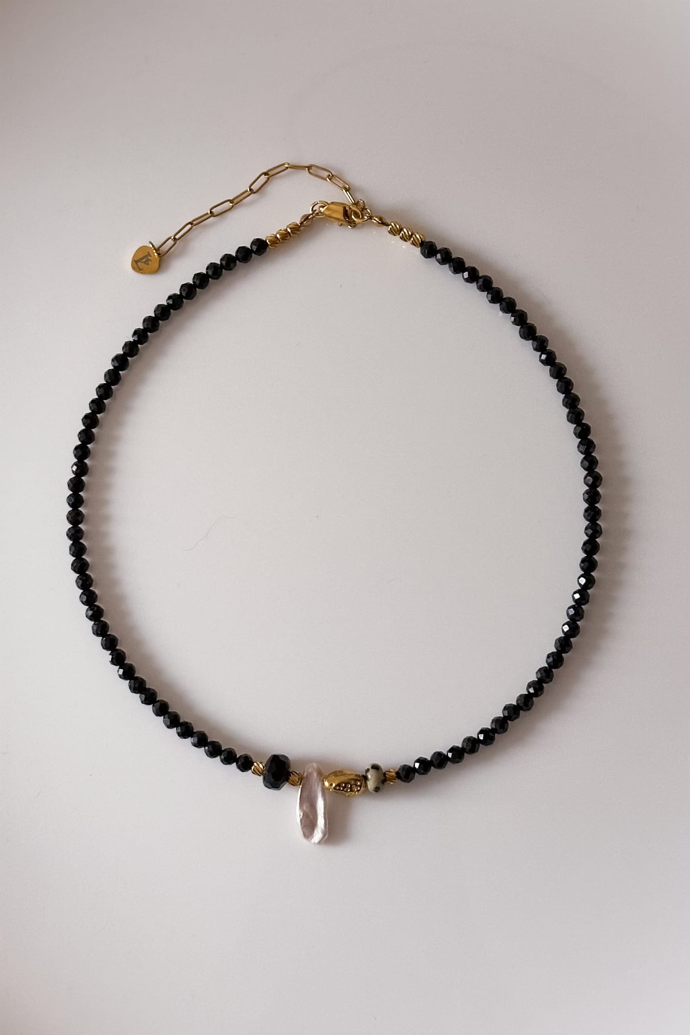 Komplet Dalia to połączenie czarnego turmalinu, jaspisu dalmatyńskiego i naturalnej perły w eleganckiej, subtelnej formie. Zestaw składa się z naszyjnika o długości 38,5–46 cm i bransoletki 15,5–20 cm, wykonanych ze stali szlachetnej i naturalnych kamieni. To delikatny, codzienny amulet, który łączy minimalizm z charakterem.