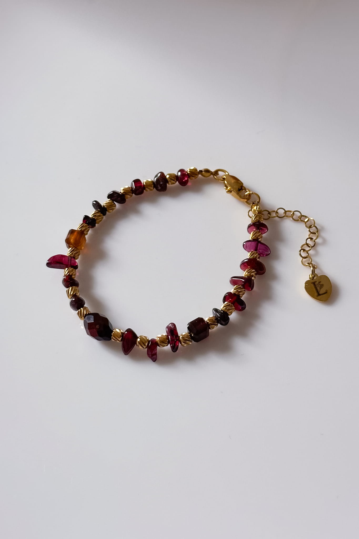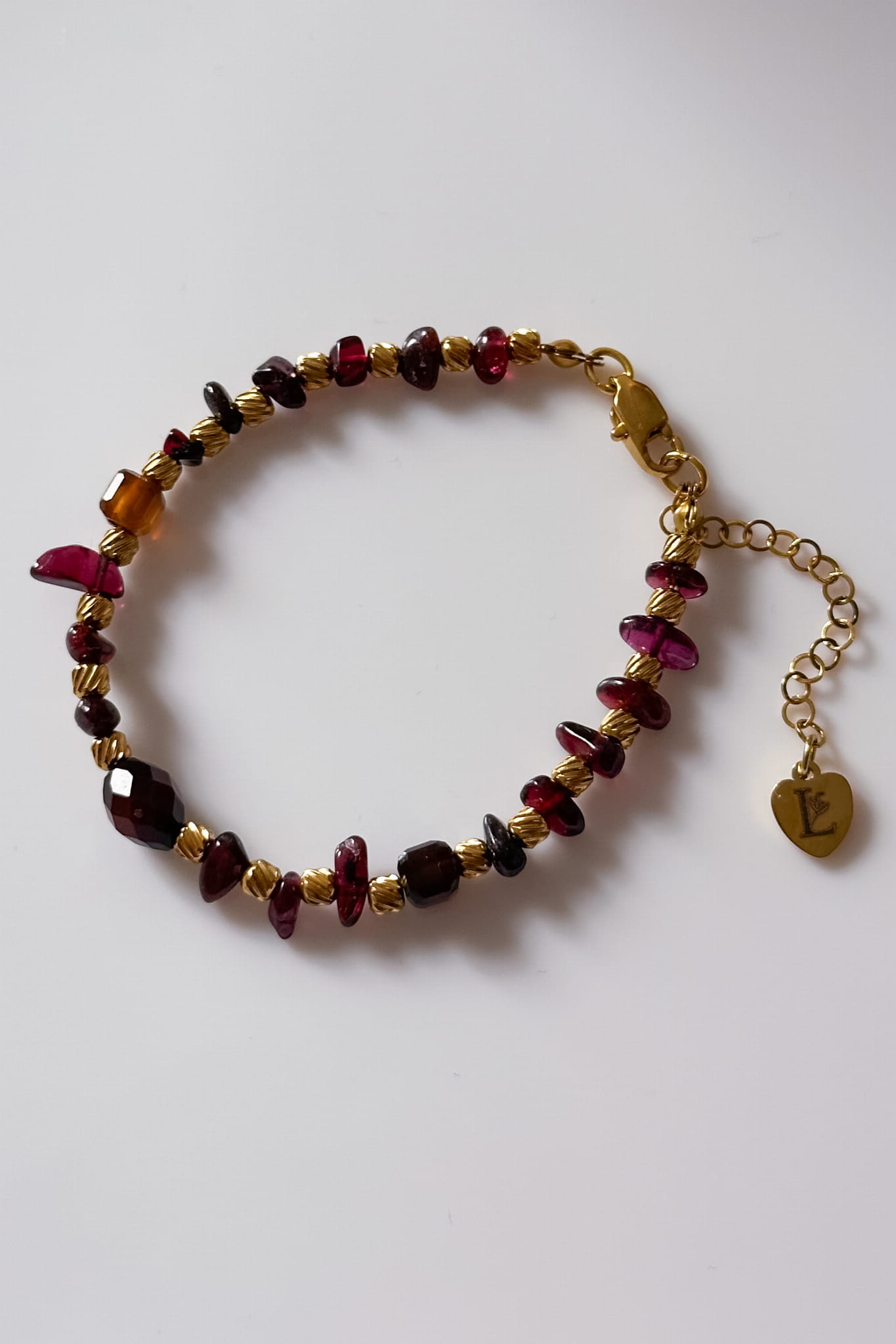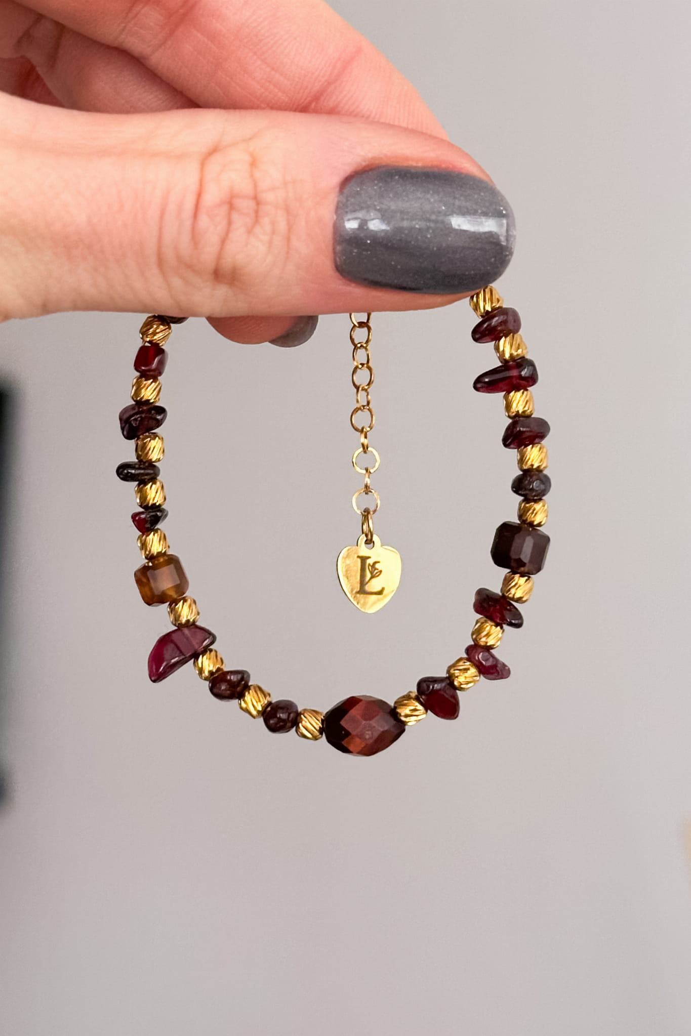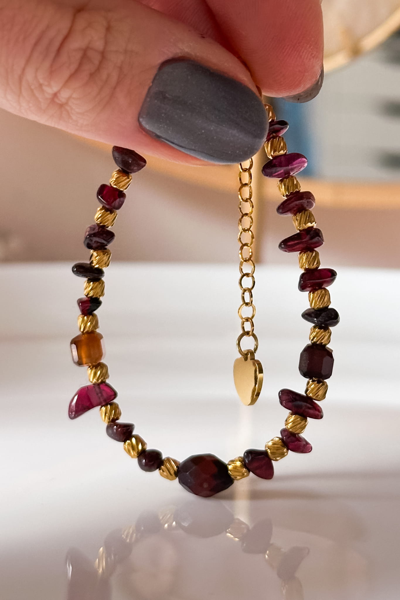 Ciepła, zmysłowa i pełna energii jesieni — ta bransoletka to połączenie barw ziemi i ognia. Mieni się złotymi refleksami tygrysiego oka, głębokim bordo granatu i ciepłem agatu. Każdy kamień niesie w sobie inną siłę, a razem tworzą talizman odwagi, stabilności i wewnętrznej mocy.