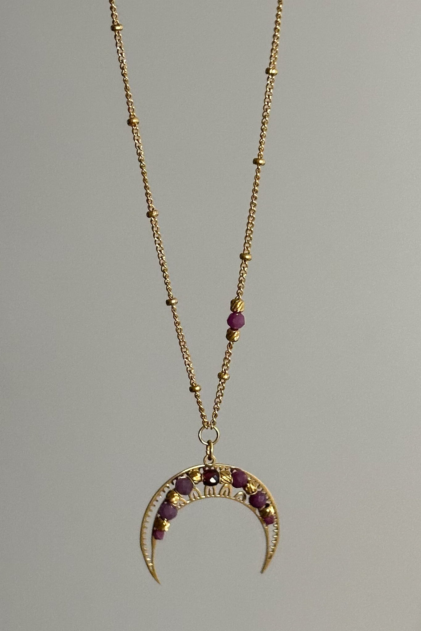 Lunula Ognia i Pasji Naszyjnik z księżycem na łańcuszku z kamieniami rubin i granat