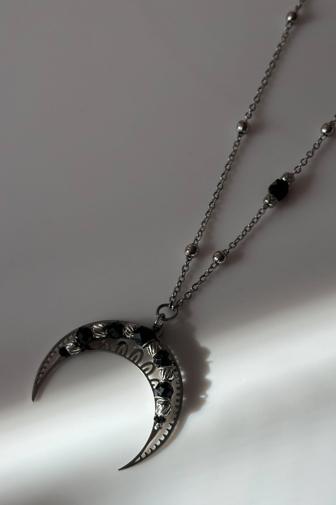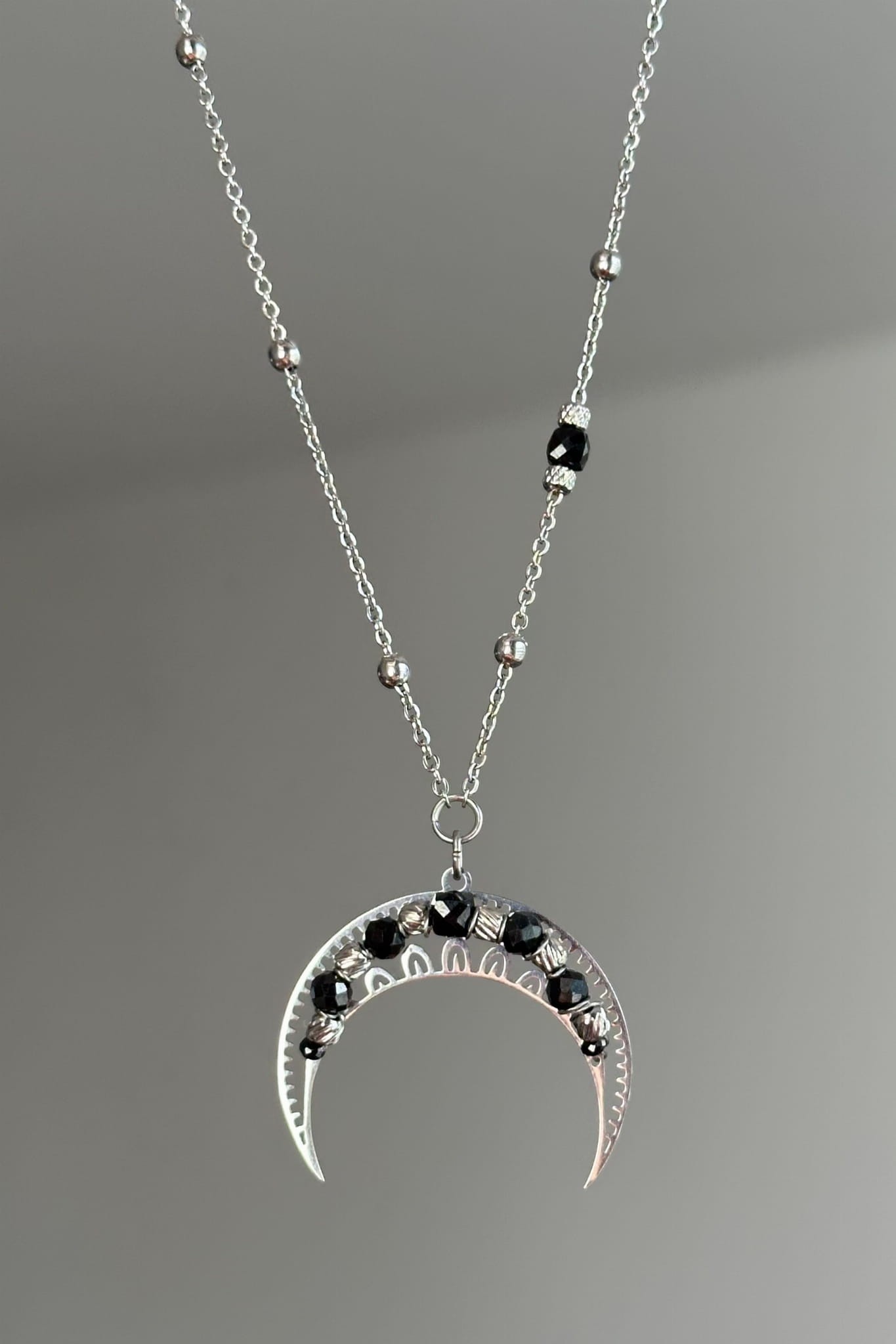 Srebrna lunula z czarnym turmalinem to symbol spokoju, granic i powrotu do siebie.