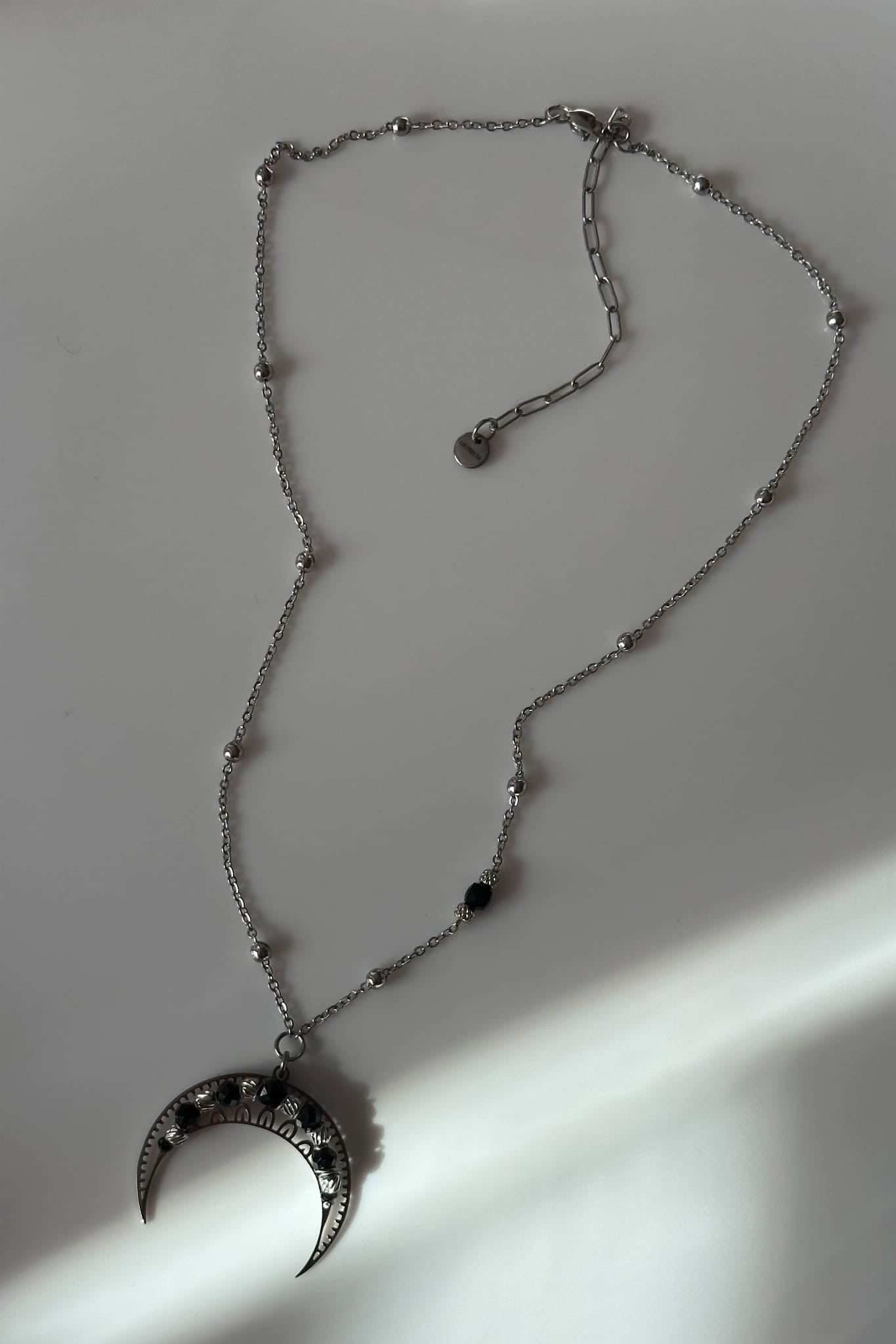 Lunula ochrony na łańcuszku z czarnym turmalinem w oprawie w kolorze srebrnym