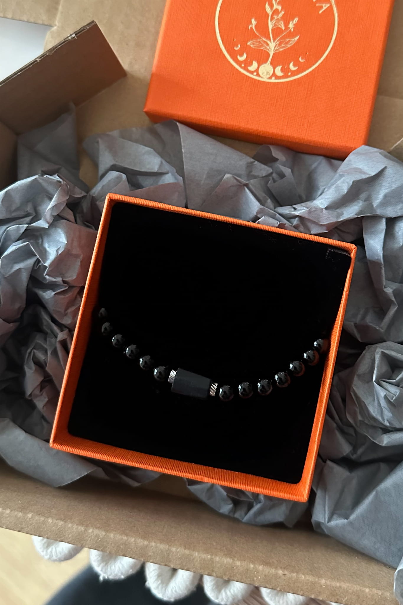 Minimalistyczna i elegancka – wykonana z naturalnego czarnego turmalinu i stali szlachetnej. Symbol ochrony i spokoju, dla mężczyzny, który ceni siłę w prostocie.
