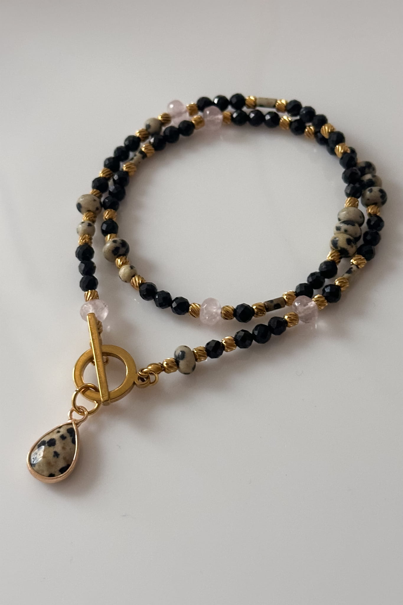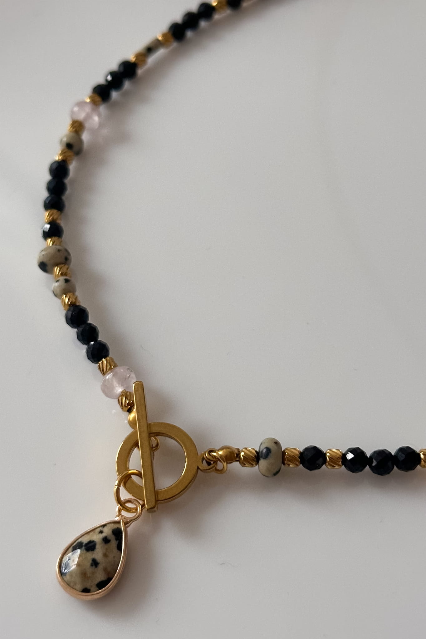 Naszyjnik 40 cm jaspis dalmatyński, czarny turmalin, kwarc różowy